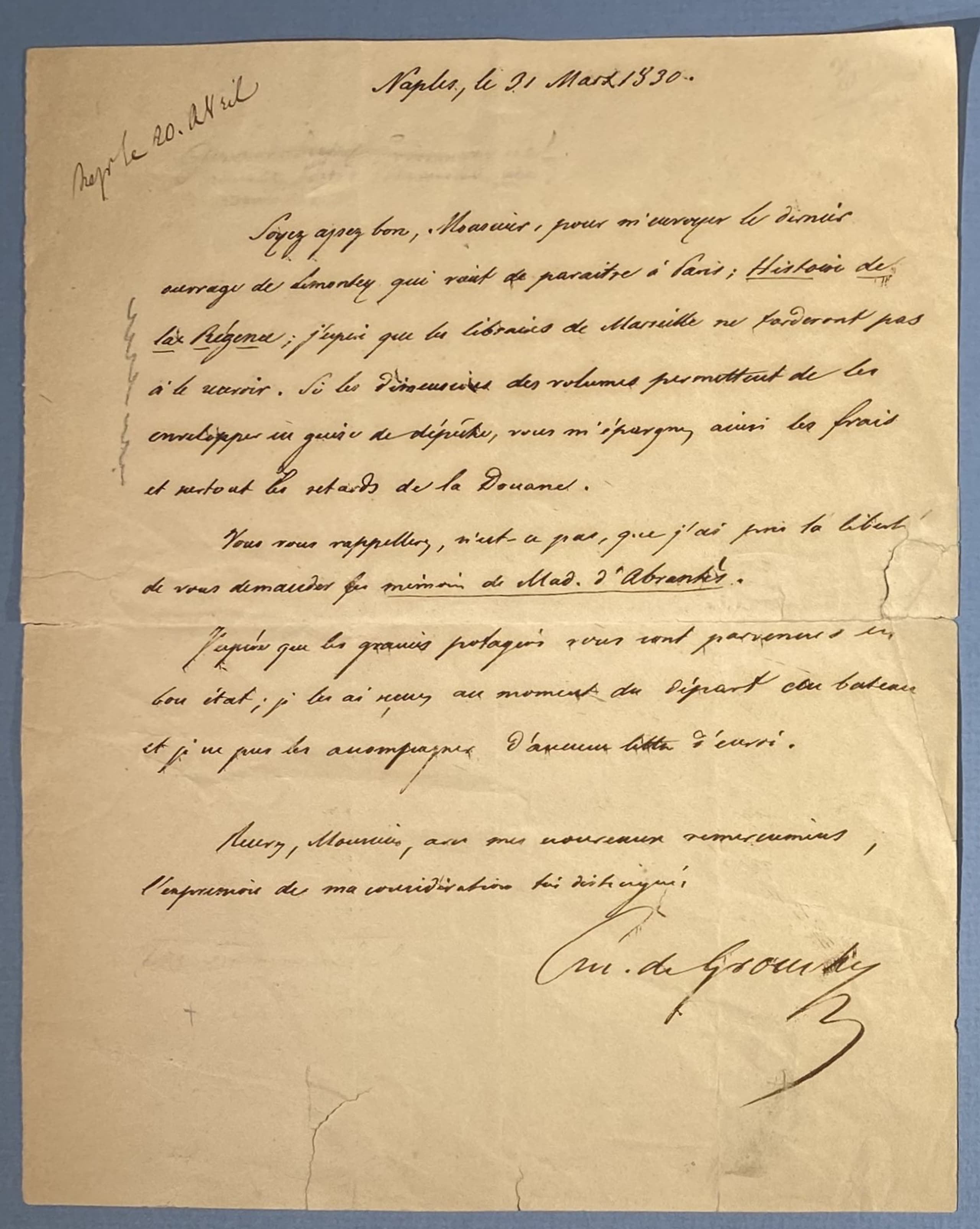He asks to be sent Lemontey's latest work, Histoire de la Régence. He hopes that the bookshops in Marseille will soon receive it. If he could send them as 'dispatches', he would avoid paying customs duties. He reminded him that he had also asked for the Mémoires de Mad. d'Abrantès.