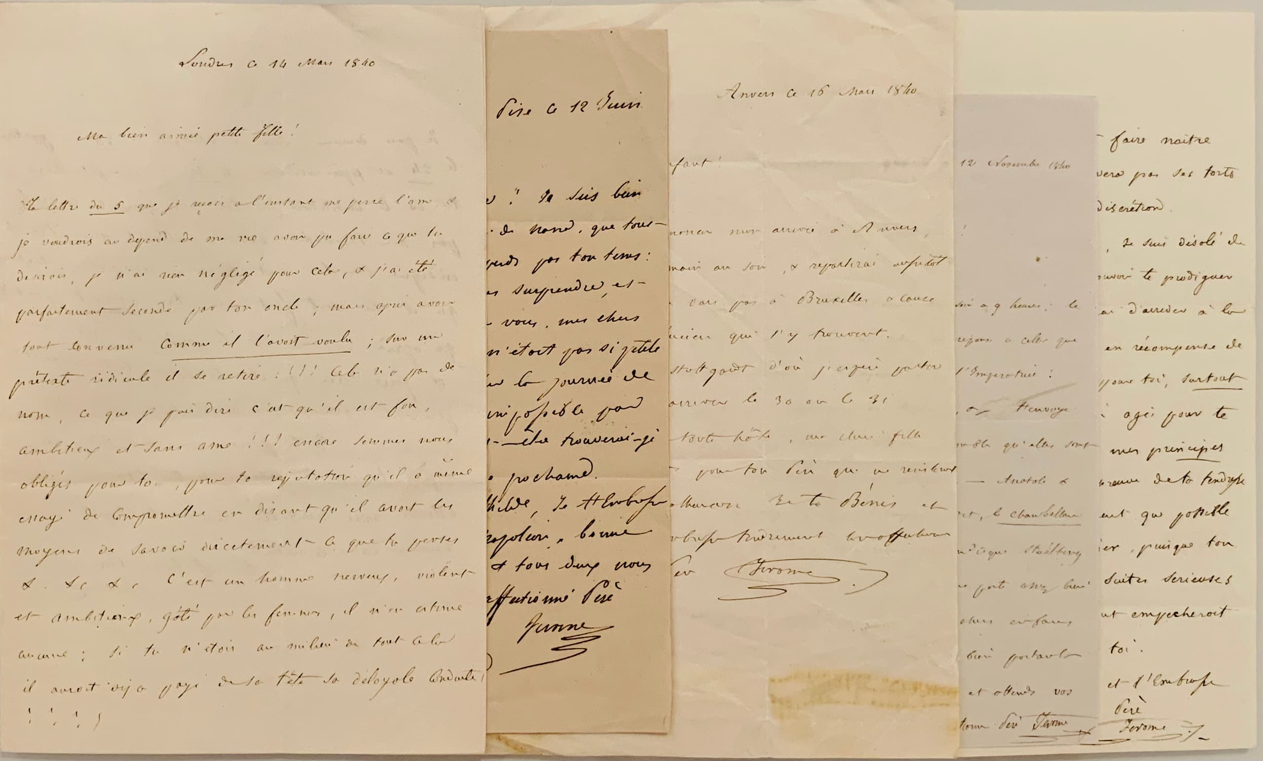 An important and revealing correspondence from Jérôme Bonaparte, the youngest brother of Napoleon I, addressed to his daughter Princess Mathilde. This collection of letters provides valuable insight into the familial negotiations, personal anxieties, and political considerations surrounding the marriage between Mathilde and Prince Anatole Demidov—celebrated in Rome on 1 November 1840. The letters were written from London, Antwerp, and the Baths of Pisa.