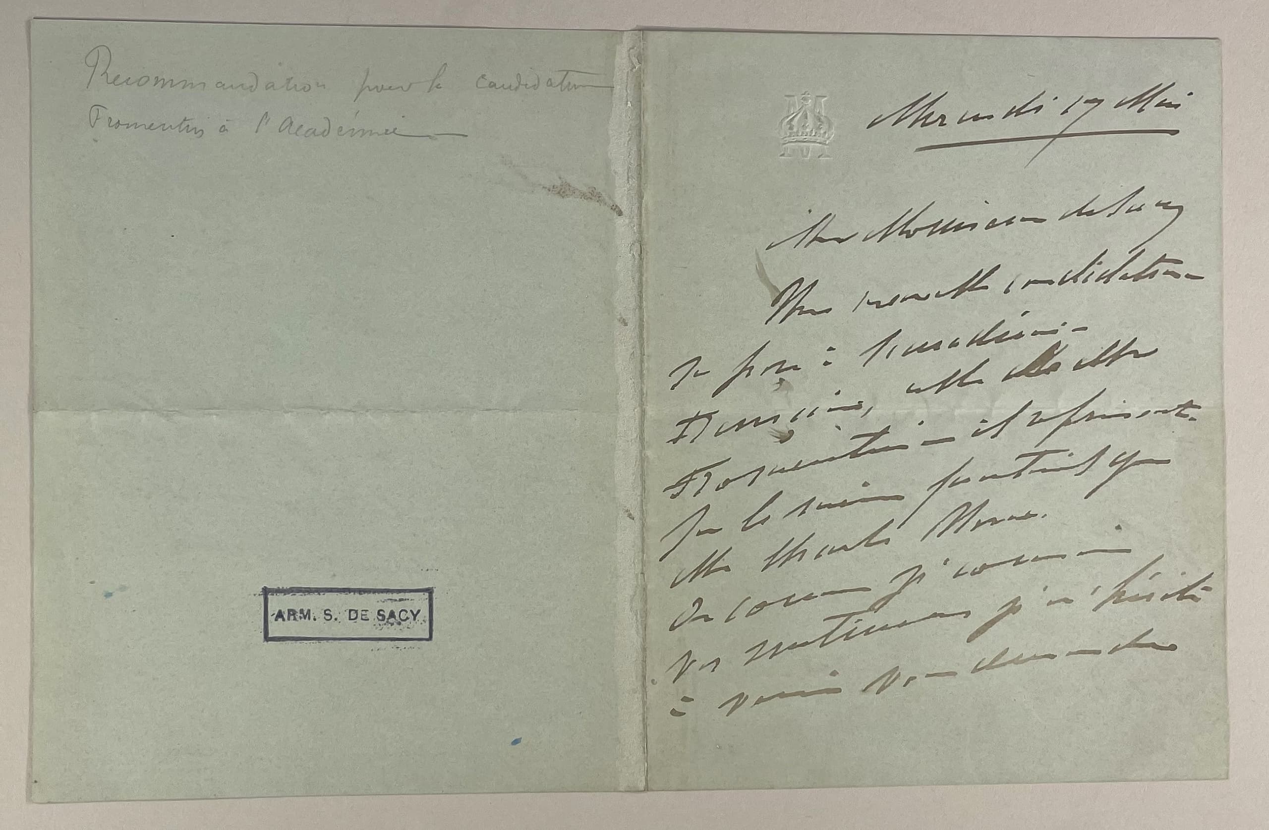 3 pages in-12, double sheet, on blue paper, dry stamp monogram M with a crown, stamp 'ARM. S. DE SACY' on verso of 3rd page.