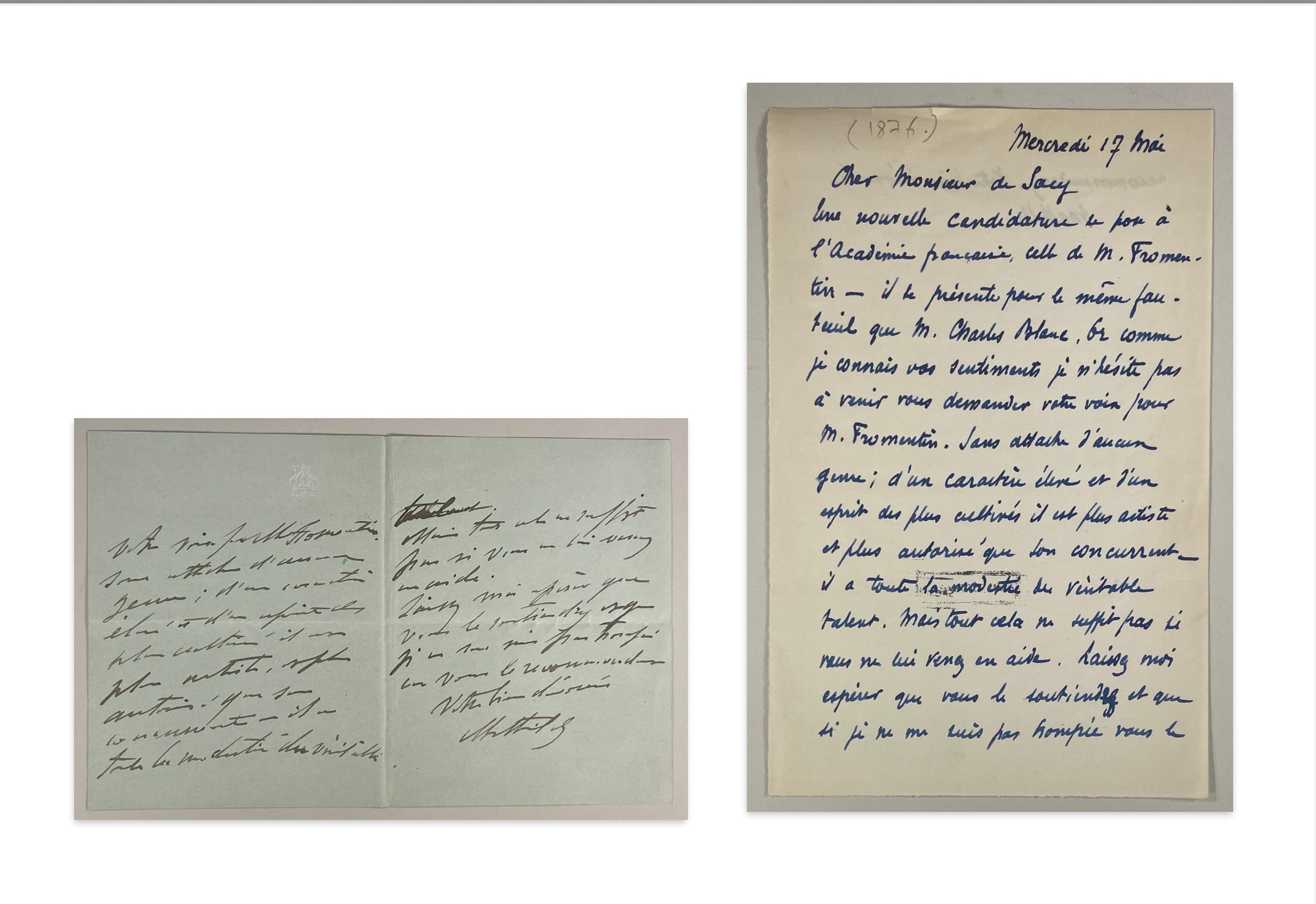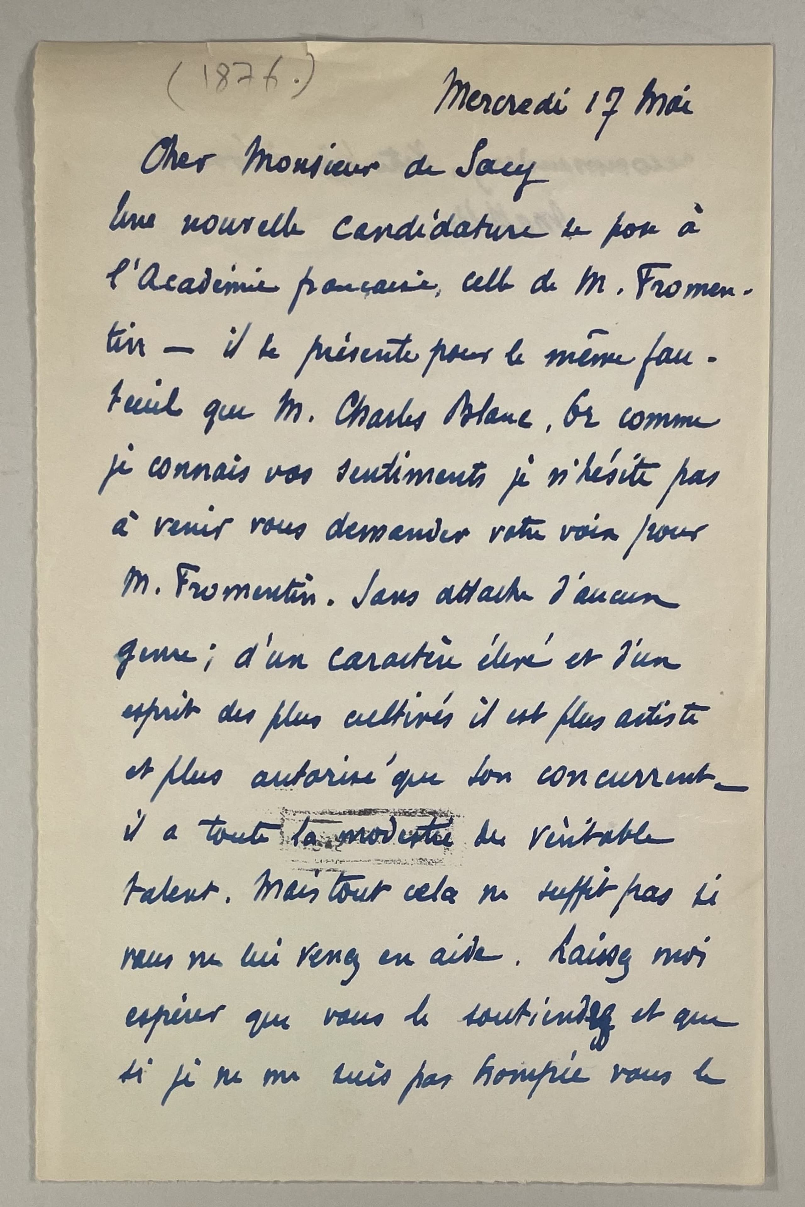 A vigorous letter of support for Eugène Fromentin's candidacy for the Académie, who was running 'for the same seat as M. Charles Blanc'... 'With no attachments of any kind, of an elevated character and the most cultivated mind, he is more artistic and more authoritative than his competitor'... but he needed her help and she hoped he would support him.