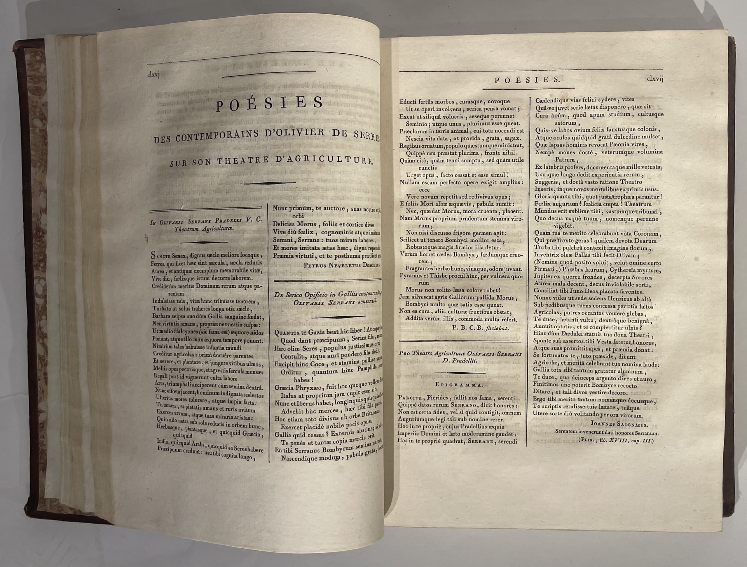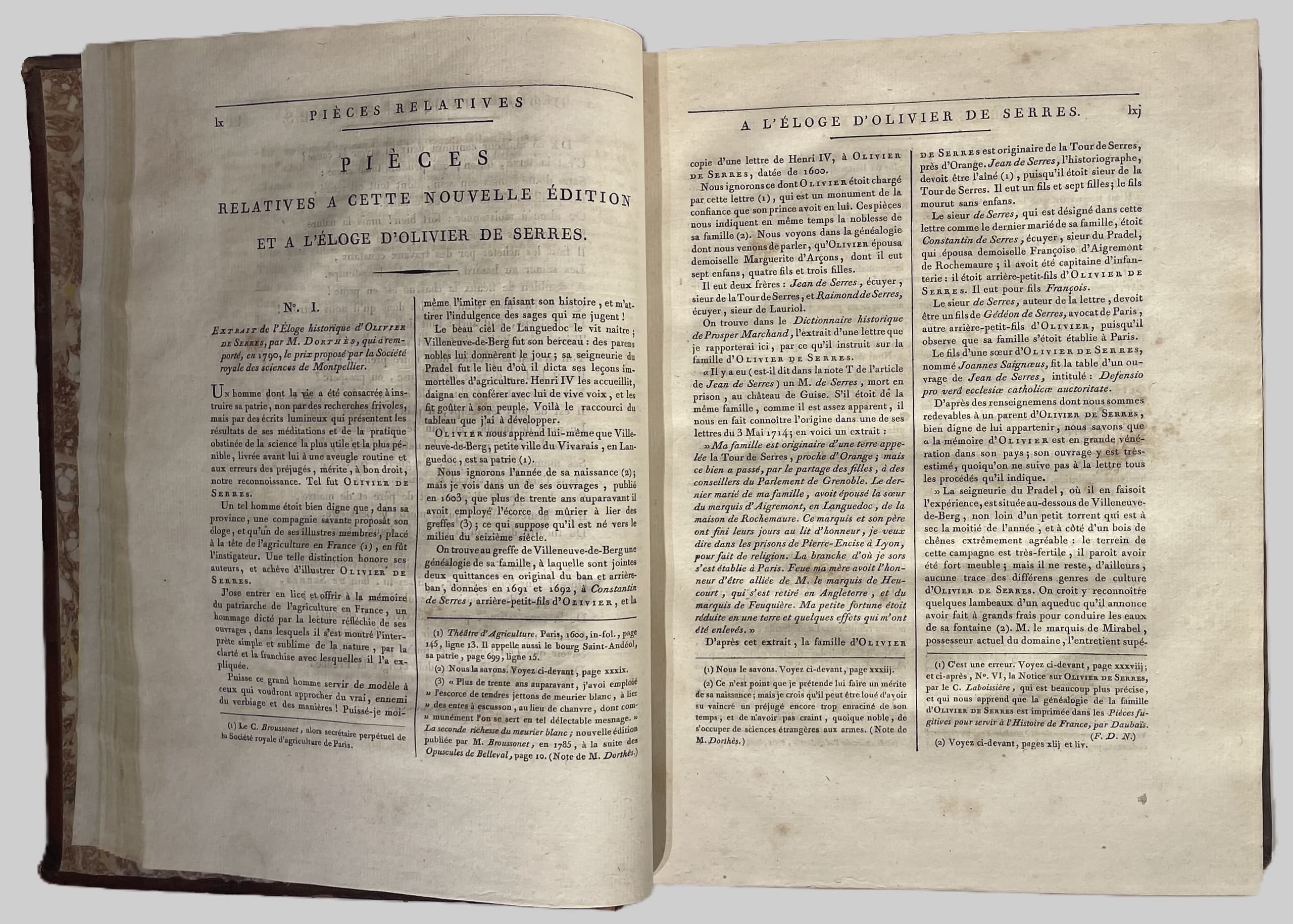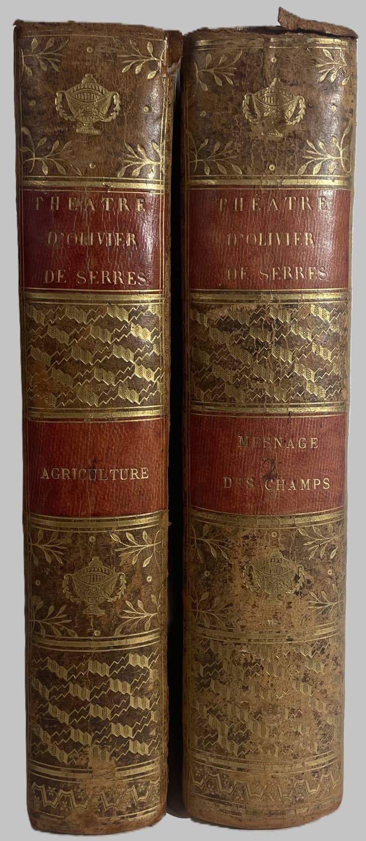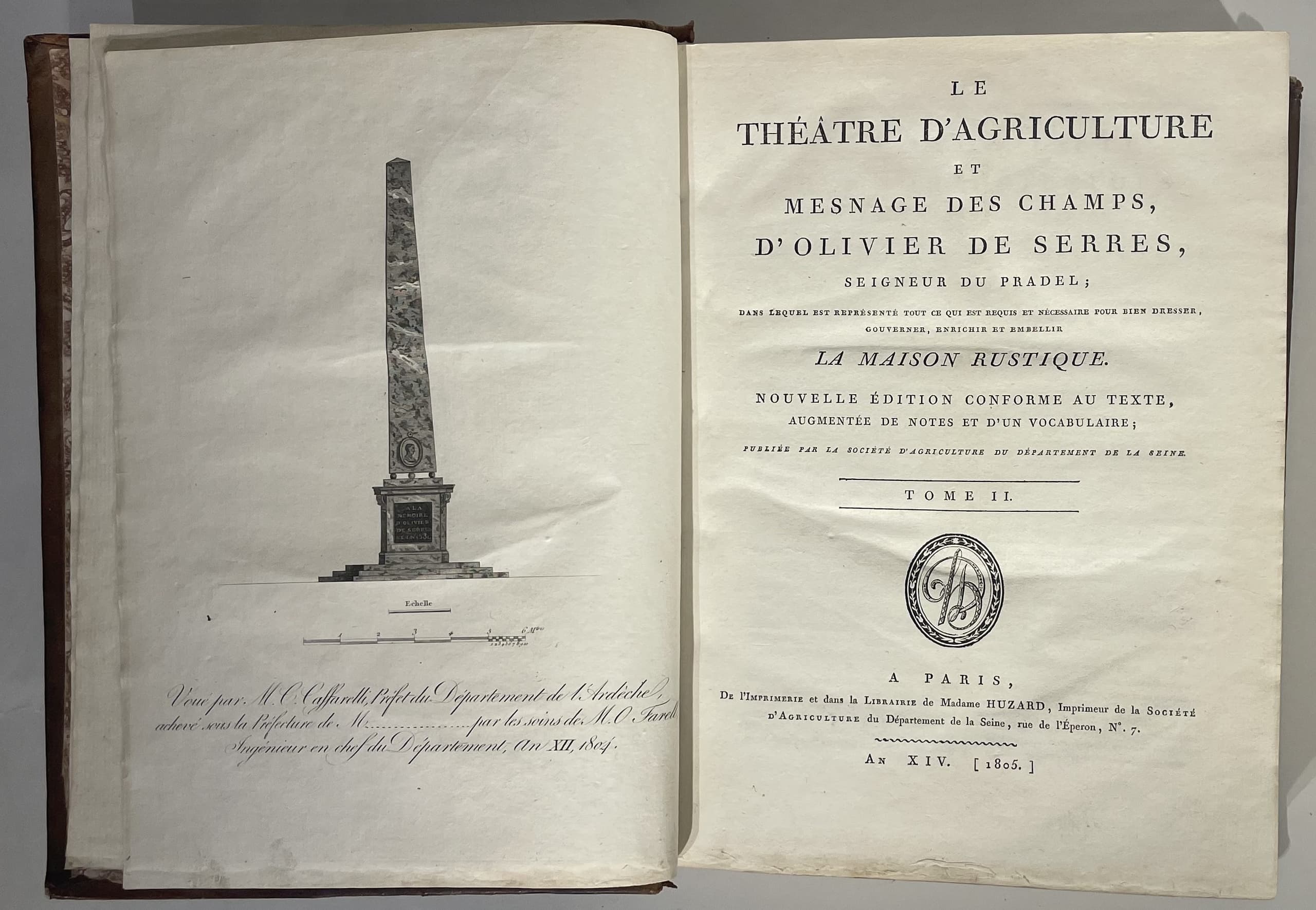 OLIVIER DE SERRES (1539-1619) LE THÉÂTRE D’AGRICULTURE ET MESNAGE DES CHAMPS [THE THEATRE OF AGRICULTURE AND FARM MANAGEMENT] 2 VOLUMES. 1804-1805. IN FRENCH.