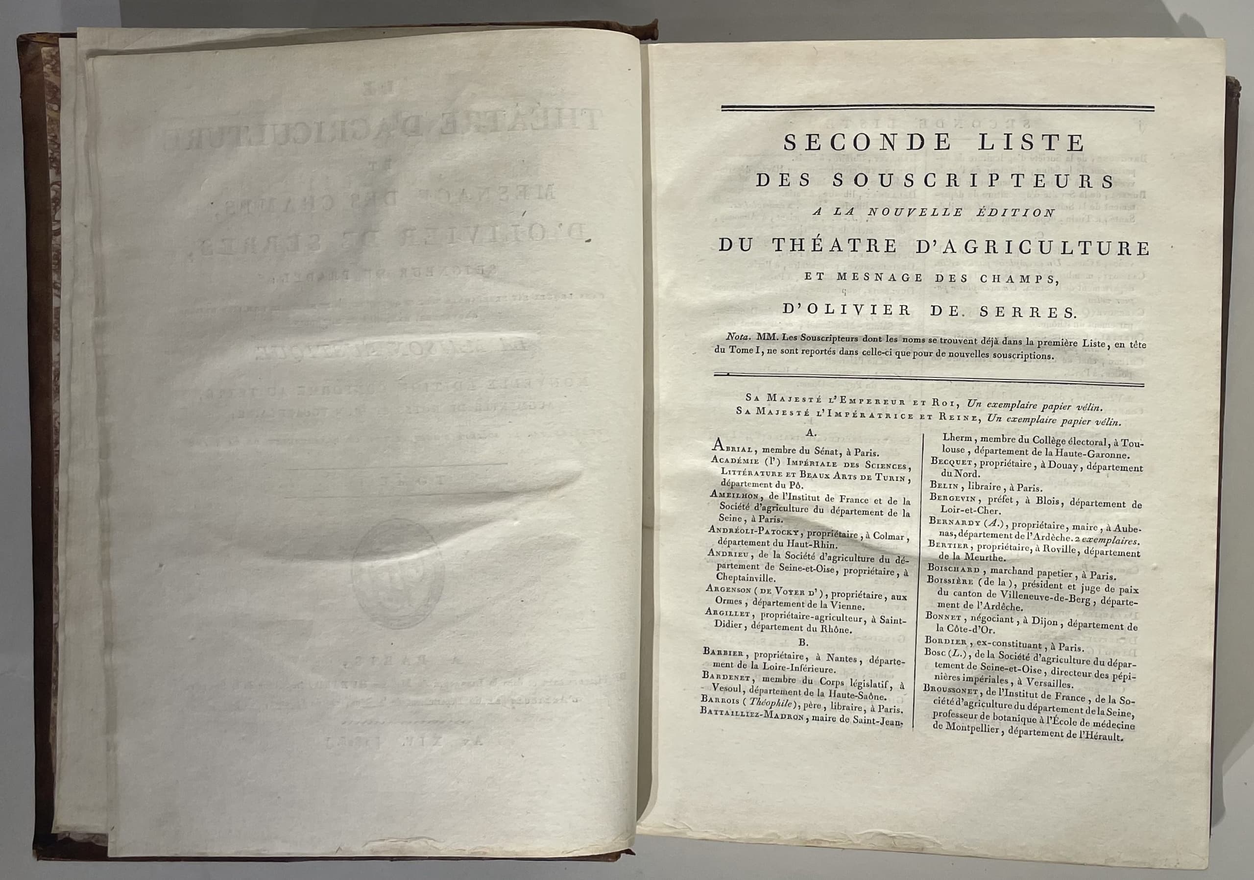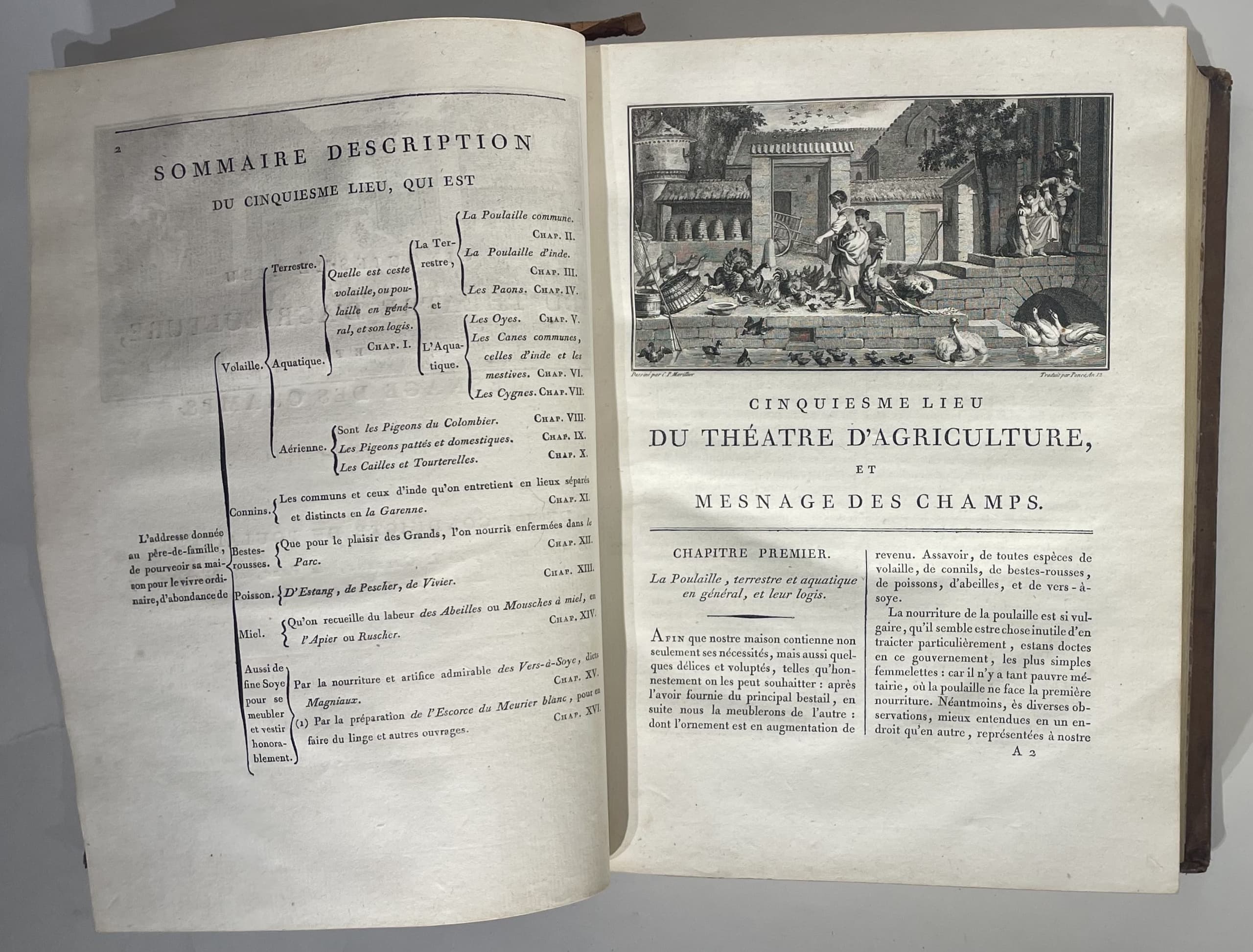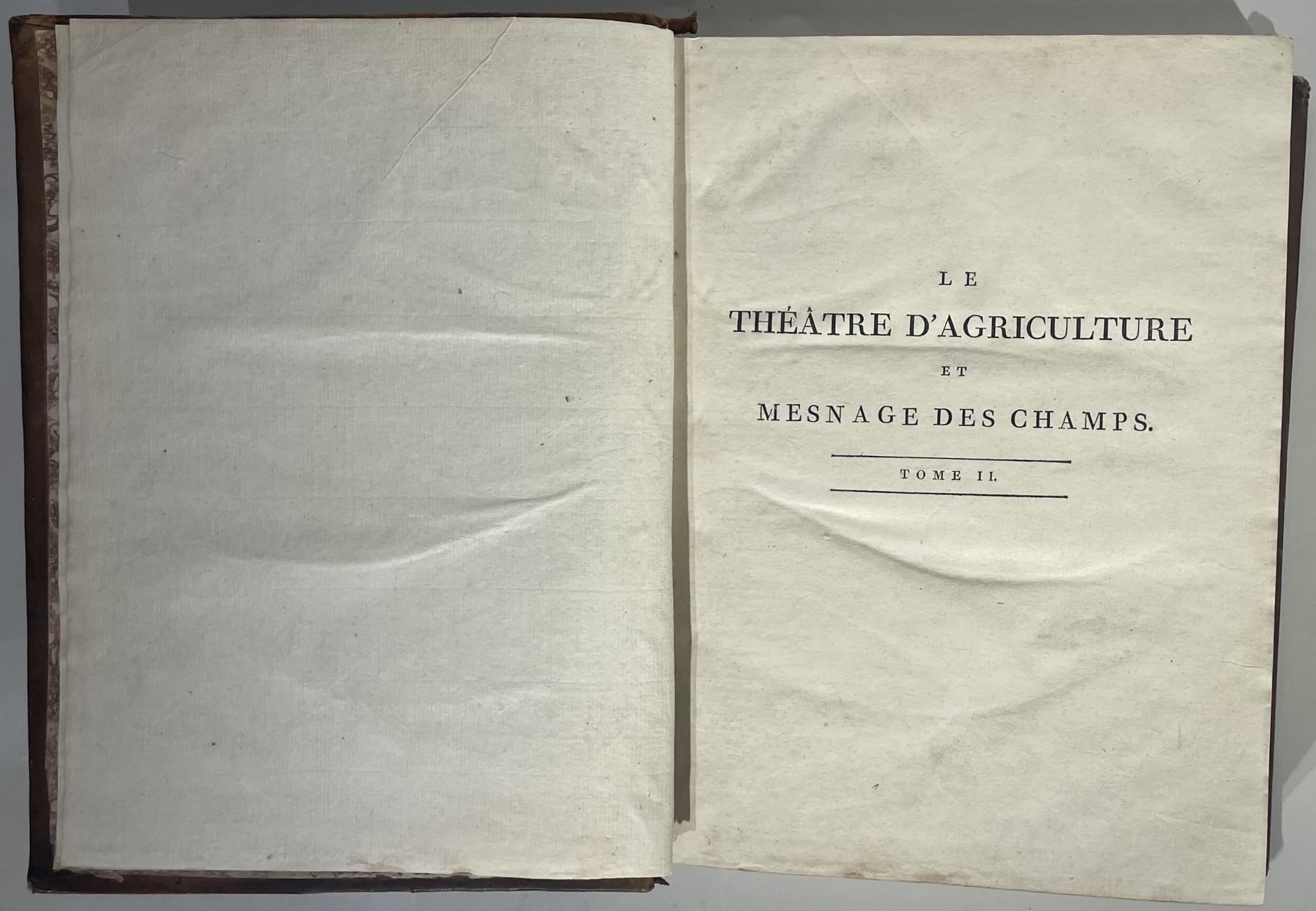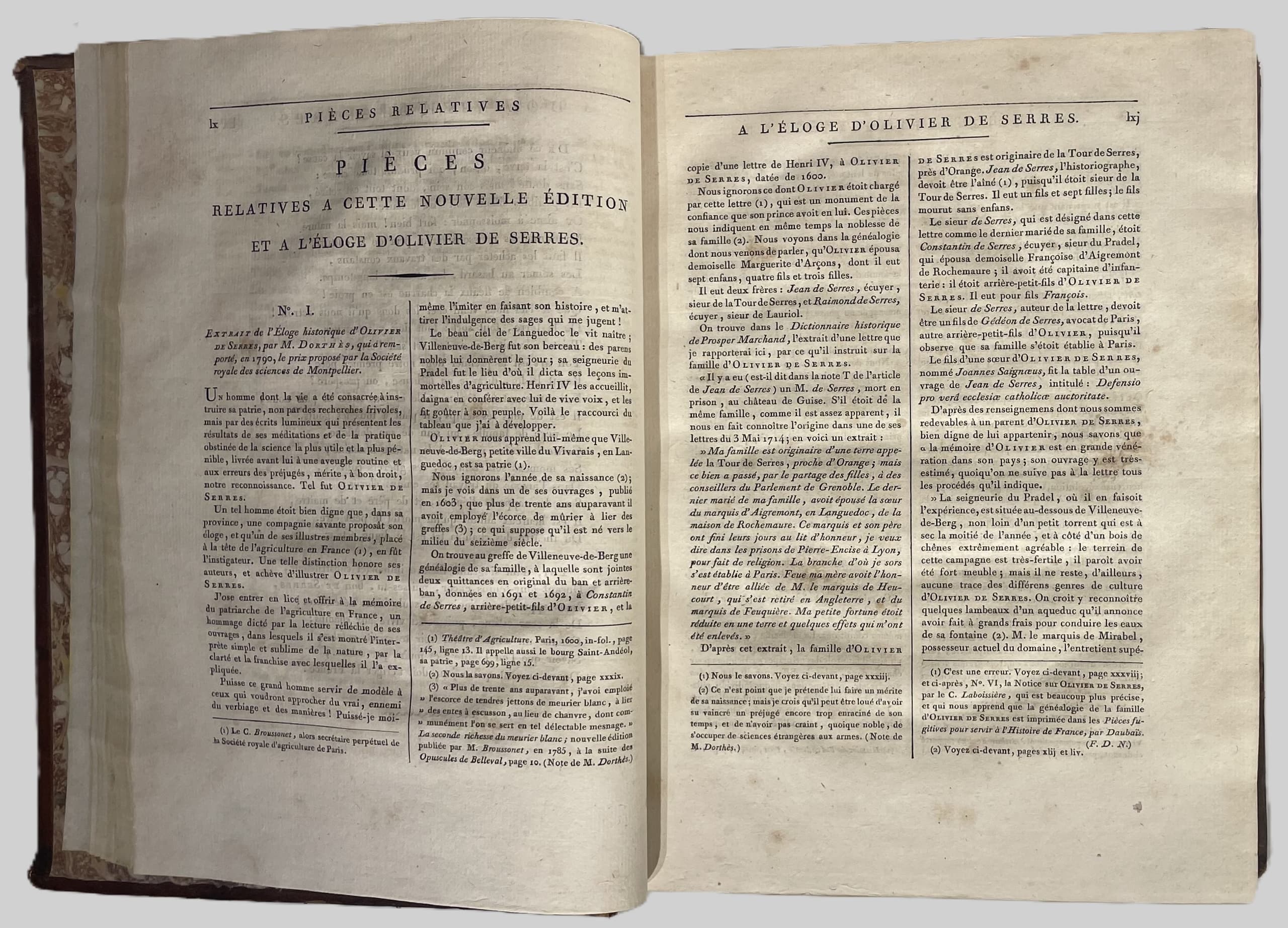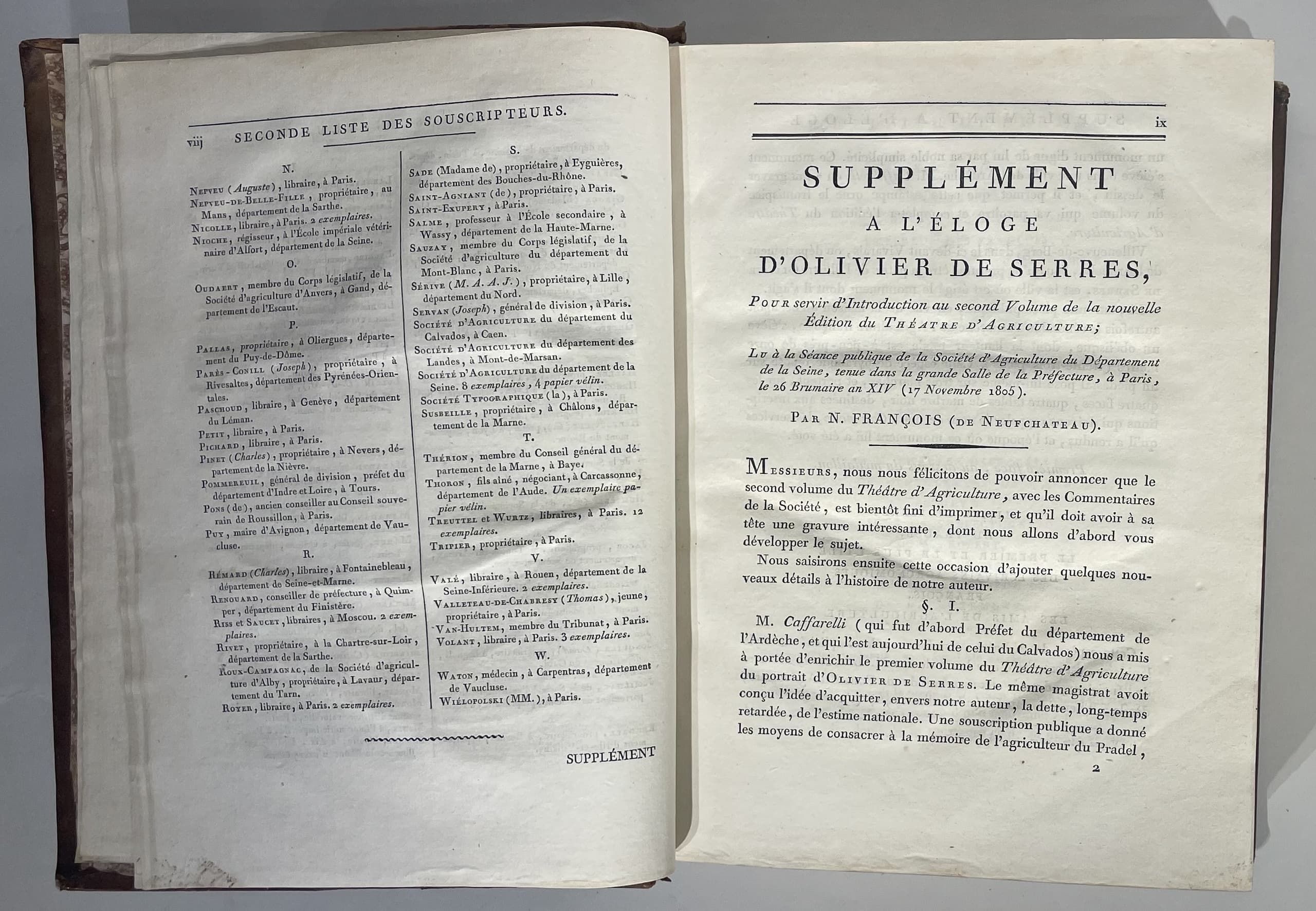 OLIVIER DE SERRES (1539-1619) LE THÉÂTRE D’AGRICULTURE ET MESNAGE DES CHAMPS [THE THEATRE OF AGRICULTURE AND FARM MANAGEMENT] 2 VOLUMES. 1804-1805. IN FRENCH.