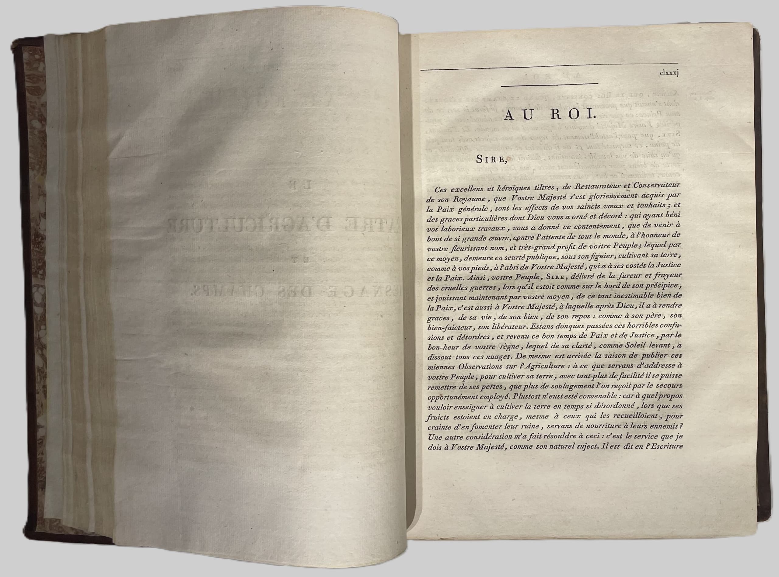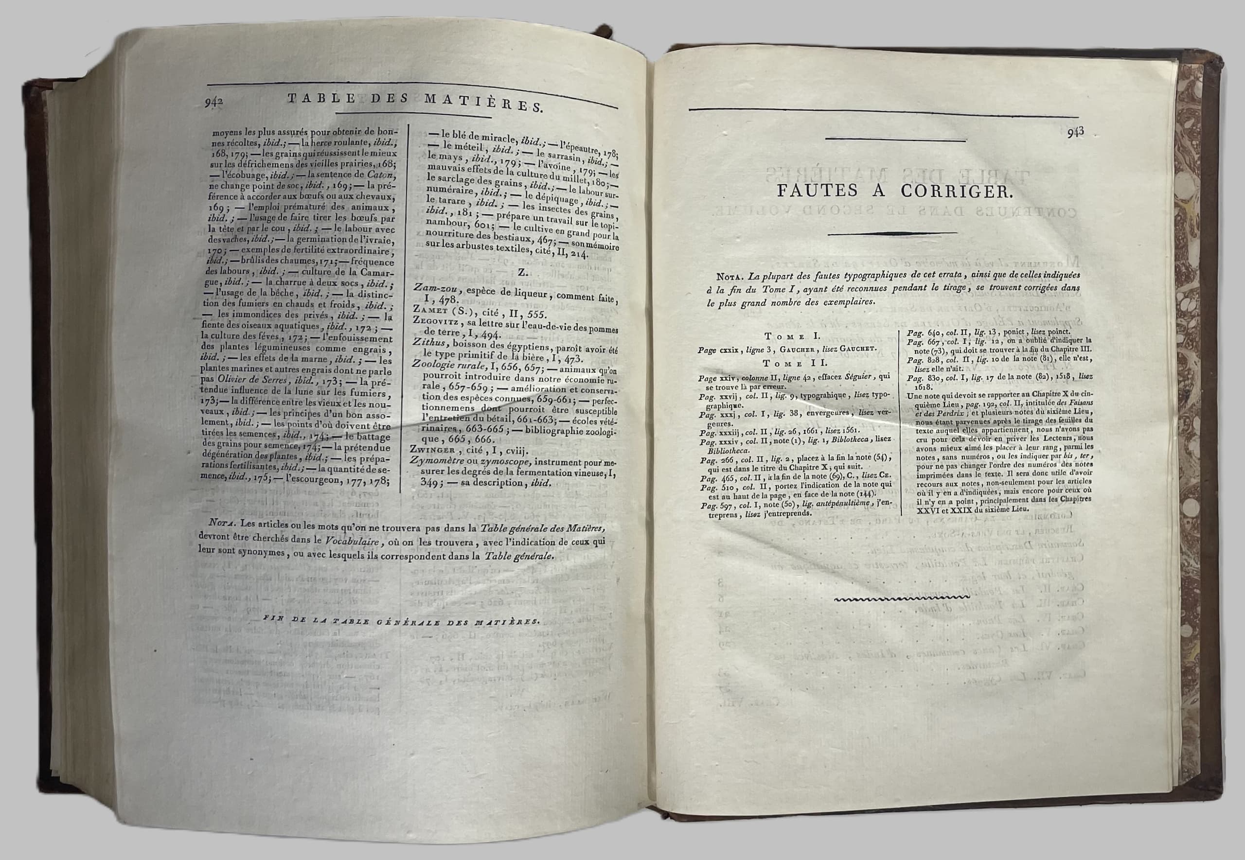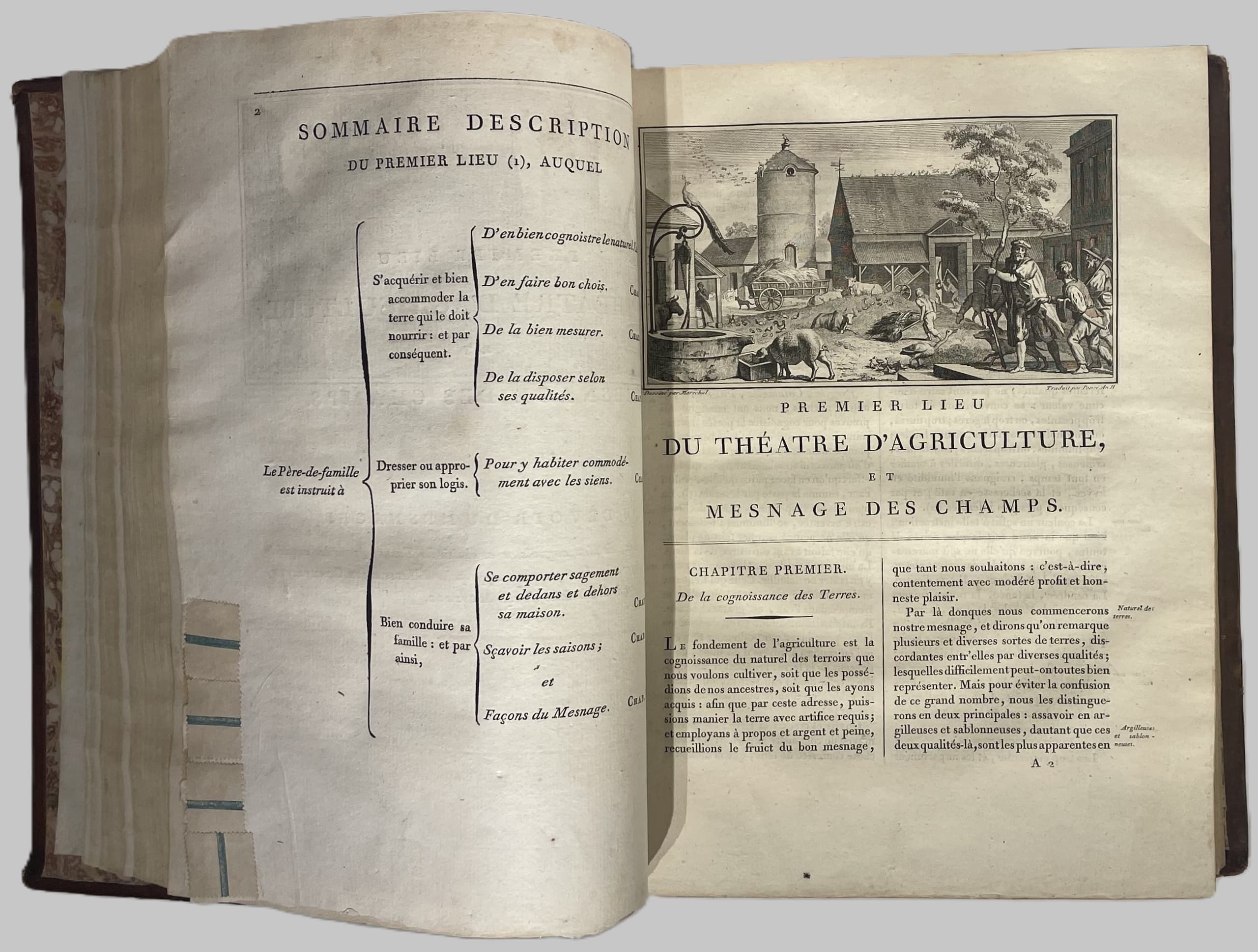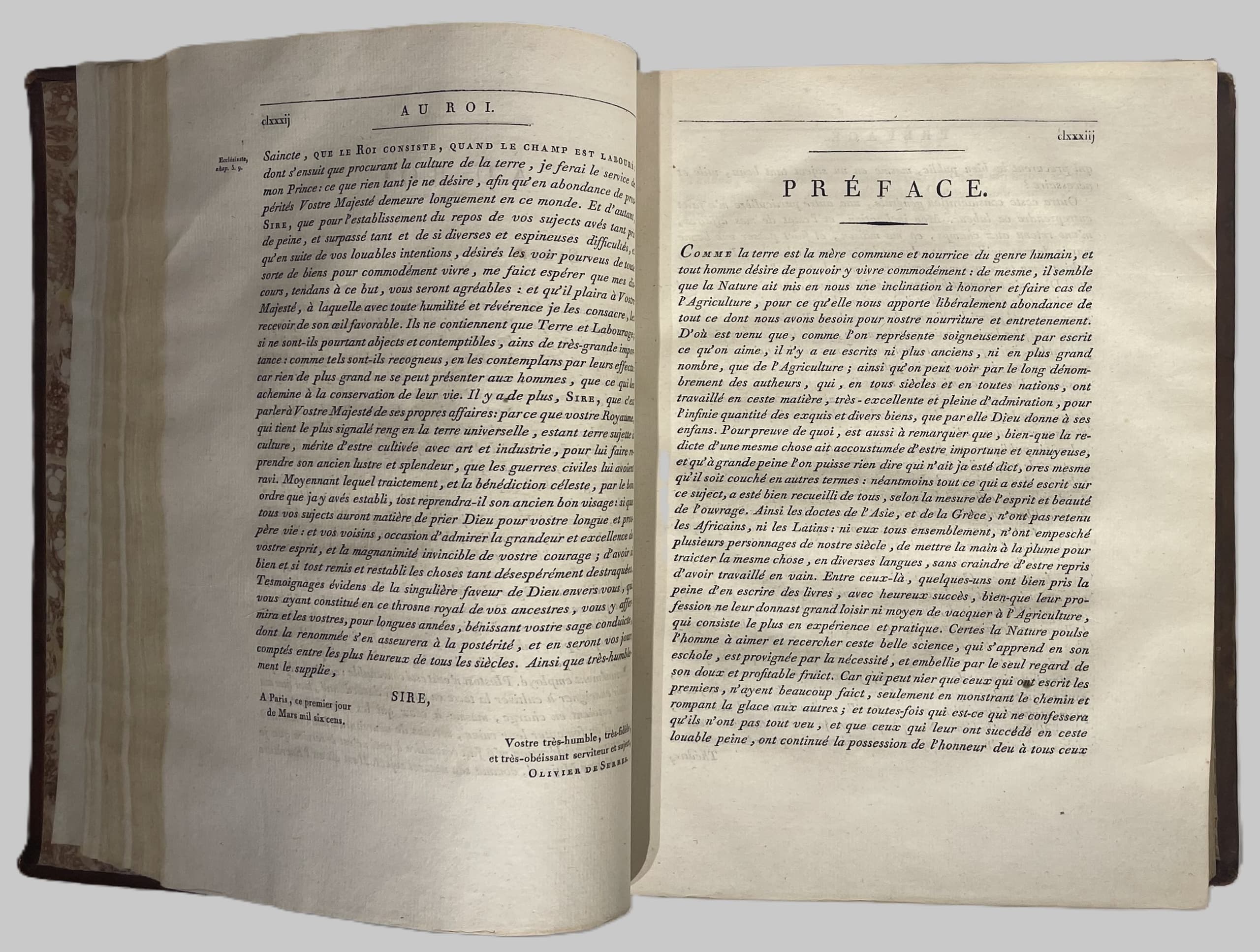OLIVIER DE SERRES (1539-1619) LE THÉÂTRE D’AGRICULTURE ET MESNAGE DES CHAMPS [THE THEATRE OF AGRICULTURE AND FARM MANAGEMENT] 2 VOLUMES. 1804-1805. IN FRENCH.