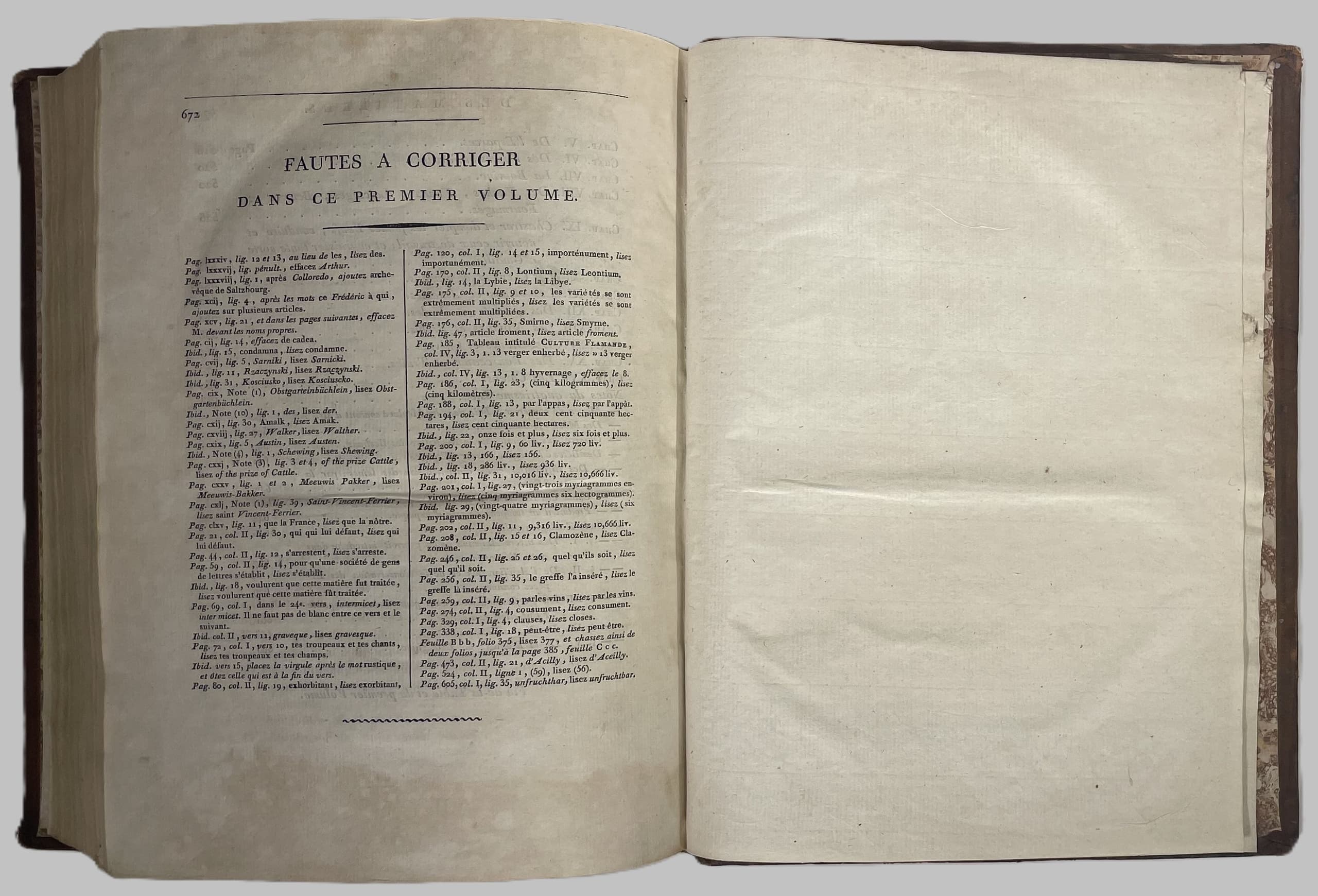 1f. blank, half-title, frontispiece, title, second list of subscribers (v-viij), supplement to the eulogy (ix-xx), bibliographical note (xxj-xlij), names of authors (xliij-xliv), 948 pages (including vocabulary of ancient words p.845 to 868, table or general index of the most notable subjects p.869 to 949, errors to be corrected p.943, table of contents contained in the second volume p.944 to 948, 1f. blank.