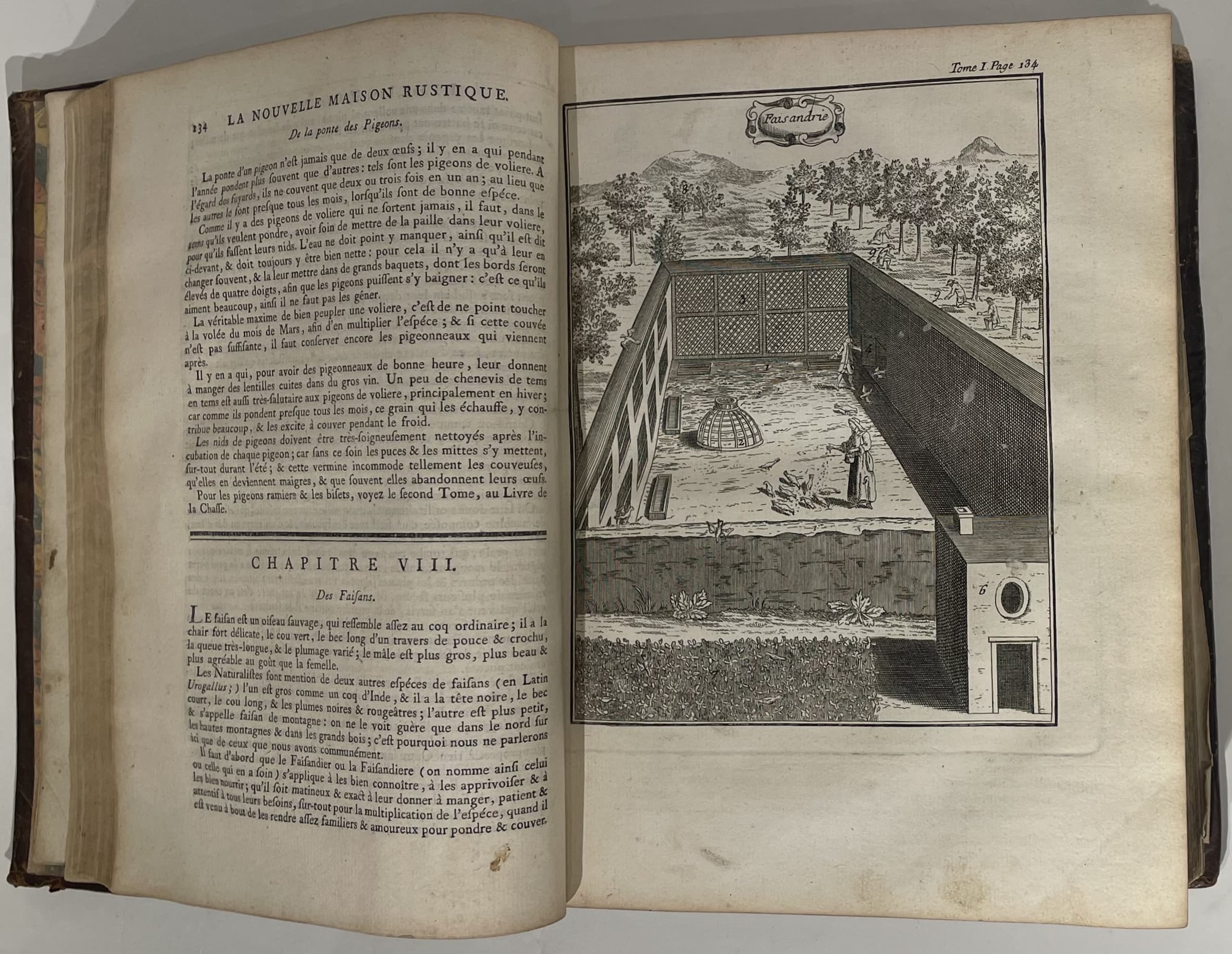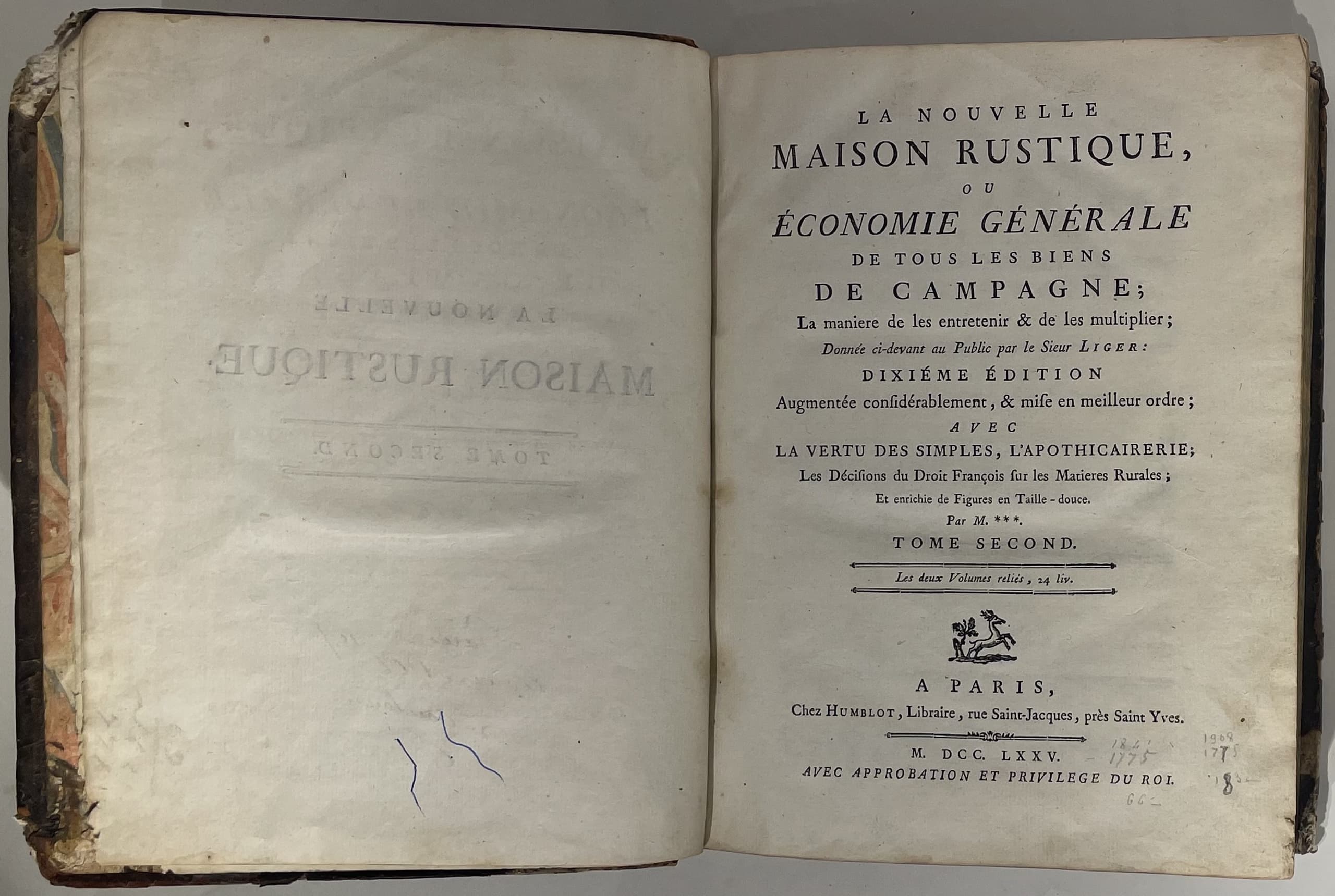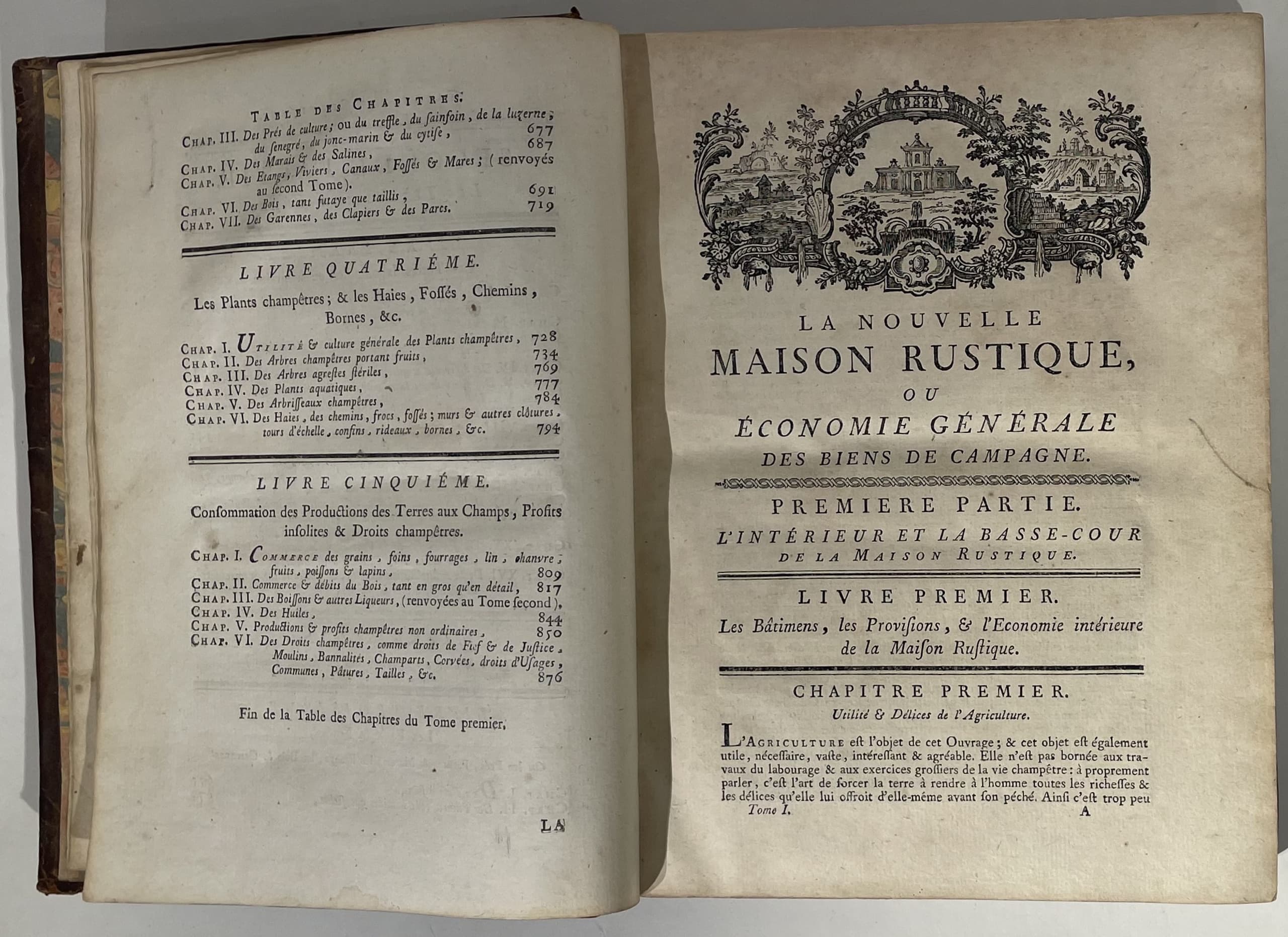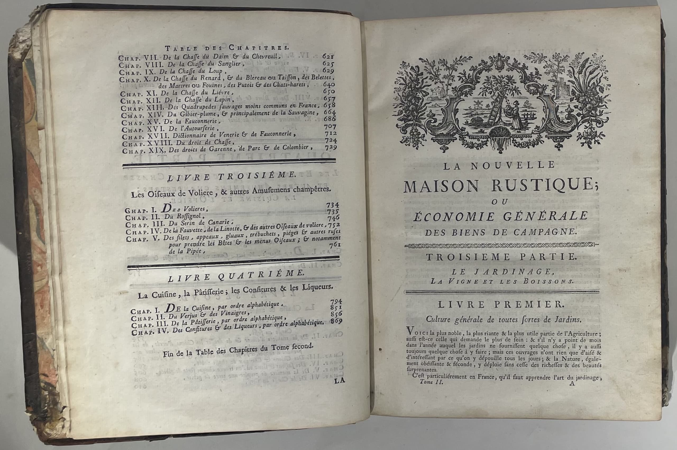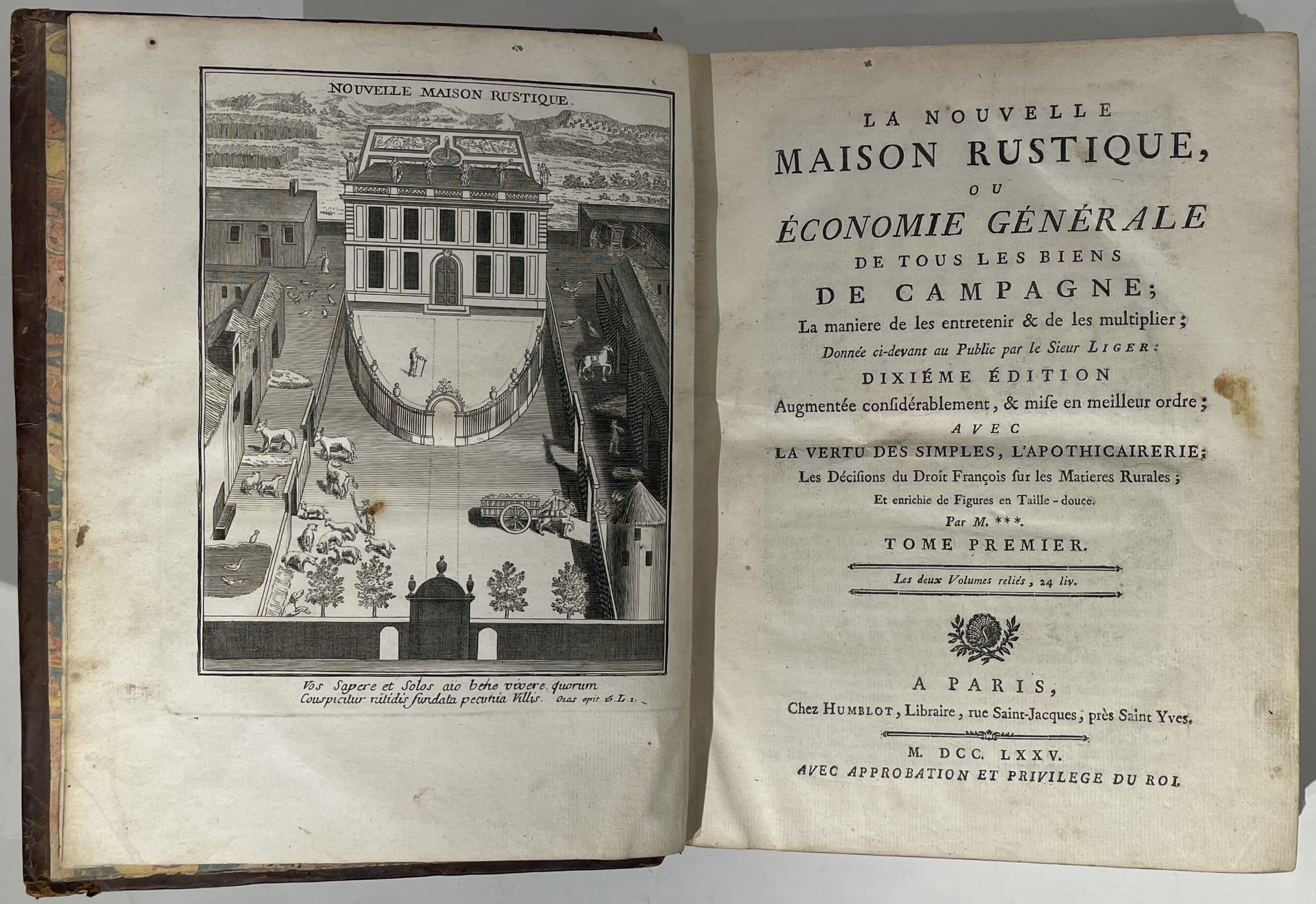 LOUIS LIGER (1658-1717) LA NOUVELLE MAISON RUSTIQUE, OU ÉCONOMIE GÉNÉRALE DE TOUS LES BIENS DE CAMPAGNE [THE NEW RUSTIC HOUSE, OR GENERAL ECONOMICS OF ALL COUNTRY PROPERTIES] 2 VOLUMES. 1775. IN FRENCH.