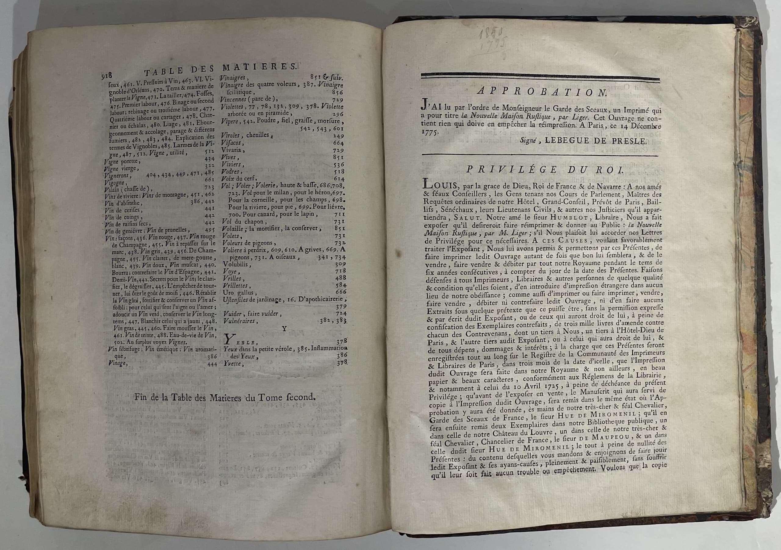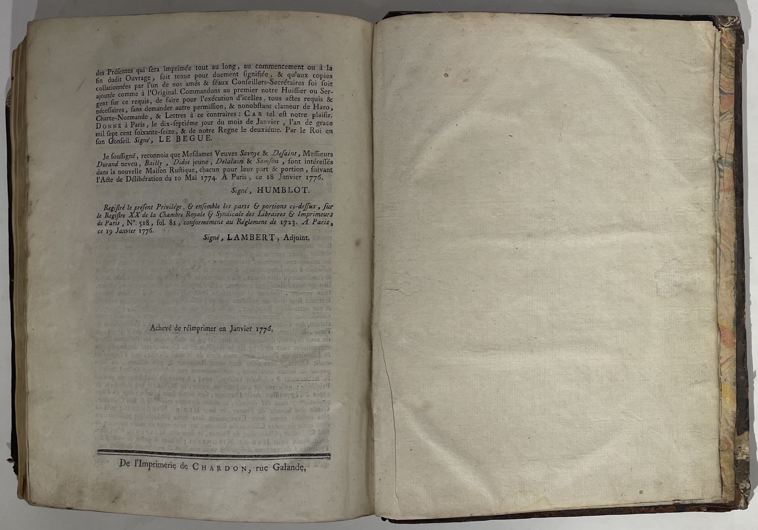 1 blank page, half-title, title page, table of contents (4 unnumbered pages), 918 pages including table of contents on pages 895 to 918, Approval (signed, Lebegue de Presle)-Privilege of the King (2 unnumbered pages), 1 blank page.