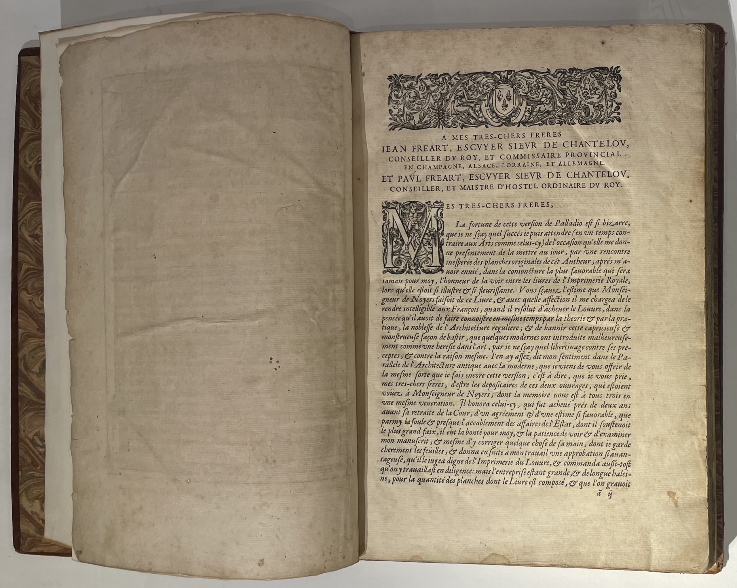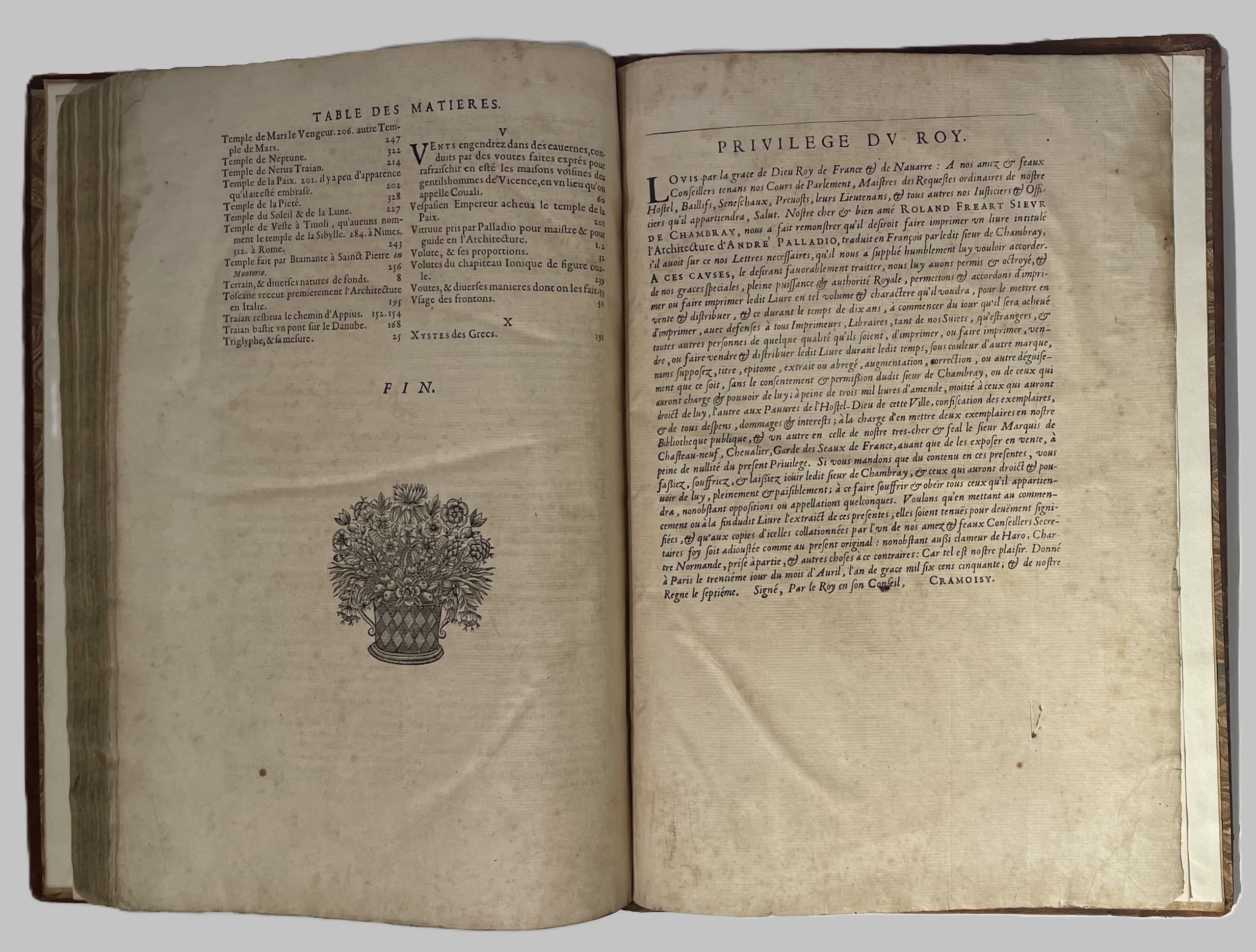 Commissioned by François Sublet de Noyers, Superintendent of Buildings and cousin of Chambray, Roland Fréart de Chambray’s complete translation was finished around 1641, but its publication was delayed by Sublet’s fall from grace (1643) and death (1645). Three additional engravings, not present in the Italian edition, were added and annotated. A glossary was also added at the end of the volume to aid comprehension.