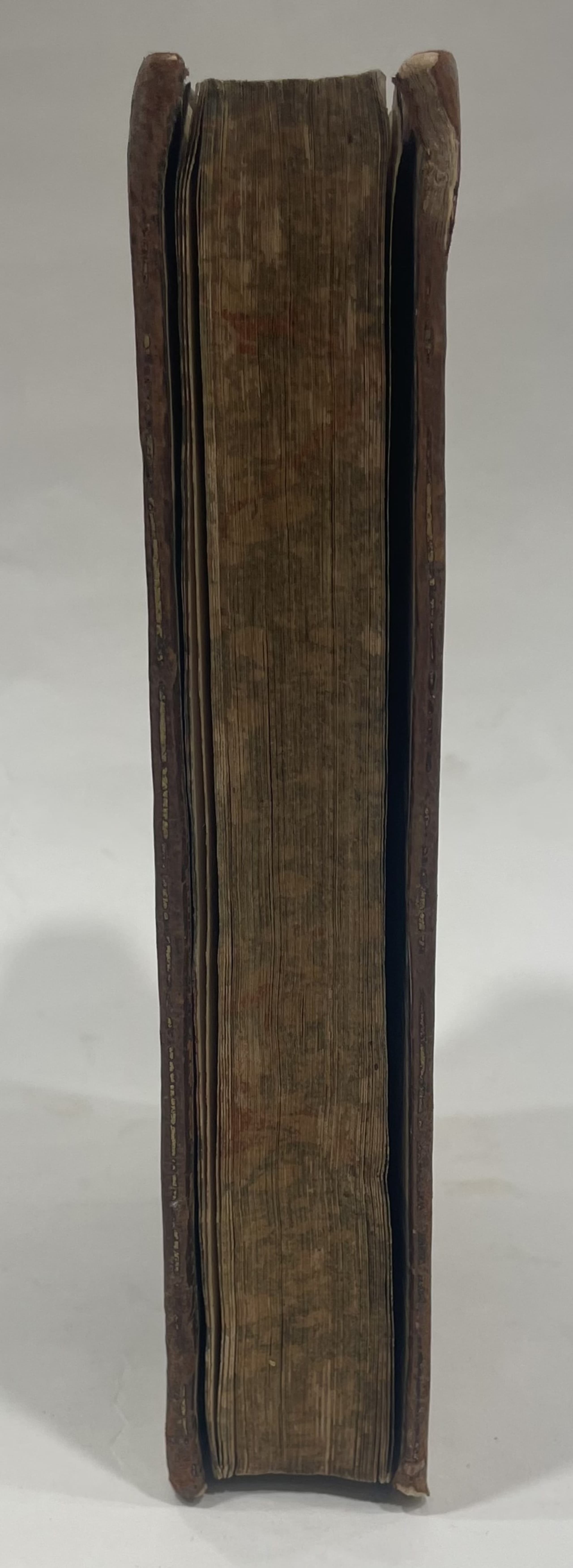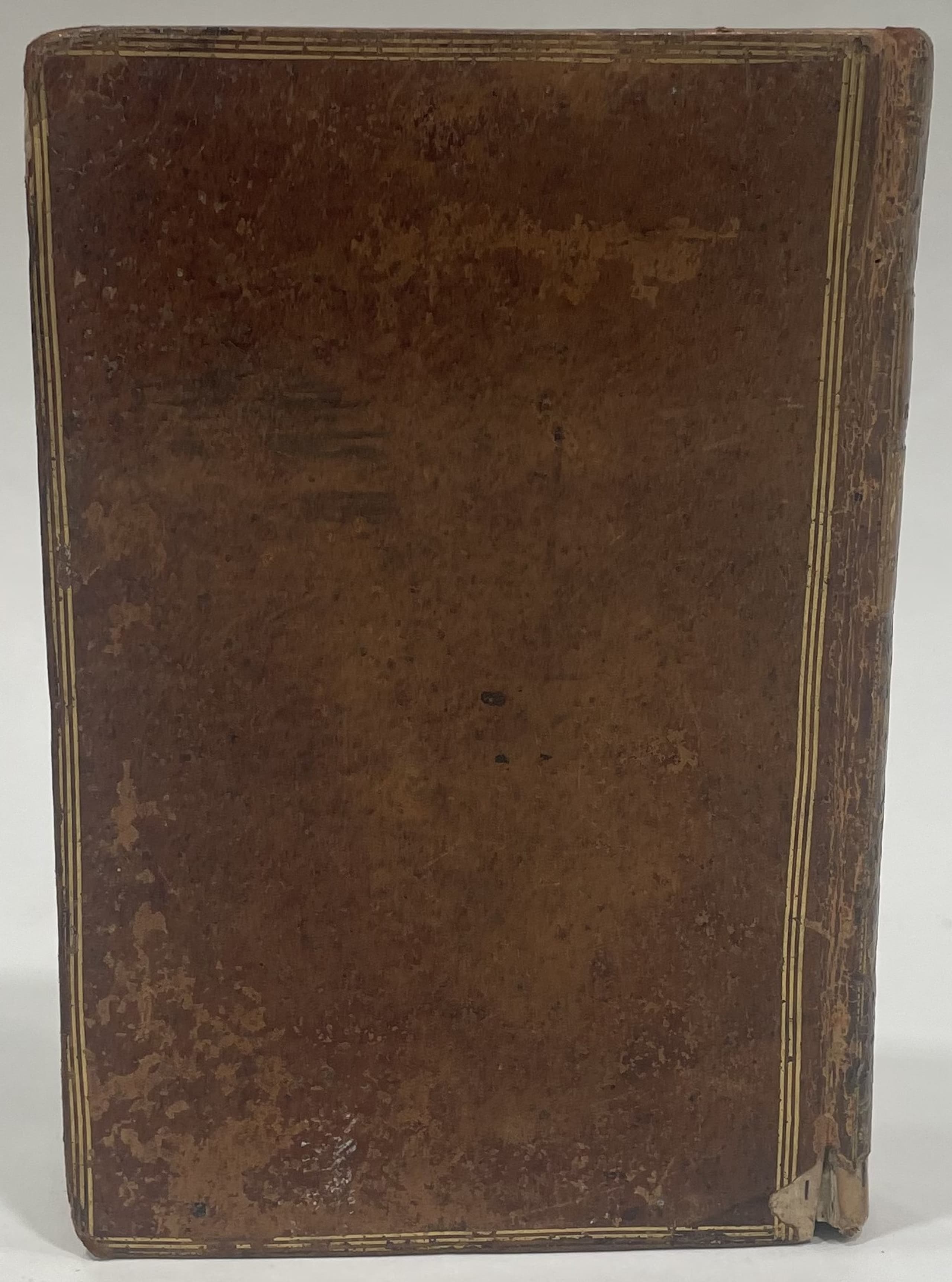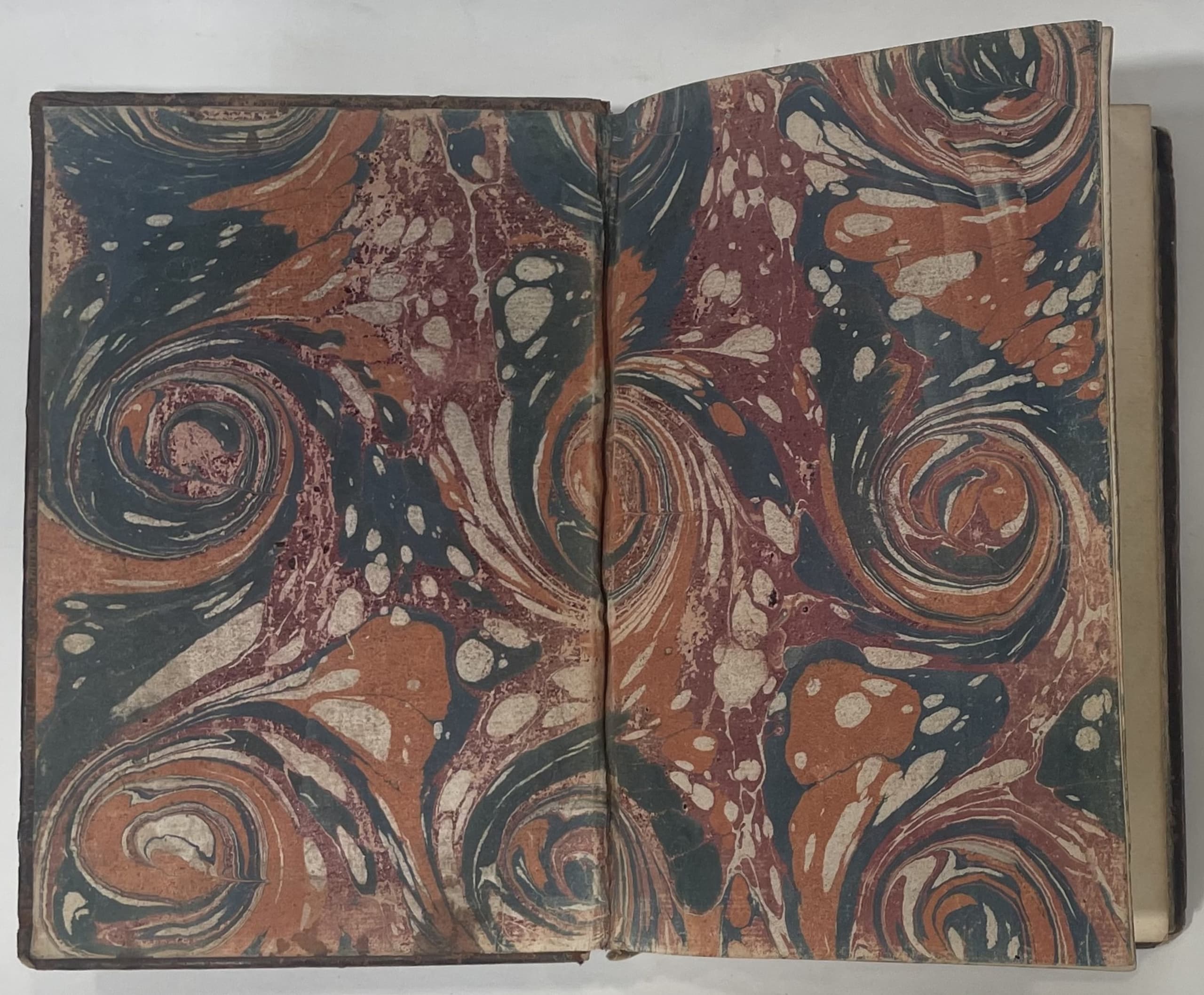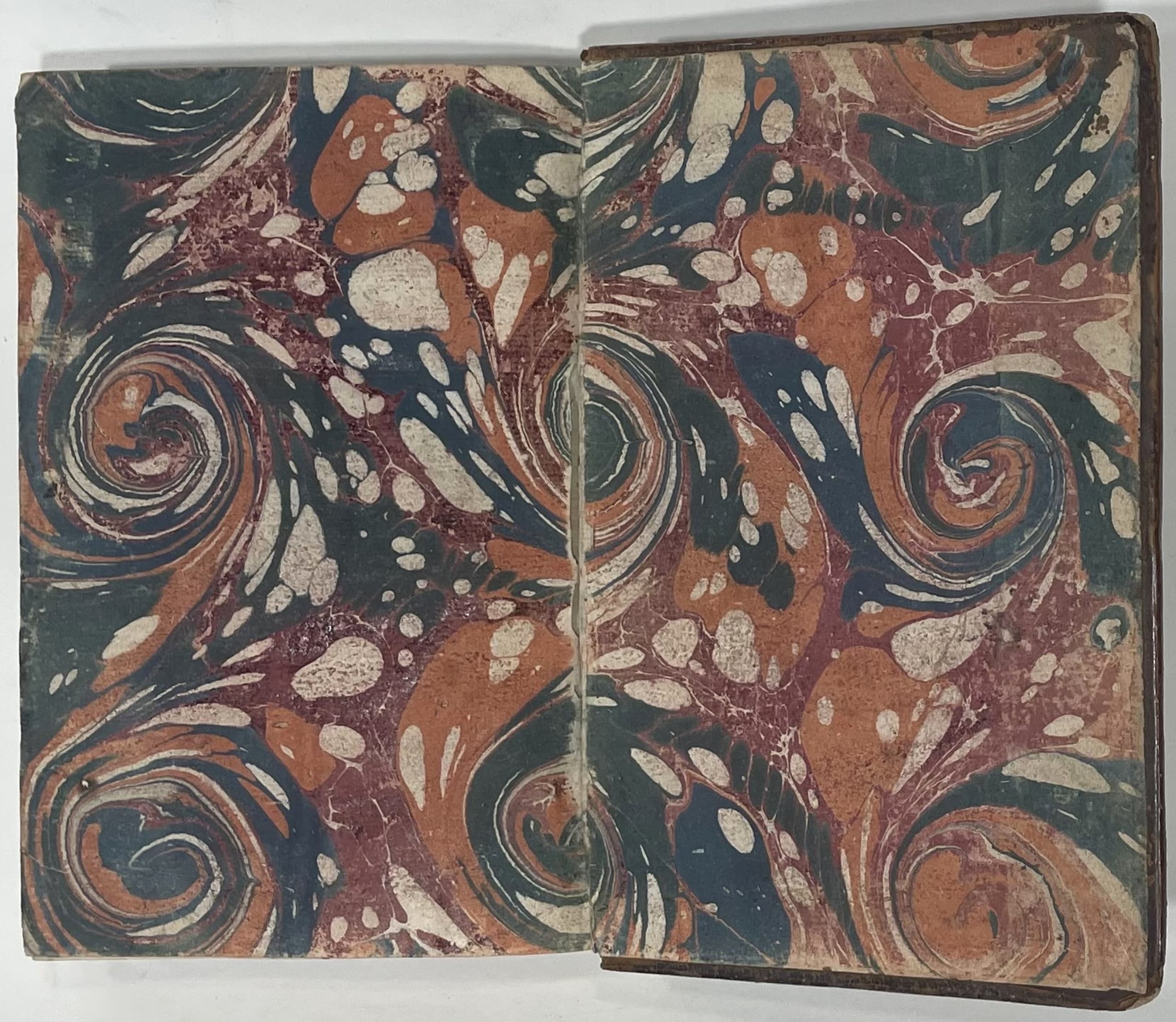 Hardcover, smooth spine decorated with cloisonné and floral motifs, triple fillet framing on the covers, marbled edges (faded colours).