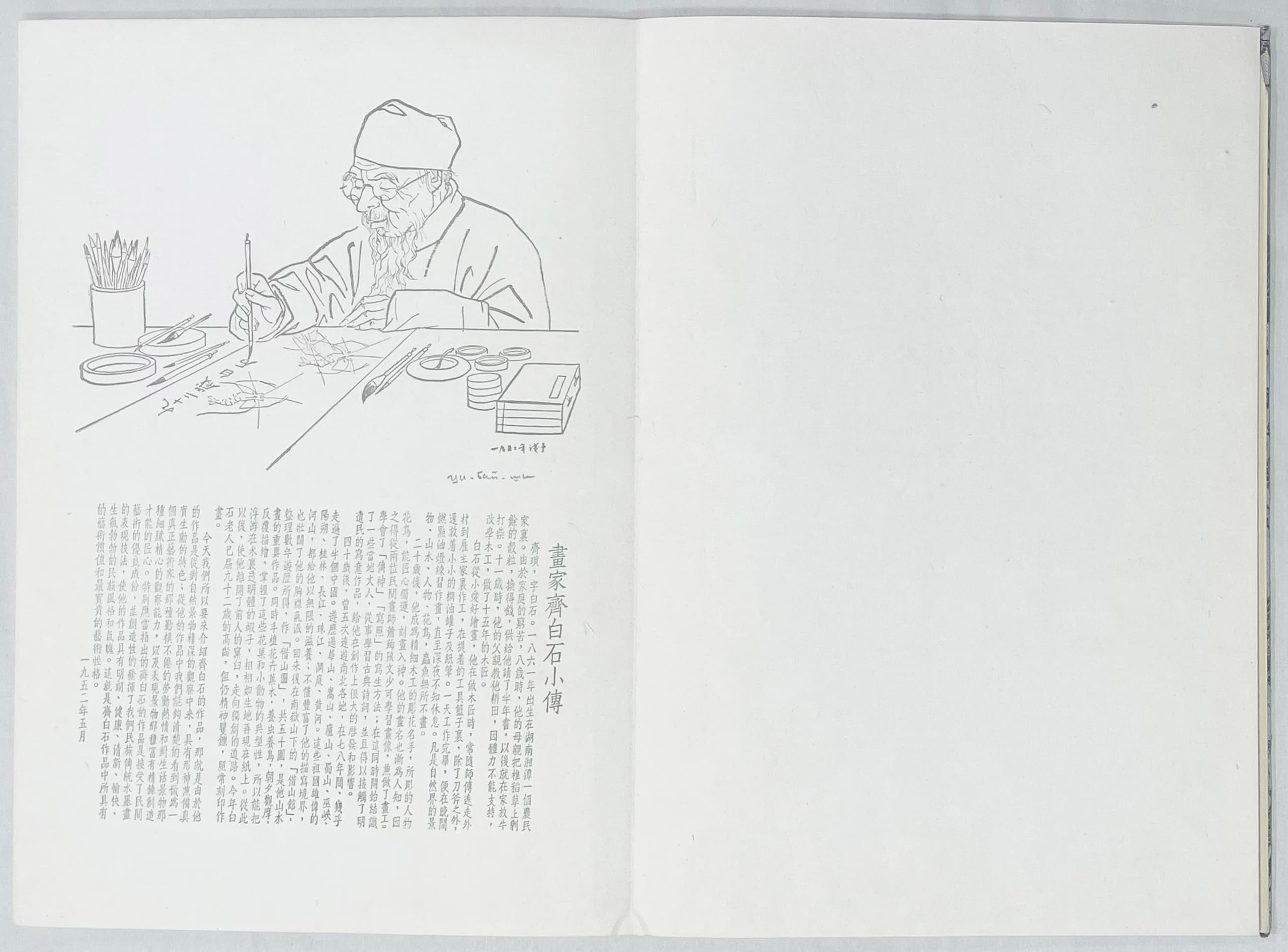22 original colour woodcuts, titled and signed, representative works of flowers and animals, and 1 page of typographic text with a woodcut portrait, at his drawing table, of the Elder Baishi by Ye Qianyu and a brief biography of Qi Baishi.