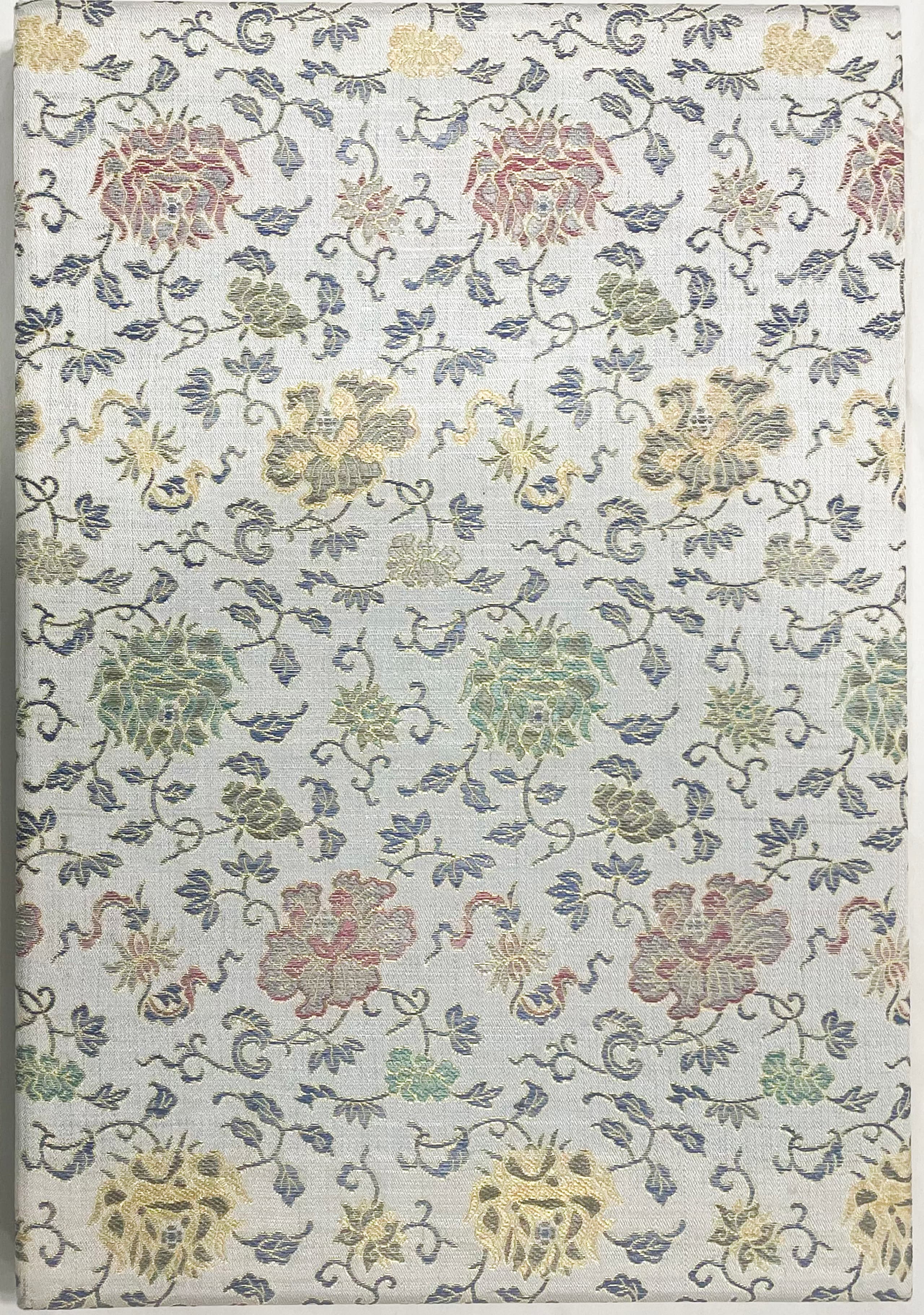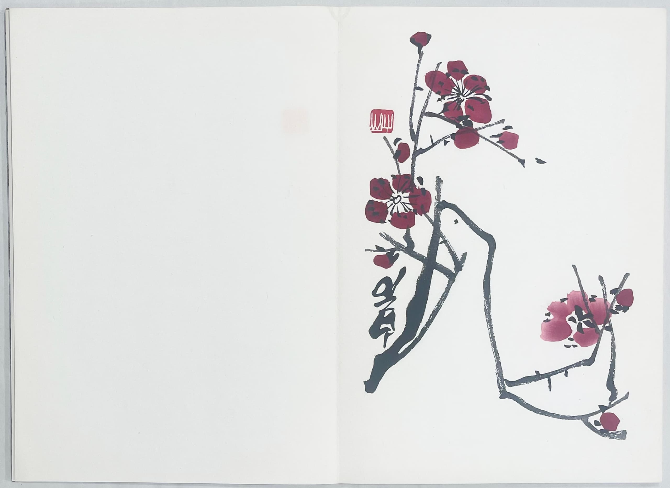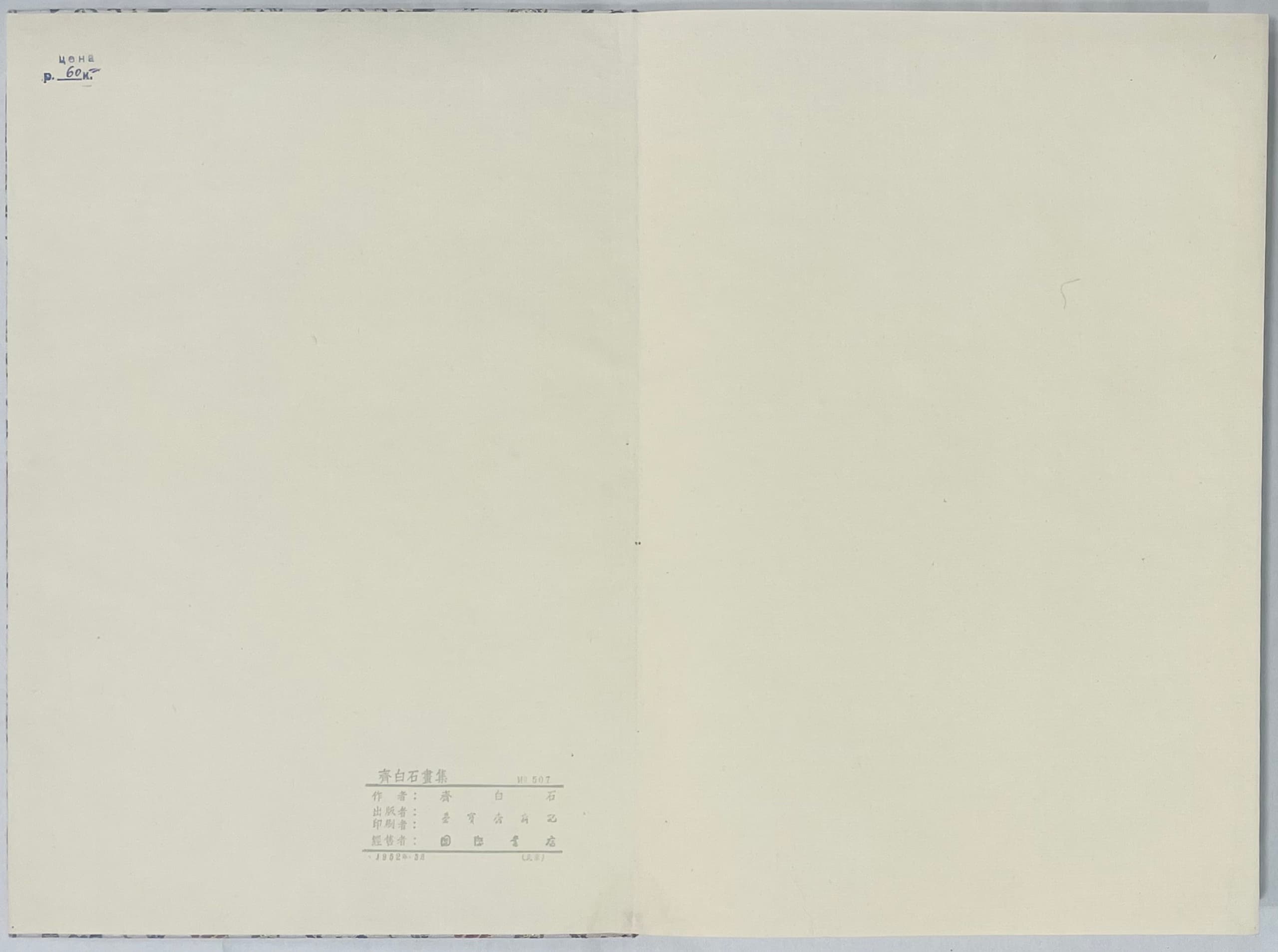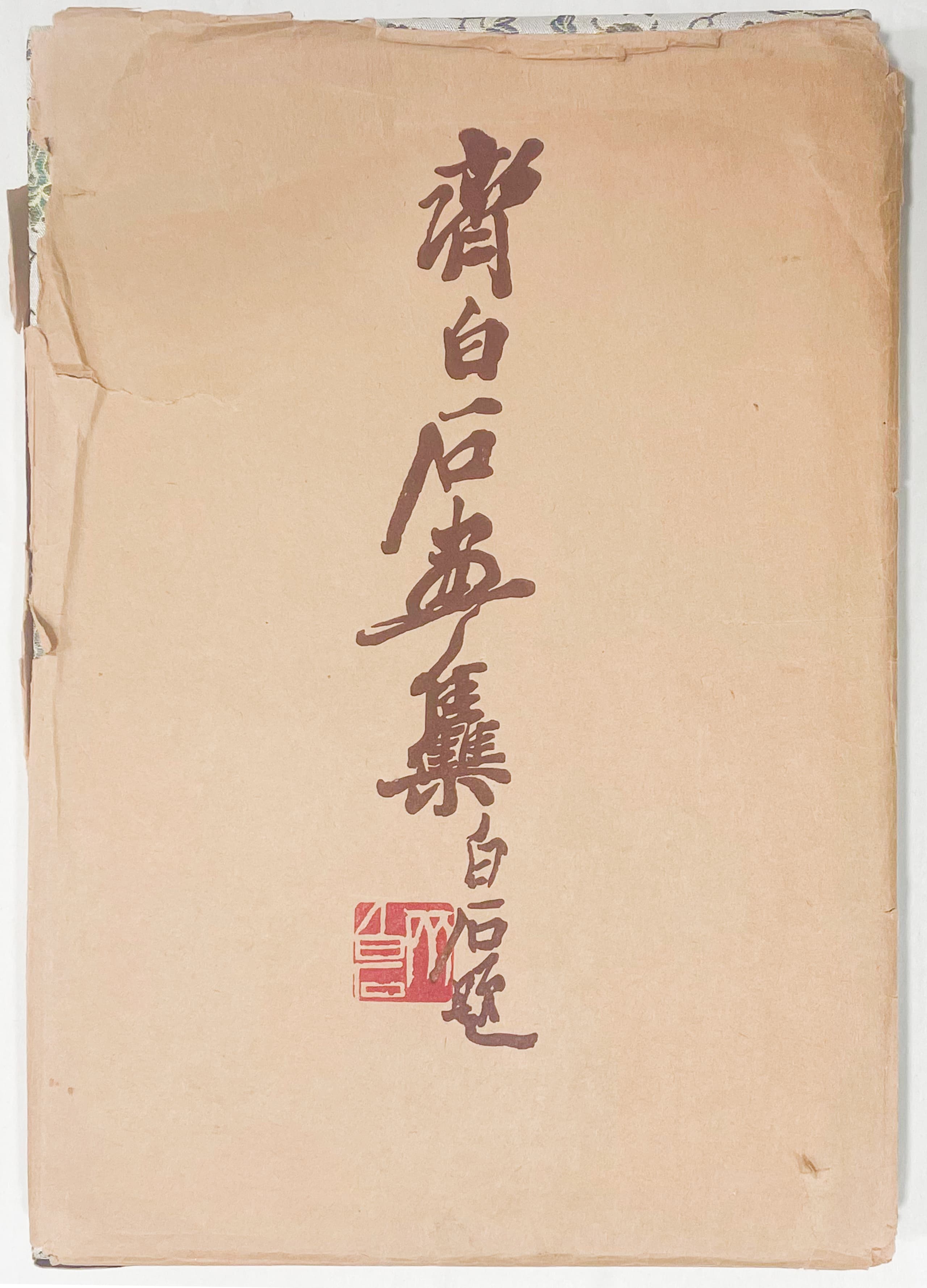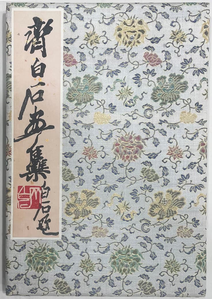 Double-leaf leporello comprising 46 sheets, bound in two cardboard covers covered with ornamental coloured and gold brocade silk and mounted with title label “Qi Baishi hua ji, Baishi ti”. Colour woodcuts produced using the mosaic printing process by the famous Rongbaozhai printing house in Beijing, based on paintings by Qi Baishi, one of the most important Chinese painters of the 20th century.