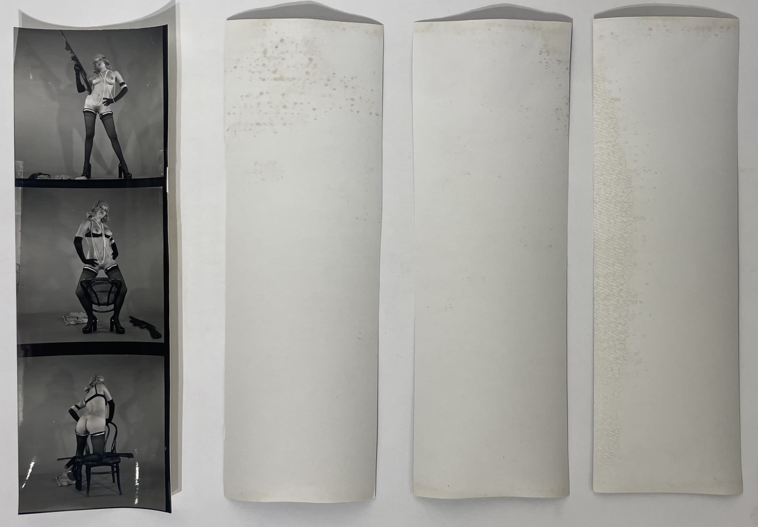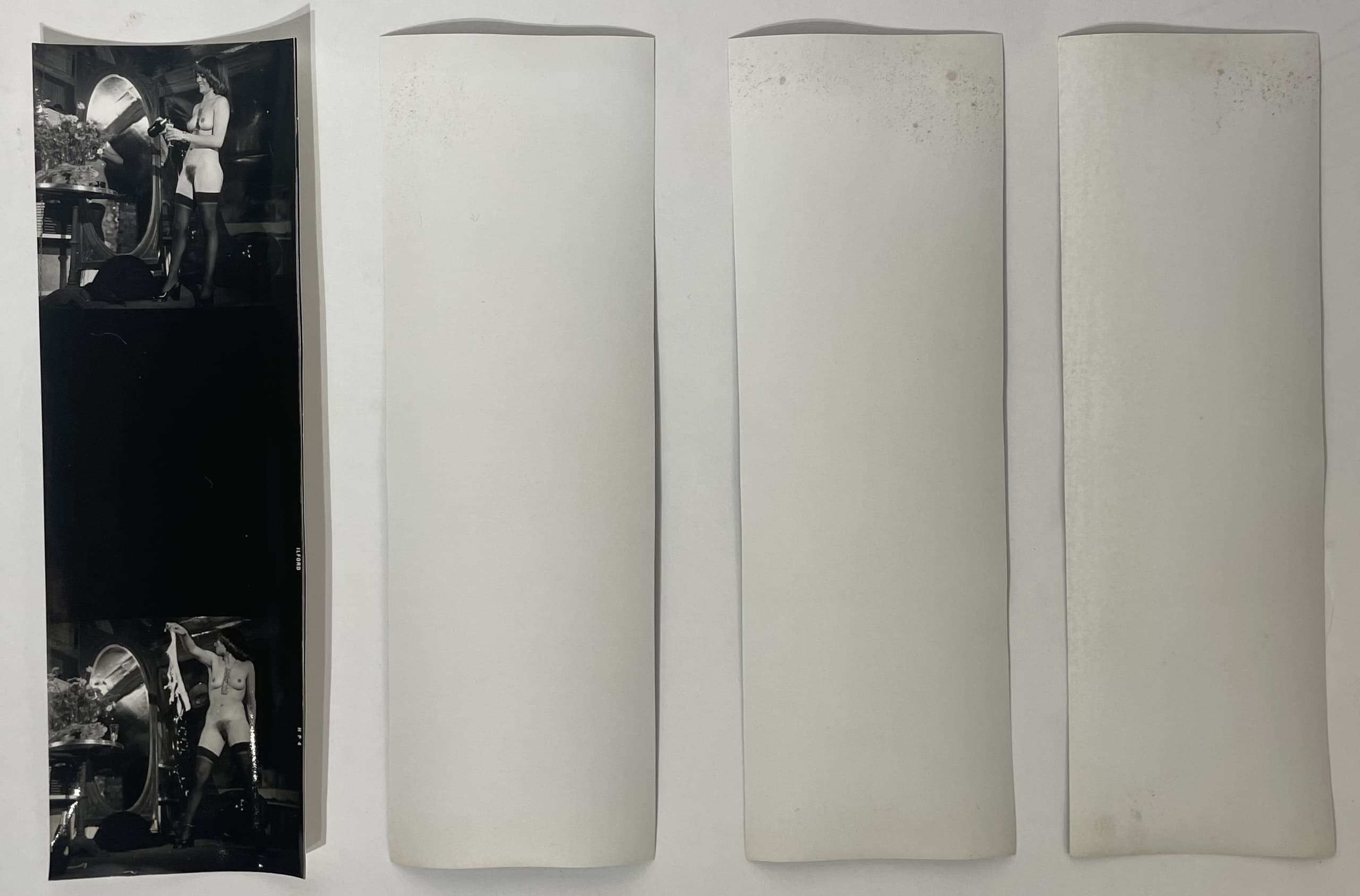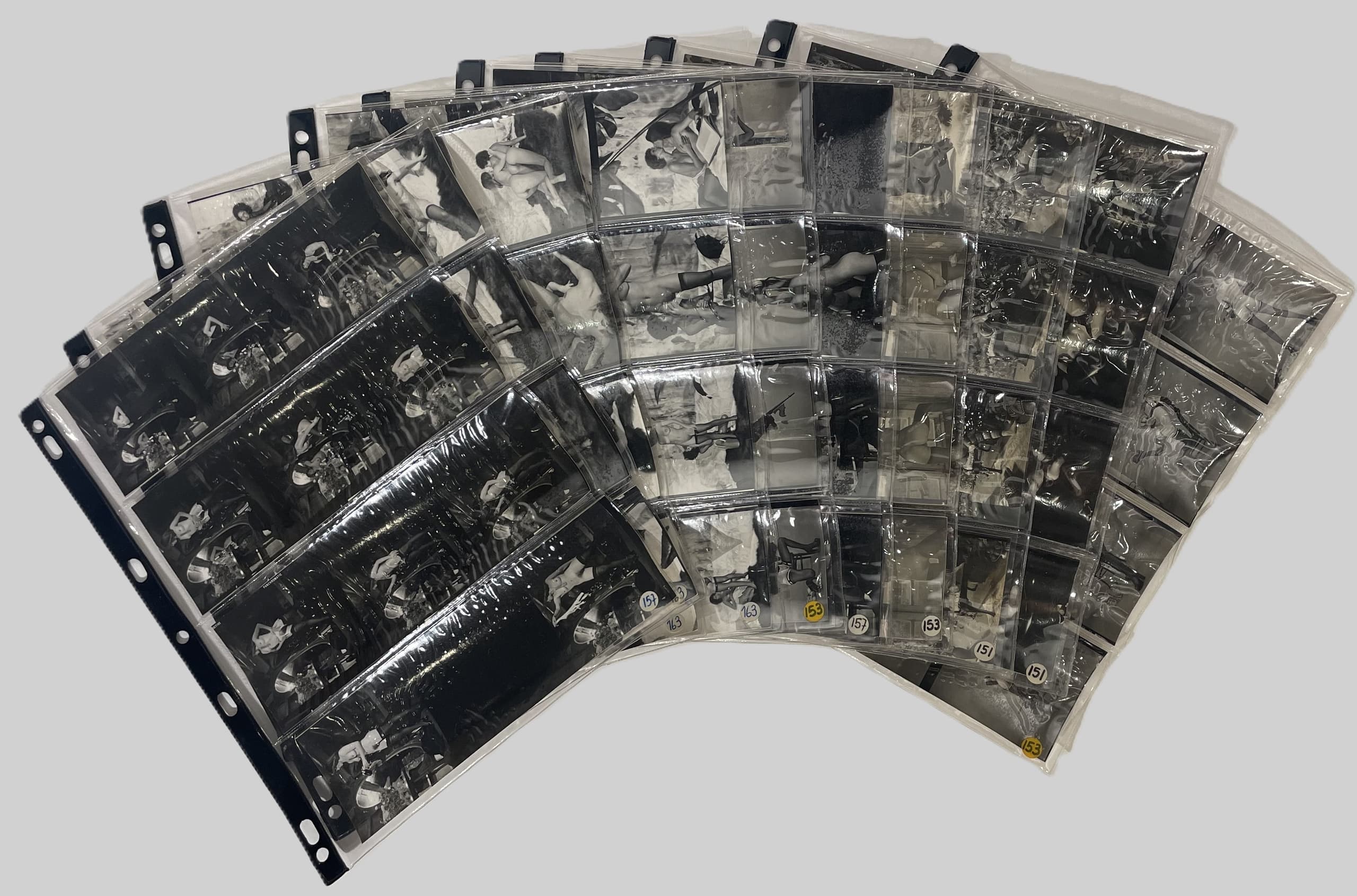 Set of 116 erotic photographs, posing sessions, by photographer Hubert Toyot. Vintage silver contact prints, arranged in 10 sleeves (each 26.3x21cm) and arranged in strips (18x6cm) of 3 photographs (each approx. 5.6x5.6cm)