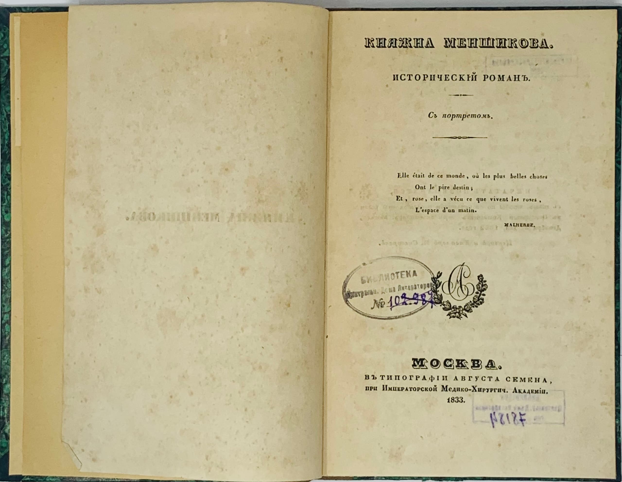 BANTYSH-KAMENSKY DMITRI (1788-1850) Knyazhna Menshikova: Istorichesky roman [Princess Menshikova: A Historical Novel]. M.: Tip. Augusta Semena, pri Imp. Mediko-Khirurgicheskoy Akademii, 1833. – 124, IV pages; 22 × 13 cm. in Russian