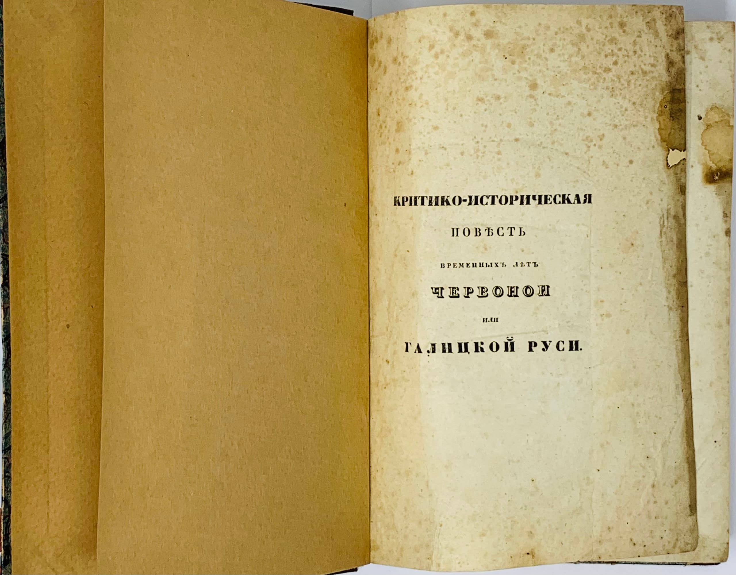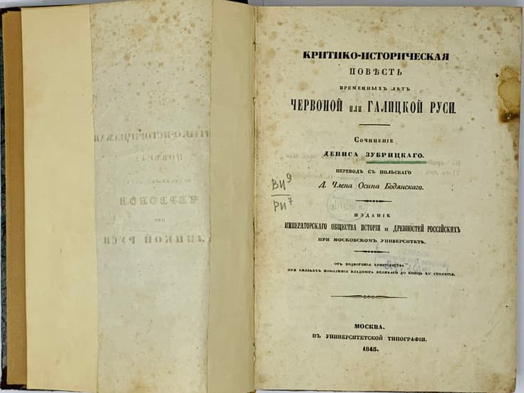 ZUBRITSKY DENIS (1777-1862) Kritiko-istoricheskaya povest vremennykh let Chervonnoy ili Galitskoy Rusi: Ot vodvoreniya khristianstva pri knyazyakh pokoleniya Vladimira Velikogo do kontsa XV st.; per. s pol. [i predisl.] d. chl. Osipa Bodyanskogo. [Critical-Historical Tale of Bygone Years of Chervona or Galicia Rus: From the Establishment of Christianity under the Princes of Vladimir the Great's generation to the end of the XV century]; Translated from Polish [with a Preface] by Full Member Osip Bodyansky.] Moscow.: izd. Imp. O-vo istorii i drevnostey ros. pri Mosk. un-te; v Universitetskoy tip., 1845. – XLVI, [2], 420, 47 pages; 21 cm. in Russian