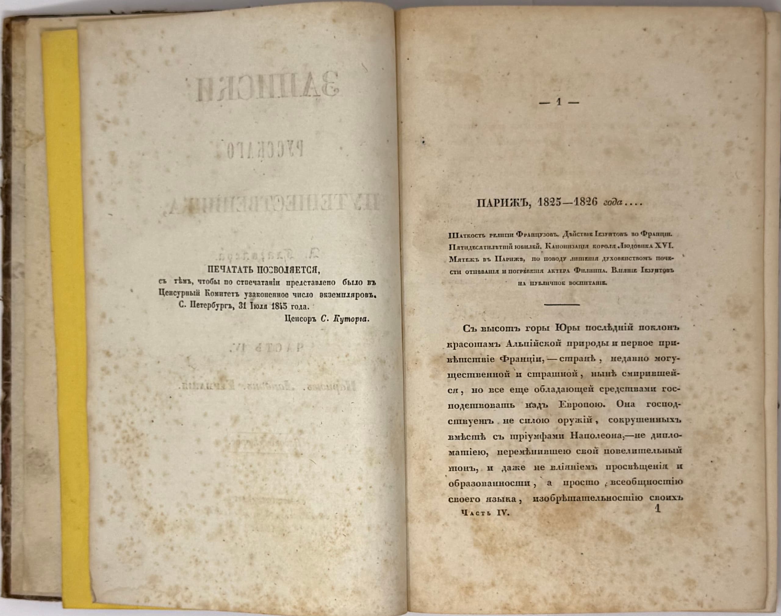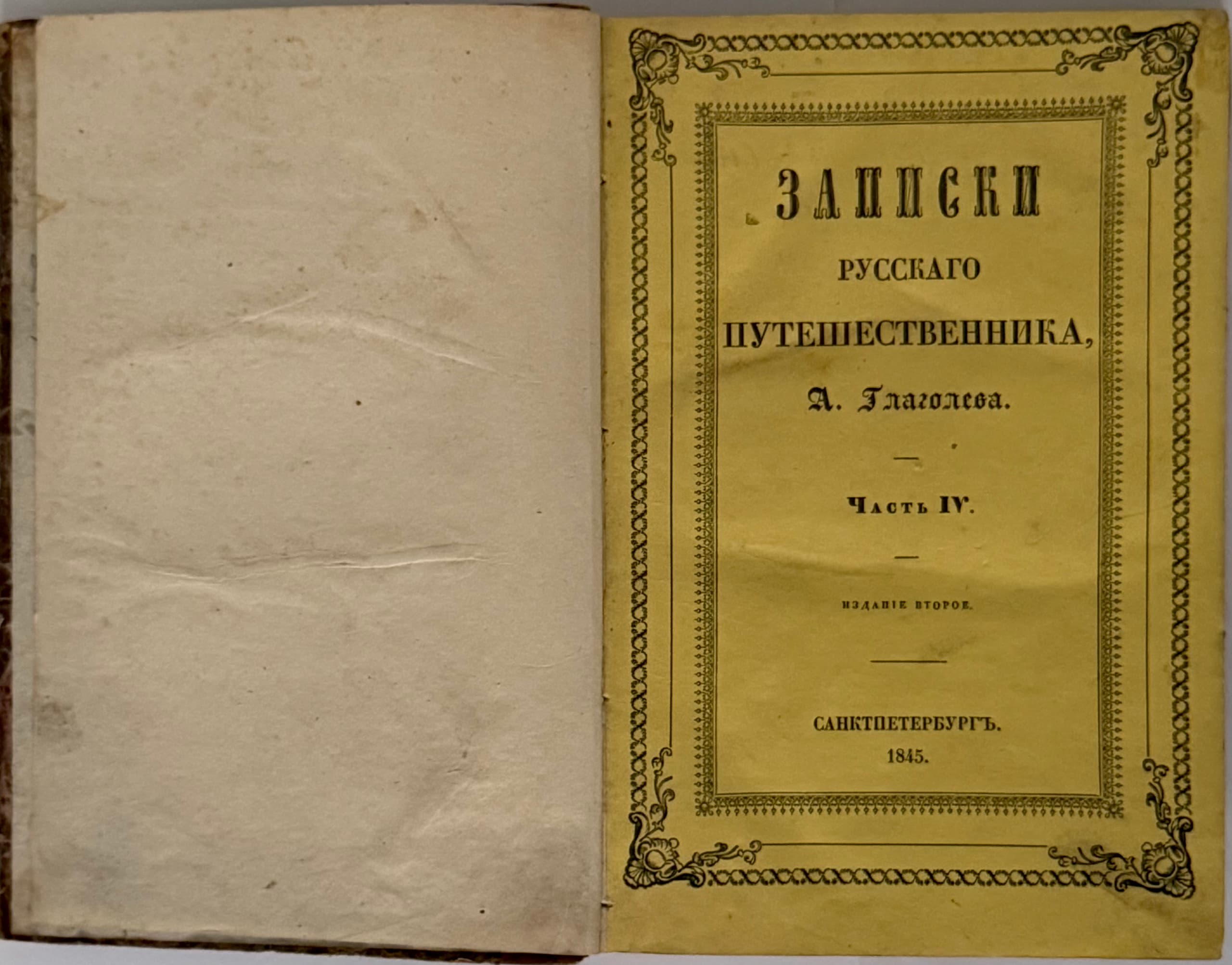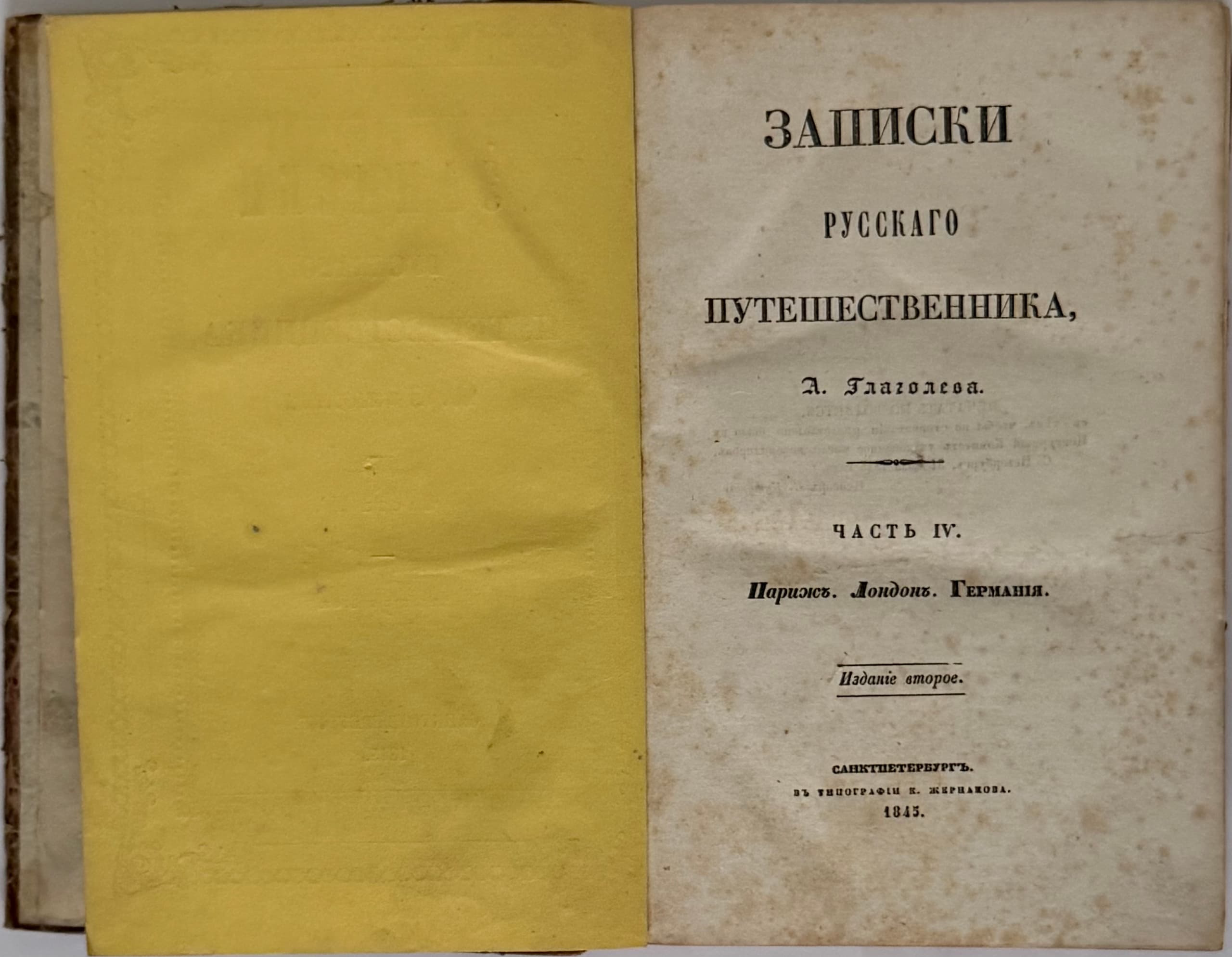 A rare second edition of Glagolev’s travel memoirs, recounting his journeys across France, England, and Germany between 1823 and 1827. His Notes of a Russian Traveller are valued for their vivid observations of European society and culture through the perspective of a Russian intellectual of the early 19th century.