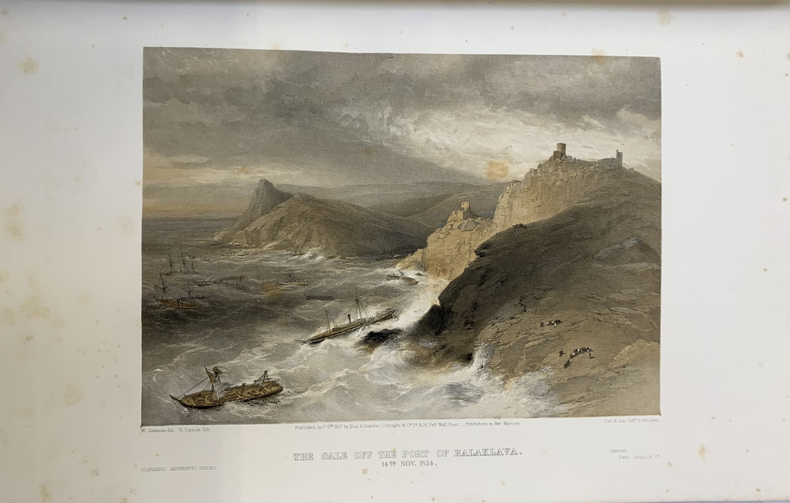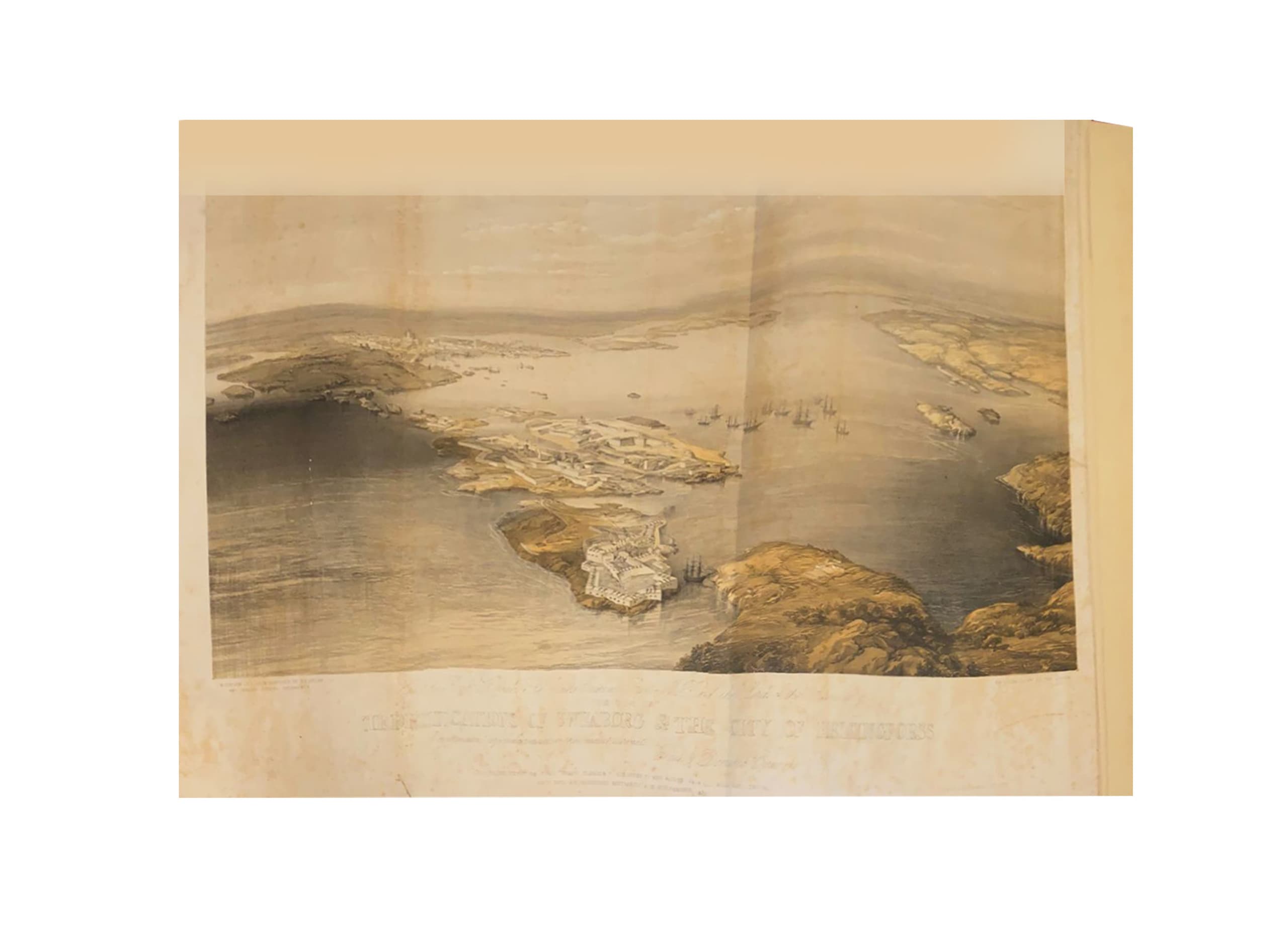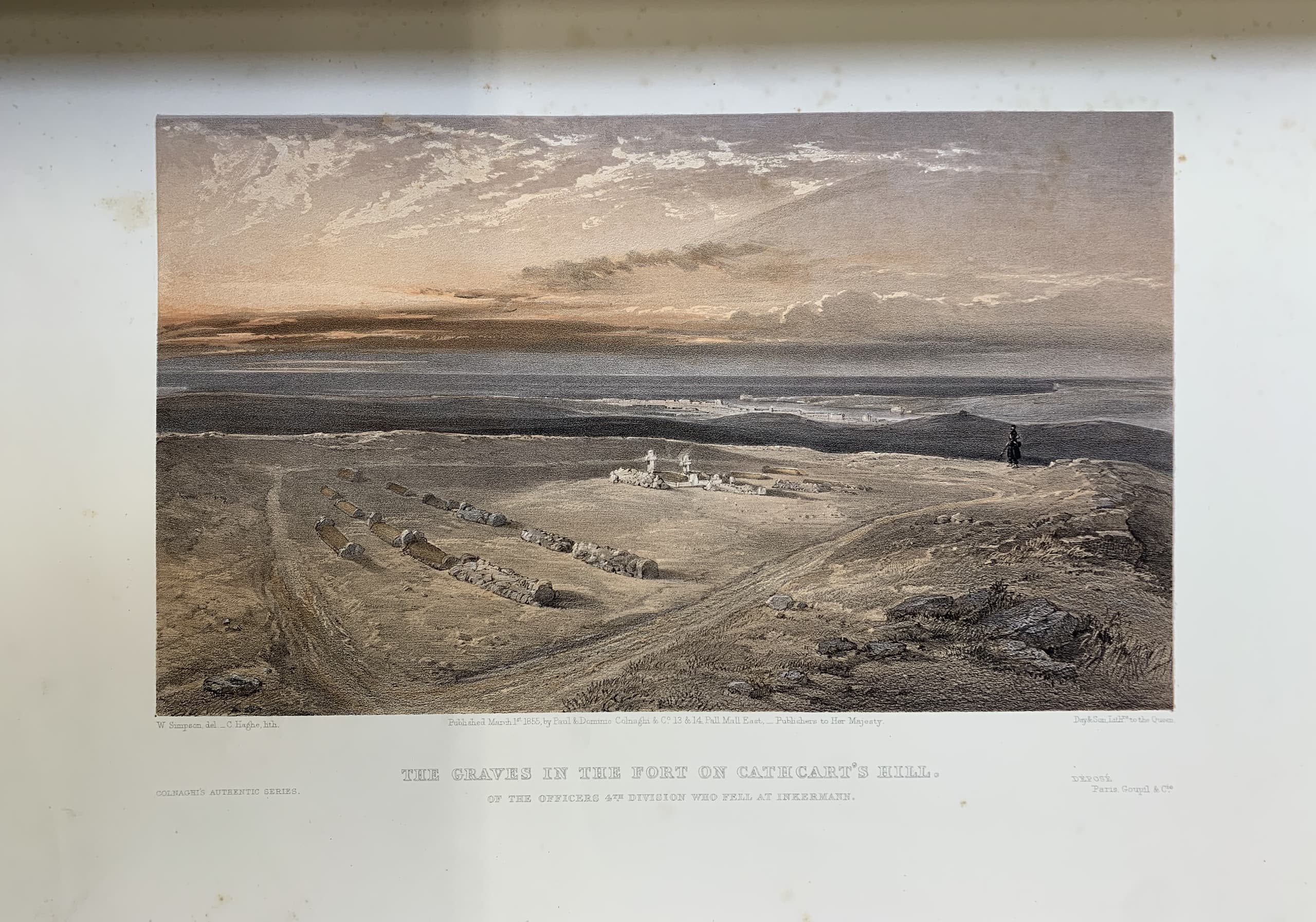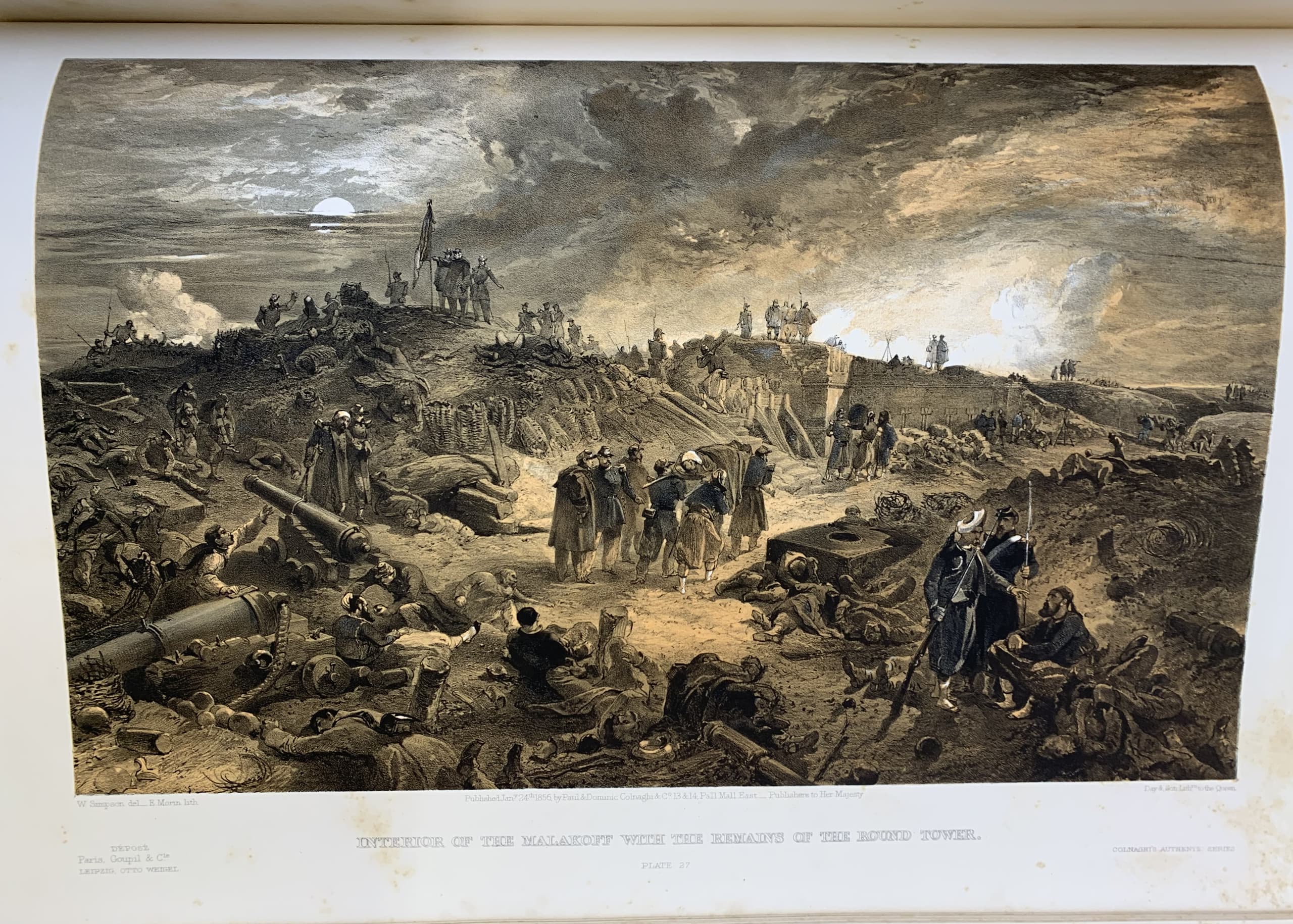 Additionally bound in: Colour lithograph ‘Spring in Crimea’, two folding panoramas from the original Colnaga series. The first is hand-coloured, ‘The city and harbour of Sevastopol before the siege, taken from the watchtower in the centre of the city’ by Carlo Bossoli. The second is a panorama by E.T. Dolby, ‘Fortifications of Sveaborg and the city of Helsingfors, Russian fortresses on the Baltic Sea’ (the torn sheet has been glued back together).