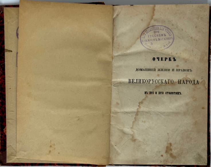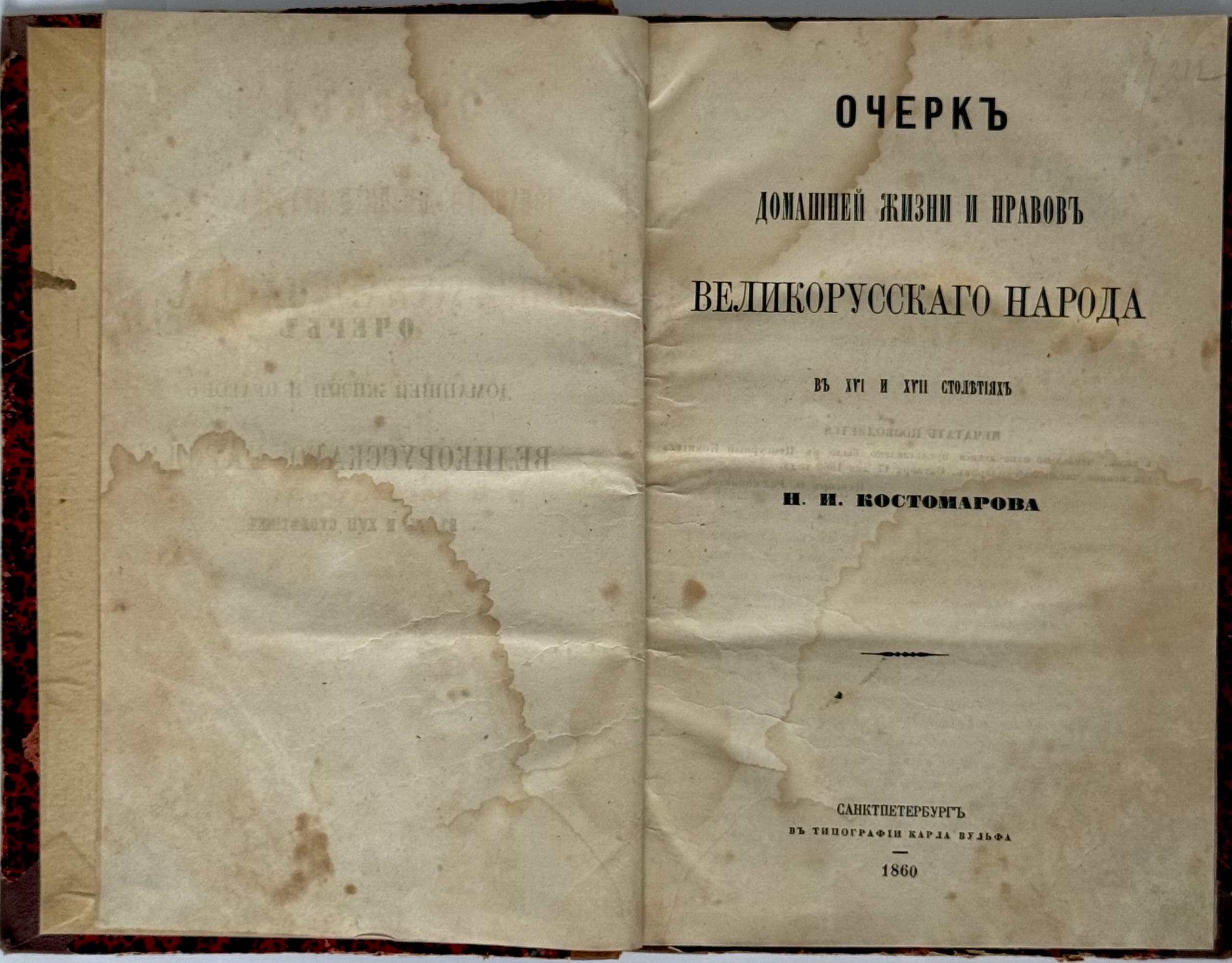 KOSTOMAROV NIKOLAI IVANOVICH (1817–1885) Ocherk domashney zhizni i nravov velikorusskogo naroda v XVI i XVII stoletiyakh [‘An Essay on the Domestic Life and Customs of the Great Russian People in the 16th and 17th Centuries’] Sankt-Peterburg: tip. K. Vul’fa, 1860. – 214, [1] s.; 21.5 × 15 cm.