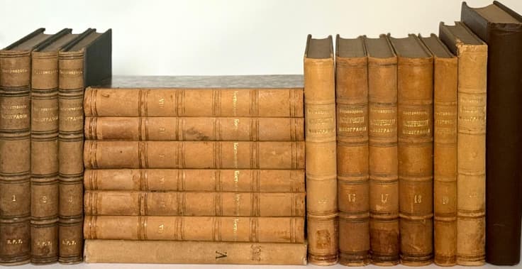 With mixed binding: volumes differ in their binding design. Contemporary half-leather bindings, with one blind-stamped leather binding (Volumes 15 and 16). In good condition. Wear to bindings , minor tears in the leather spines. Super ex-libris ‘V.R.U.’ in the lower field of the spines (Vol. 1-3), pre-revolutionary stamps.