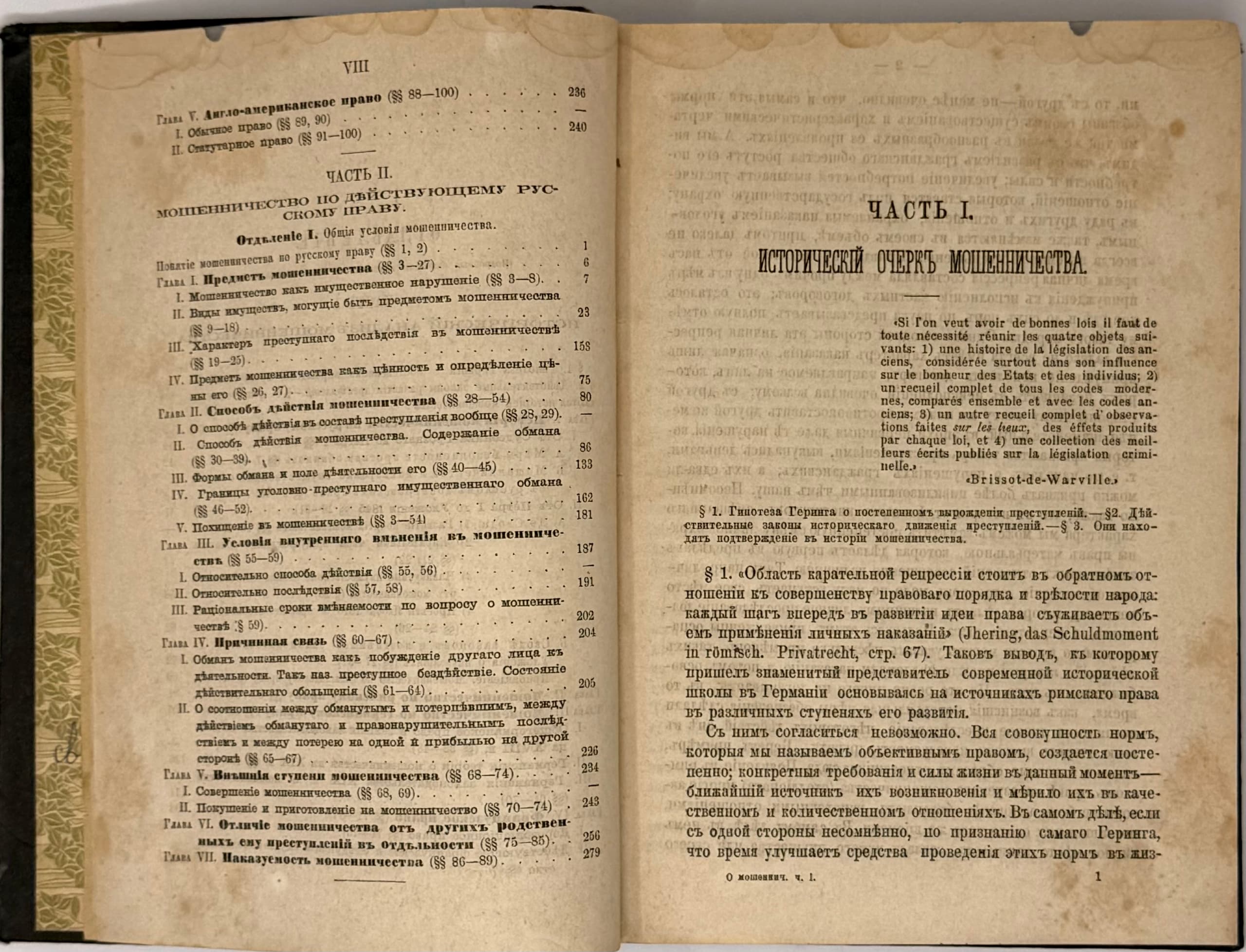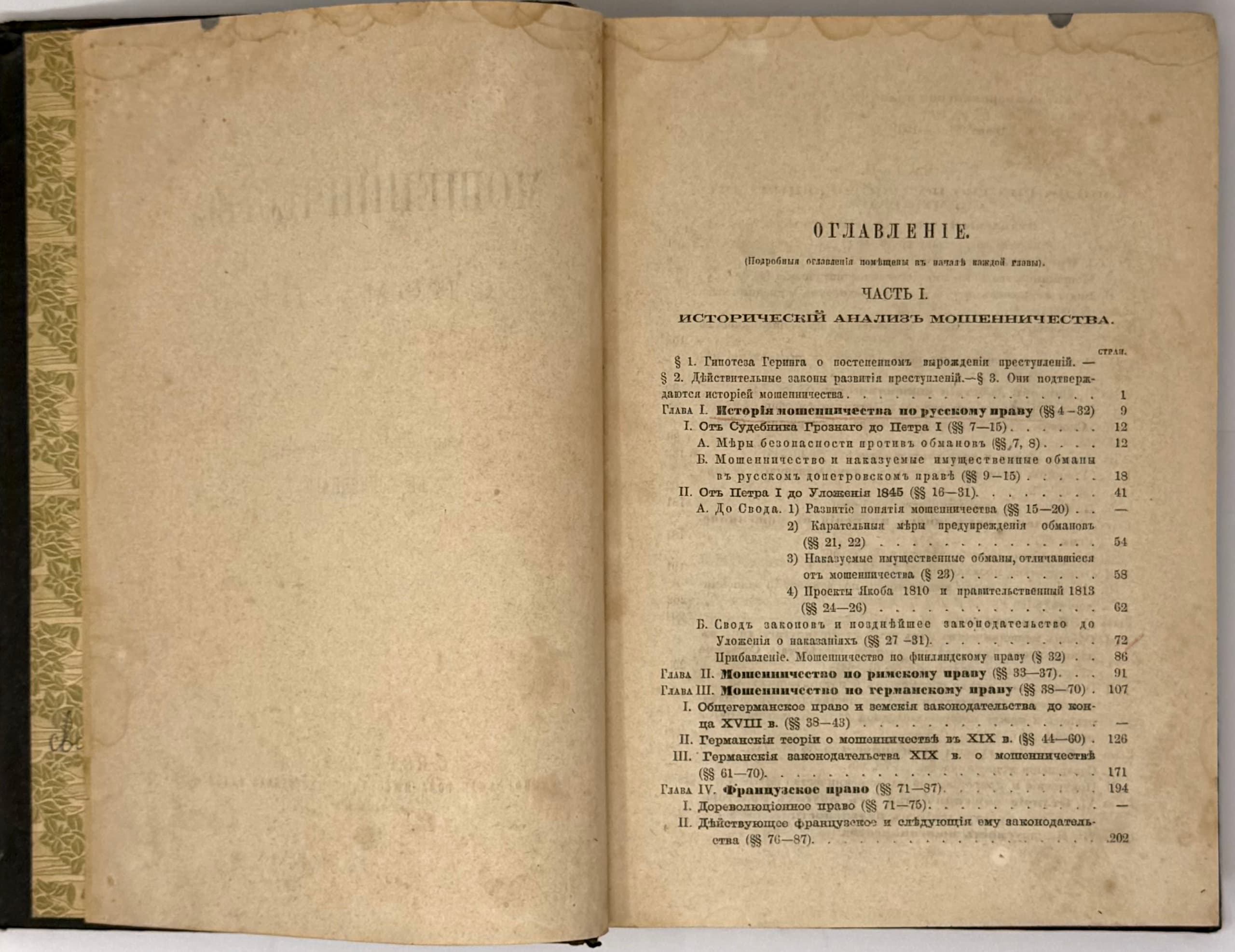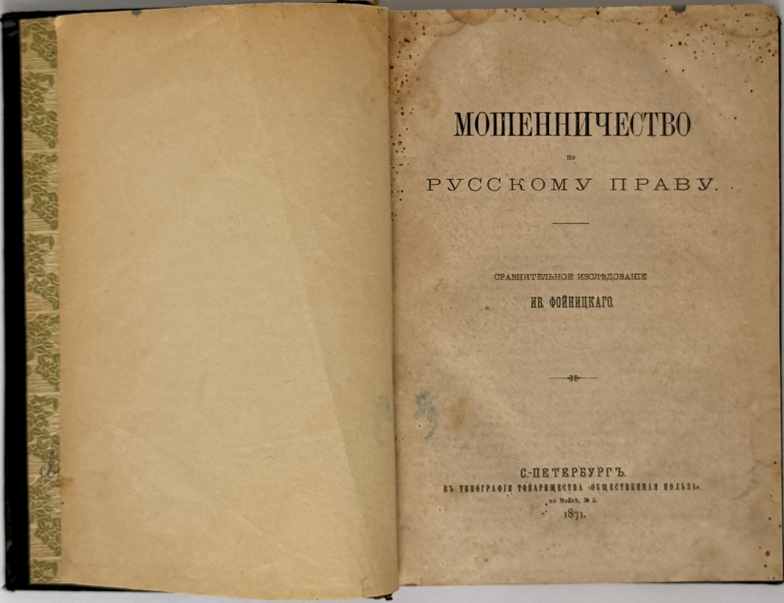 Moshennichestvo po russkomu pravu: sravnitel’noe issledovanie Iv. Foynitskogo [‘Fraud under Russian Law: A Comparative Study’] Moskva: tip. t-va “Obshchestvennaya pol’za”, 1871. – VIII, 256, 289 s.; 21.5 × 15 cm.