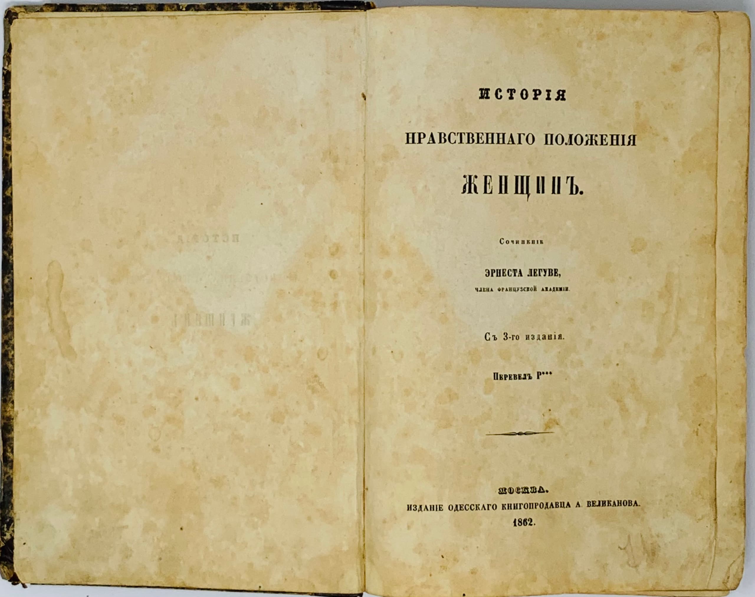 LEGOUVÉ ERNEST (1807-1903) Istoriya nravstvennogo polozheniya zhenshchin; per. s 3-go izd. R* [The History of the Moral Condition of Women; translated from the 3rd edition by R***] M.: Izdatelstvo Odesskogo knigoprodavtsa A. Velikanova, 1862. – 389, [1], II pages; 21.3 × 14.5 cm. in Russian