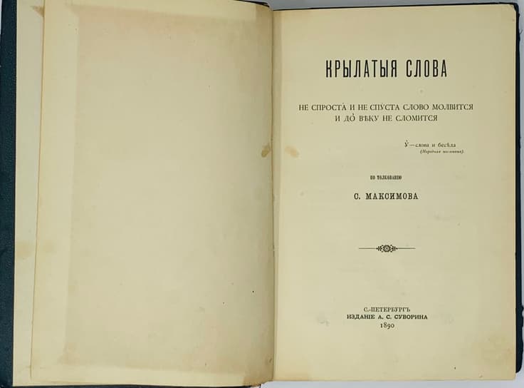 MAKSIMOV SERGEY (1831-1901) Krylatye slova: Ne sprosta i ne spusta slovo molvitsya i do veku ne slomitsya: Po tolkovaniyu S. Maksimova SPb.: izd. A.S. Suvorin, 1890. – XVI, 486 pages; 19 cm. in Russian