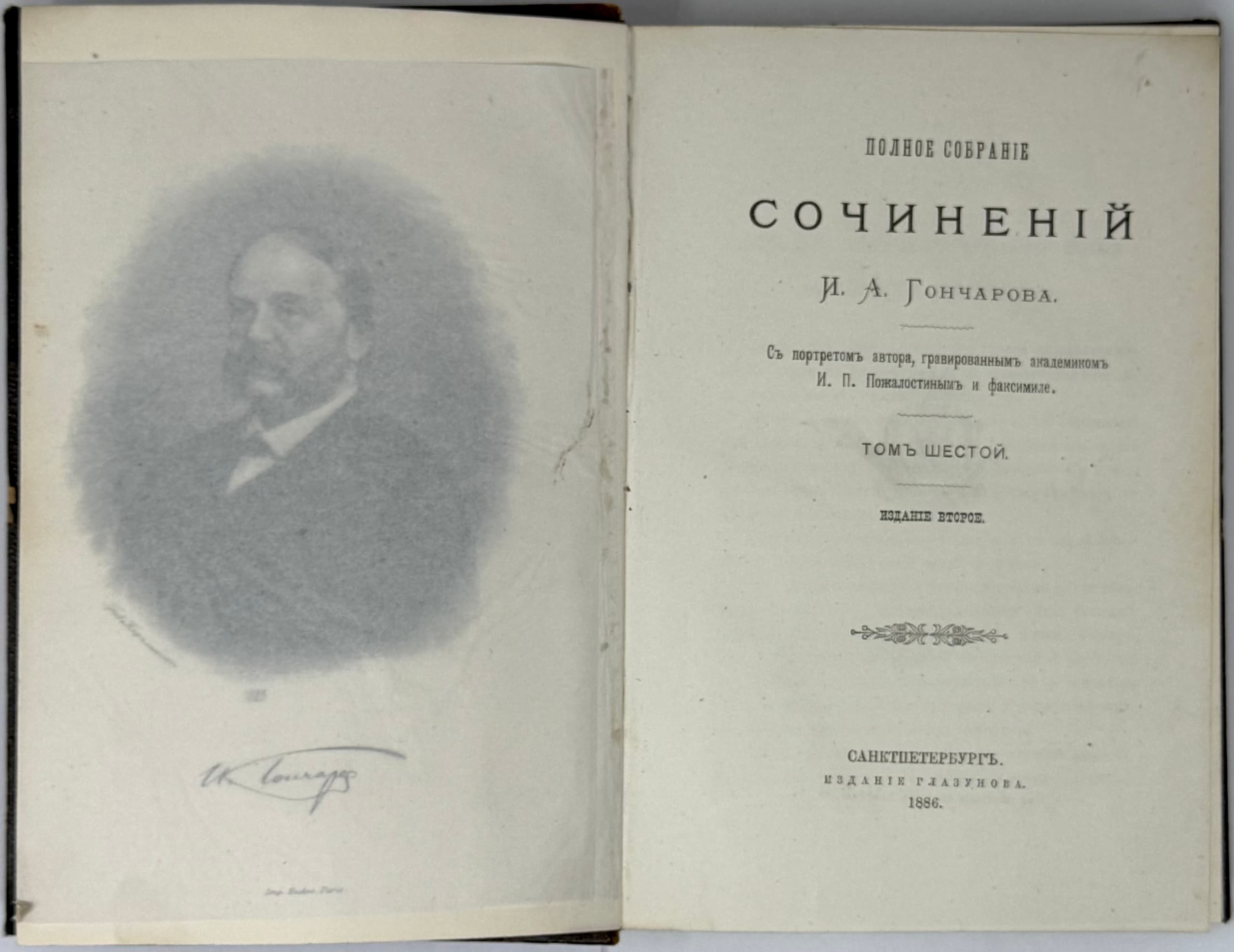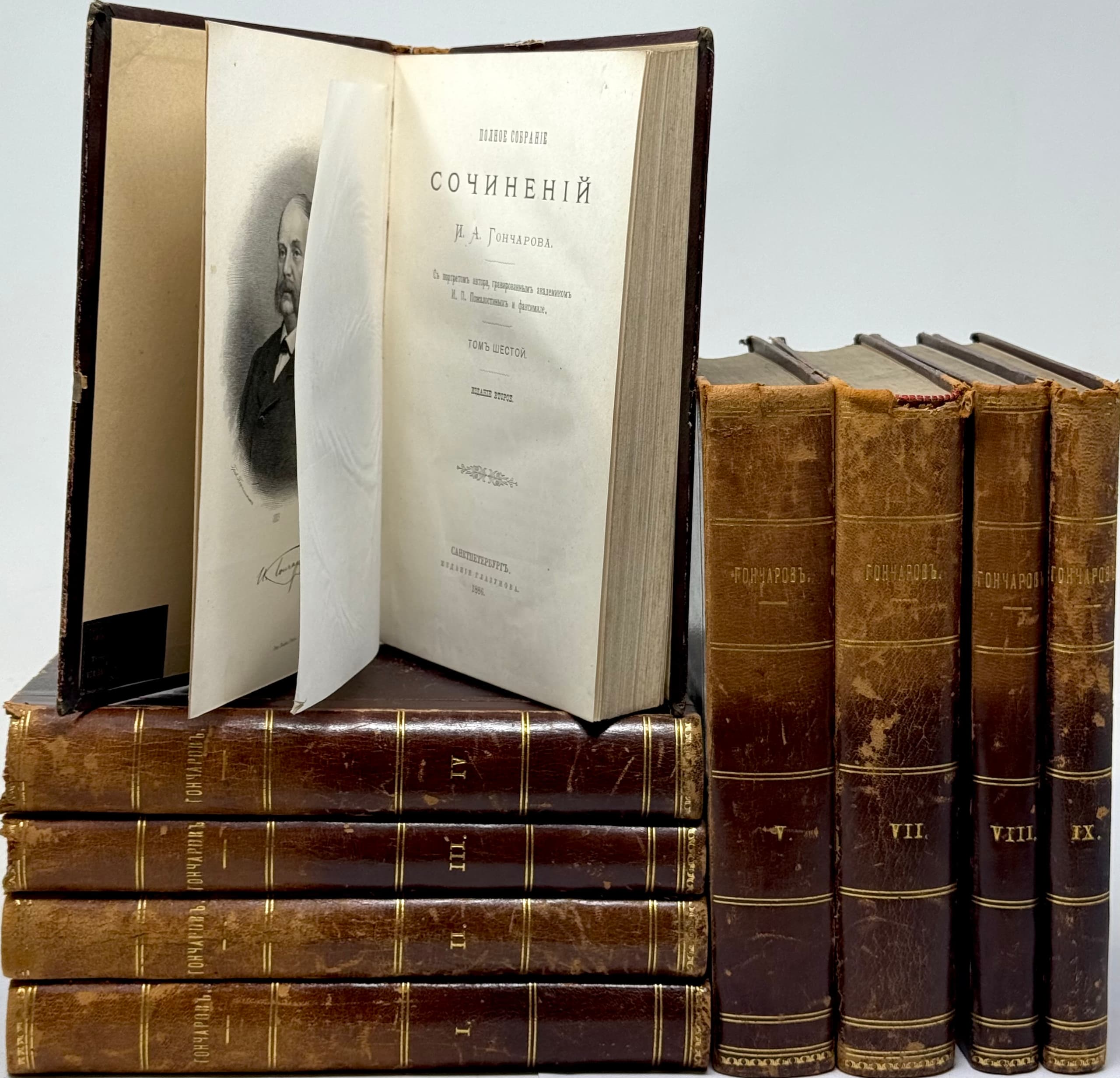 GONCHAROV IVAN (1812–1891) ‘Polnoe sobranie sochineniy I.A. Goncharova’ [‘Complete Works of I.A. Goncharov’] With a portrait of the author engraved by Academician I.P. Pozhalostin and facsimiles. – 2nd ed.: [in 9 vols.]. St. Petersburg: Izd. Glazunova, 1886–1887.