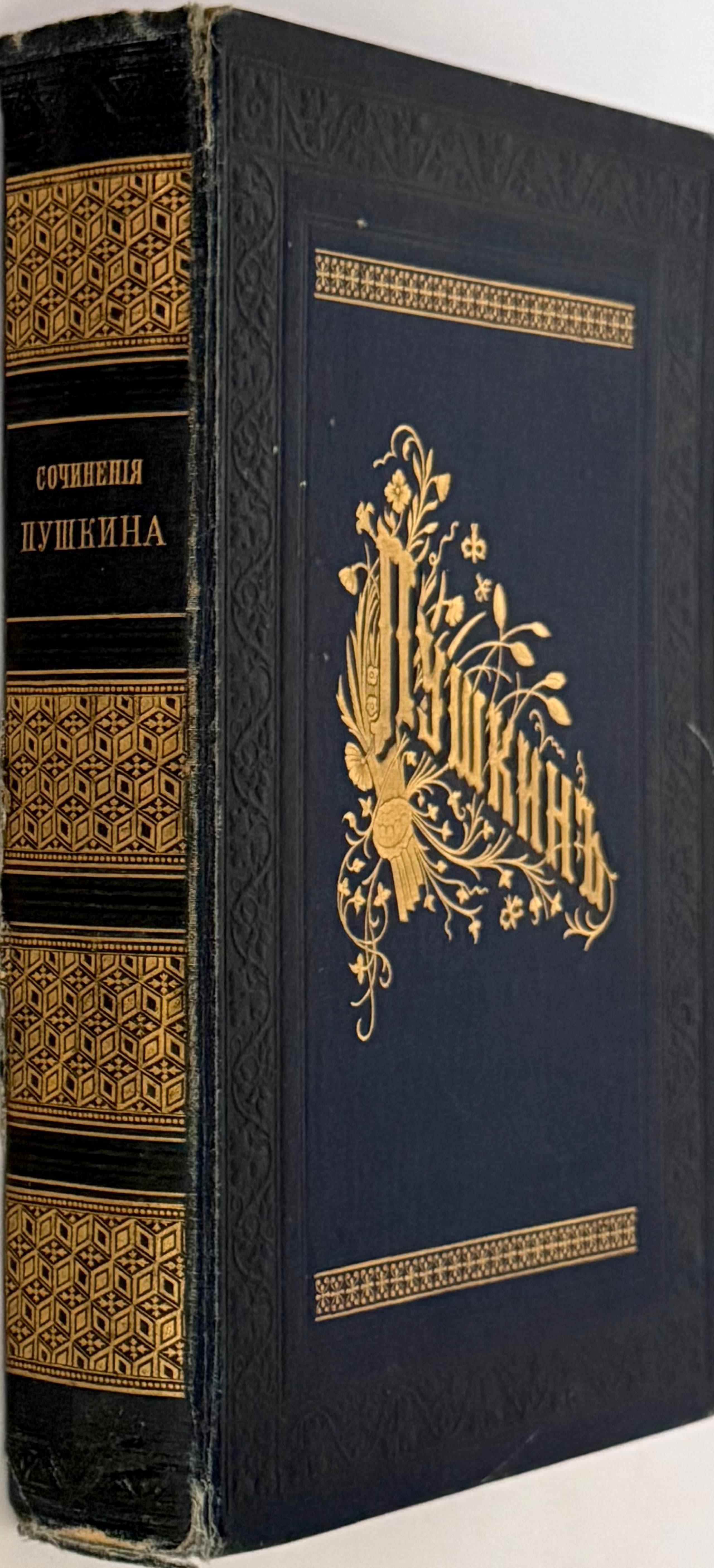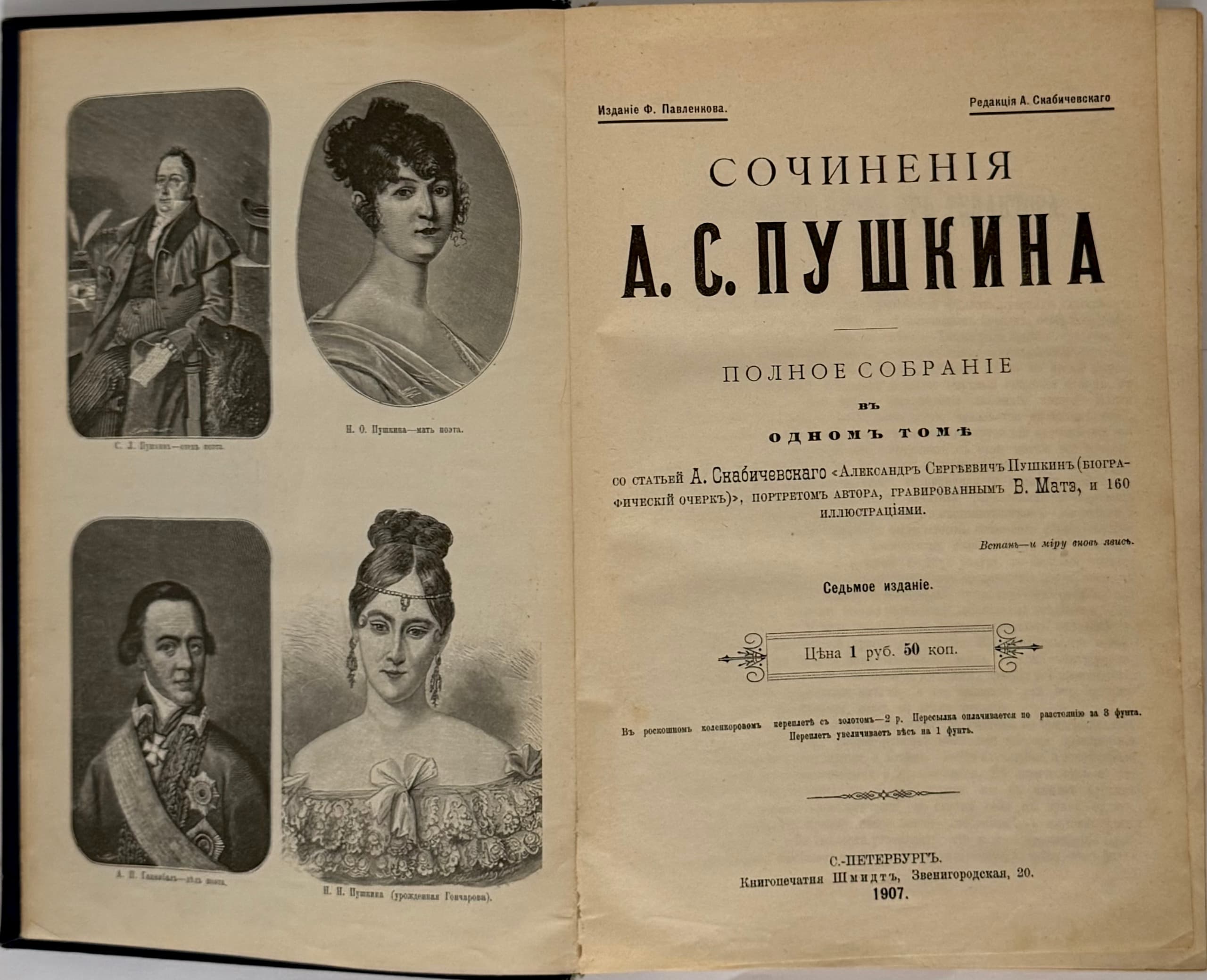 PUSHKIN ALEXANDER (1799-1837) Sochineniia A.S. Pushkina: polnoe sobranie v odnom tome. So stat’ei A. Skabichevskogo ‘Aleksandr Sergeevich Pushkin (biograficheskii ocherk)’. [Works of A.S. Pushkin: Complete collection in one volume. With an article by A. Skabichevsky, “Alexander Sergeevich Pushkin (biographical sketch).”] – 7th ed. St. Petersburg:Izd. F. Pavlenkova; Knigopechatnia Shmidt, 1907.