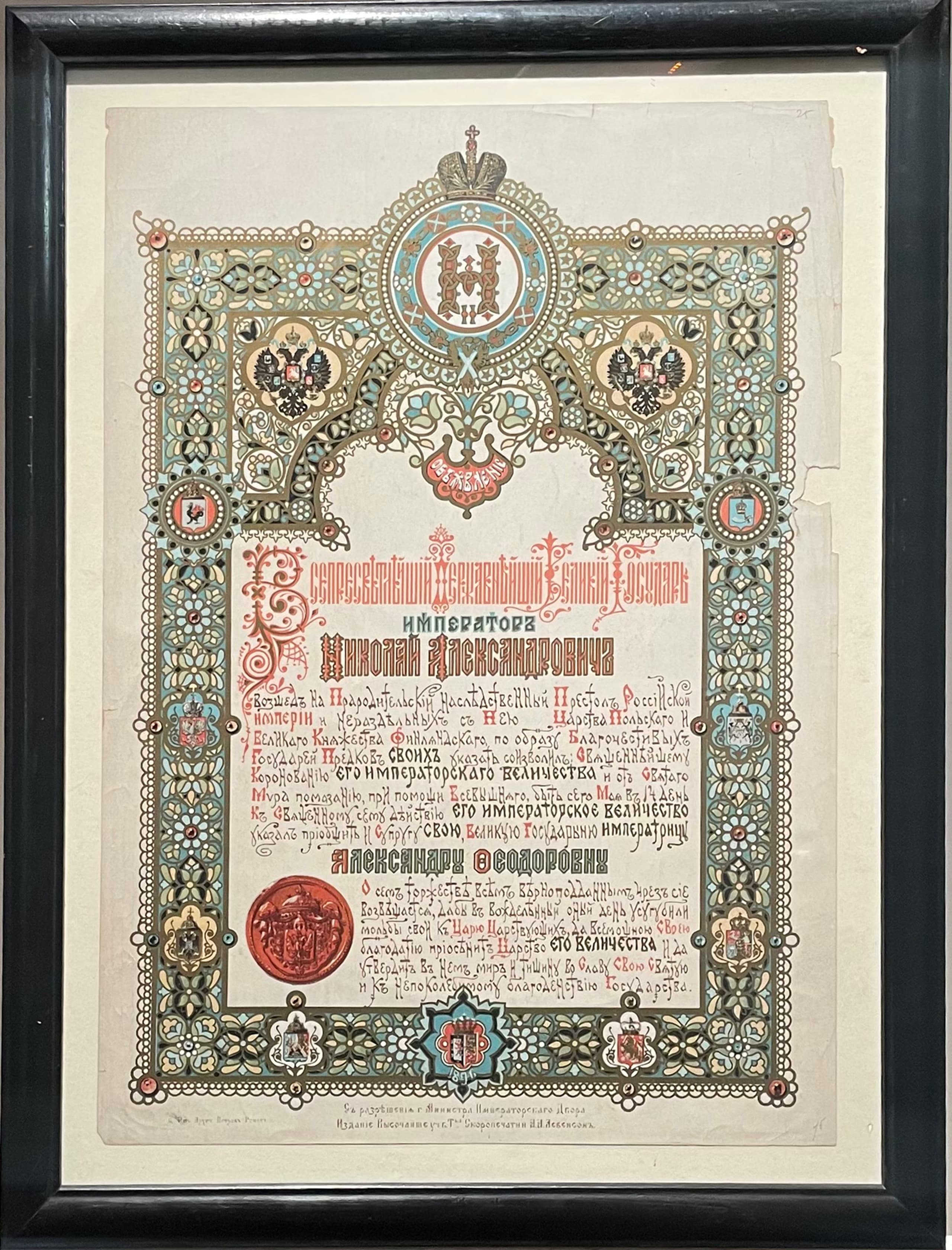 CORONATION OF NICHOLAS II AND ALEXANDRA FEDOROVNA (1896) Announcement of the coronation of Emperor Nicholas II and Empress Alexandra Feodorovna on May 14, 1896. Moscow: A.A. Levenson Printing Company, 1896. – [1] p.; 40x28 cm. Framed.