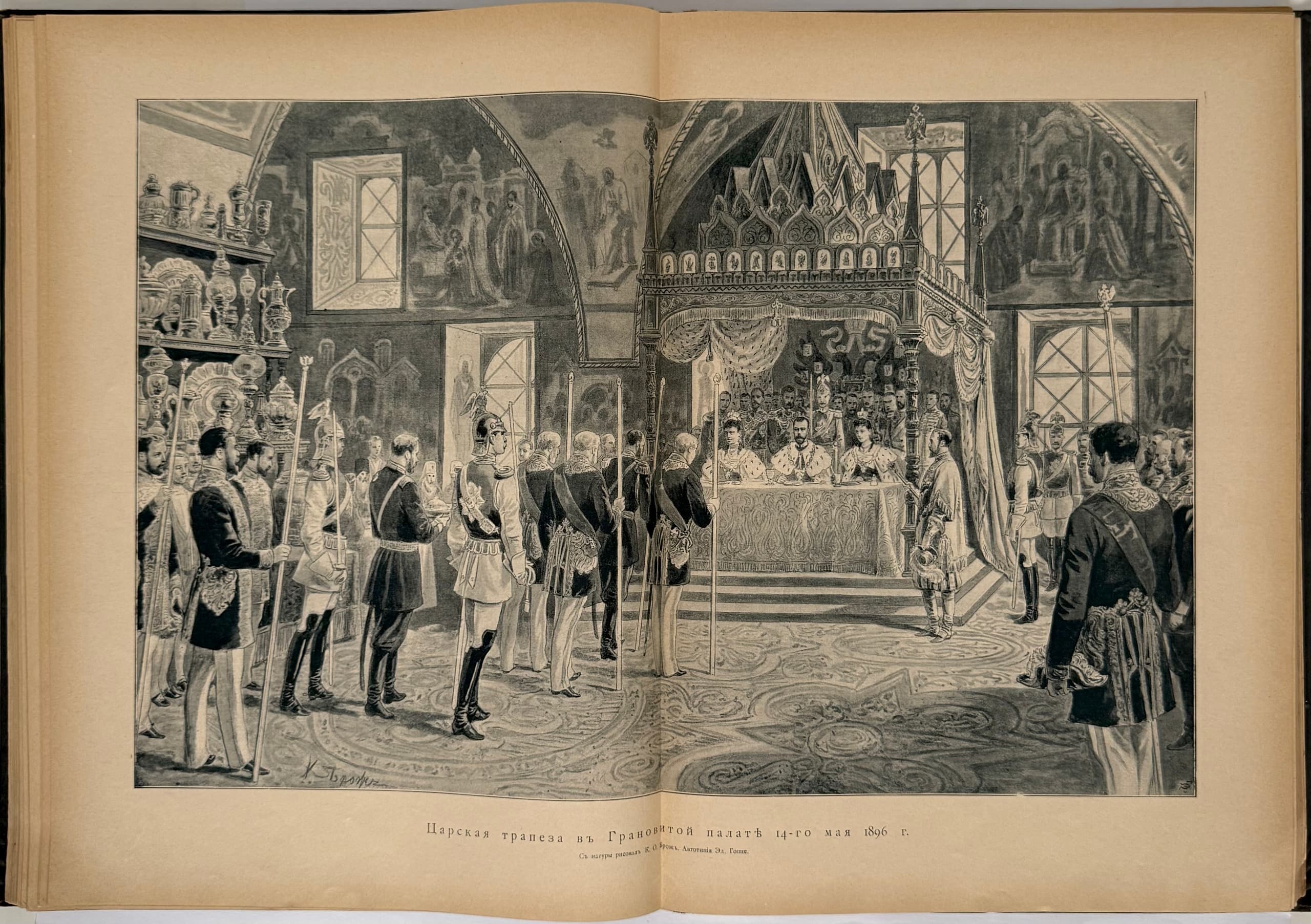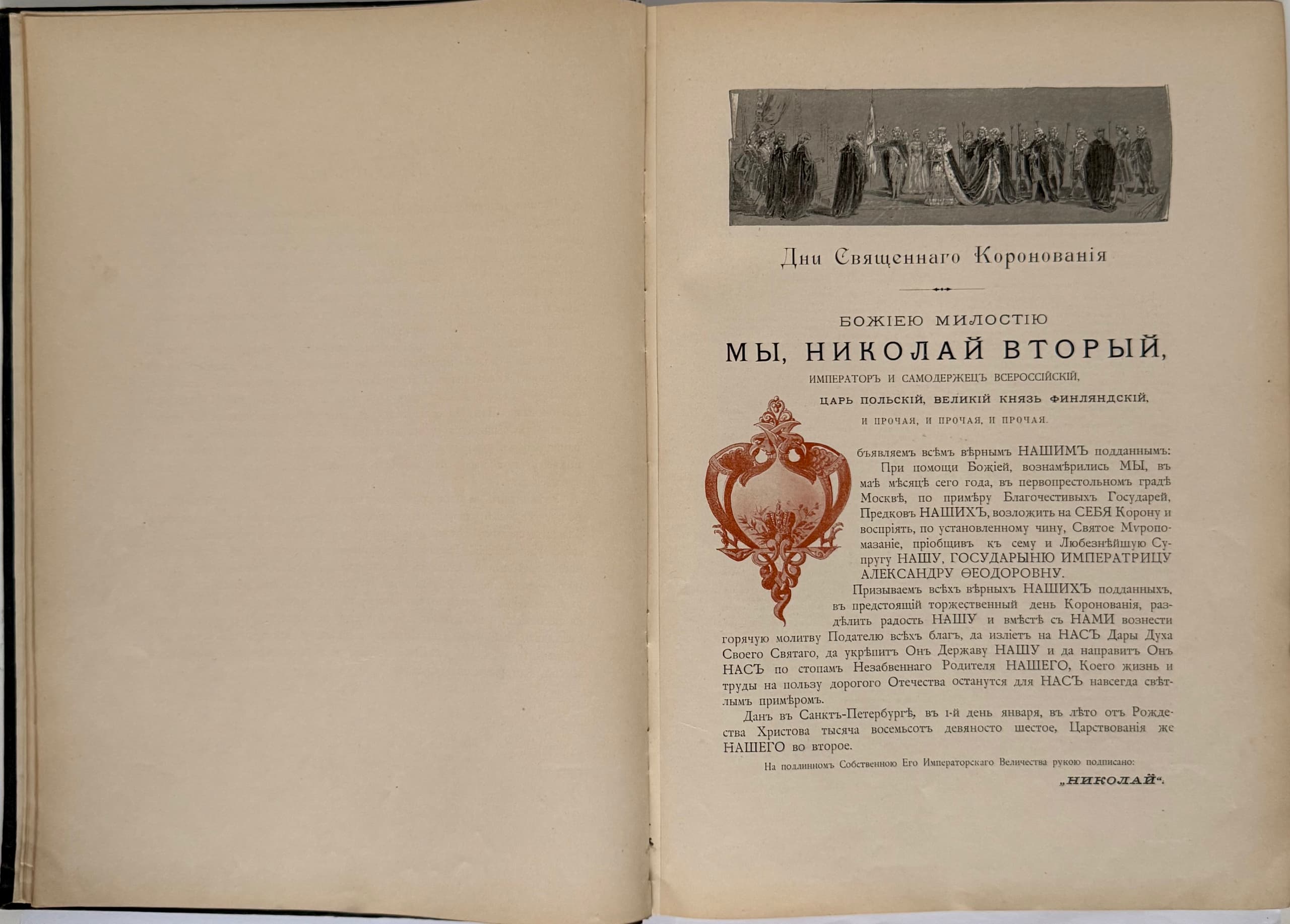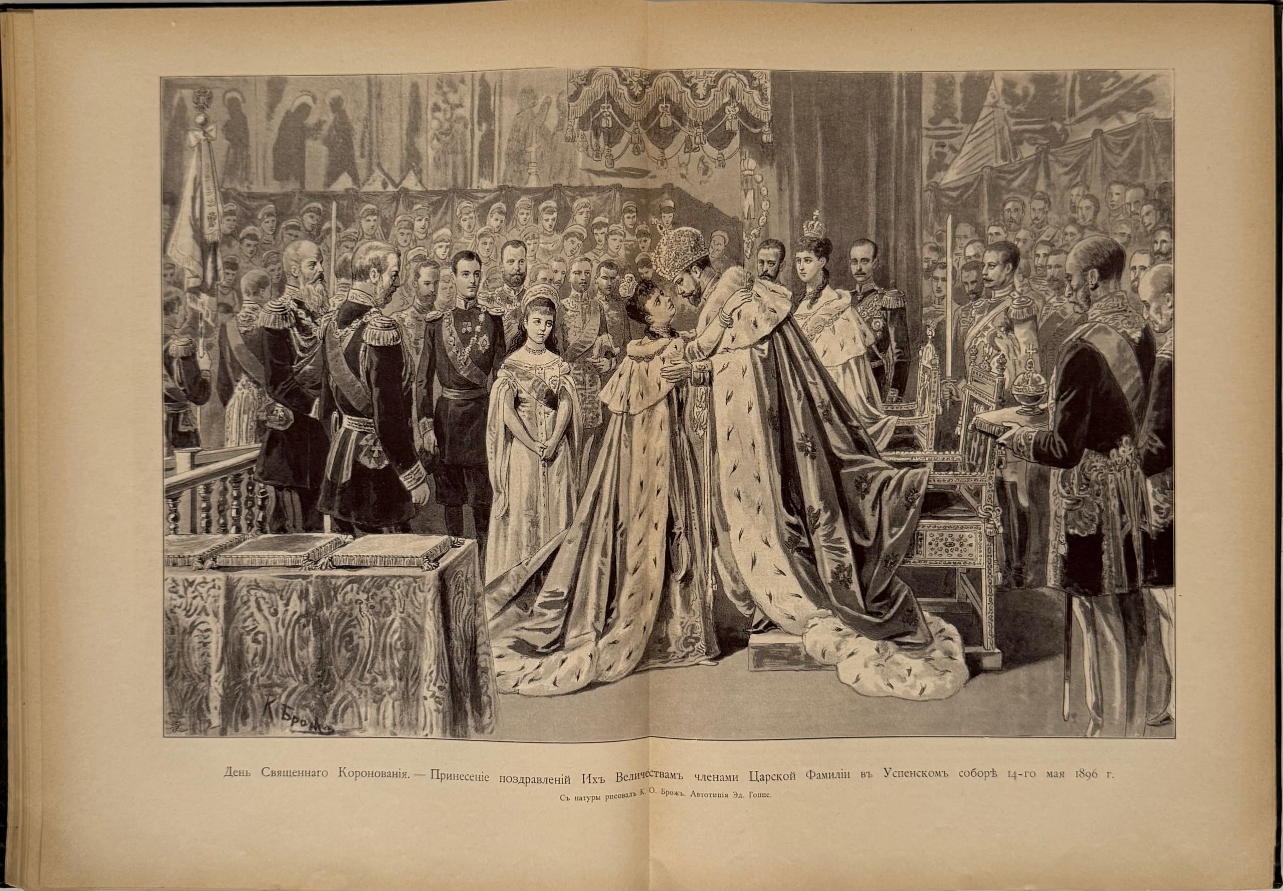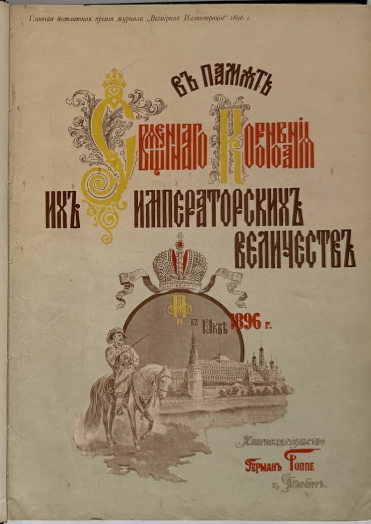 CORONATION OF NICHOLAS II V pamiat’ sviashchennogo koronovaniia ikh imperatorskikh velichestv Nikolaia Aleksandrovicha i Aleksandry Fedorovny 14 maia 1896 goda. [In memory of the sacred coronation of Their Imperial Majesties Nicholas Alexandrovich and Alexandra Feodorovna on May 14, 1896.] St. Petersburg: Kn-vo G. Goppe, 1896.