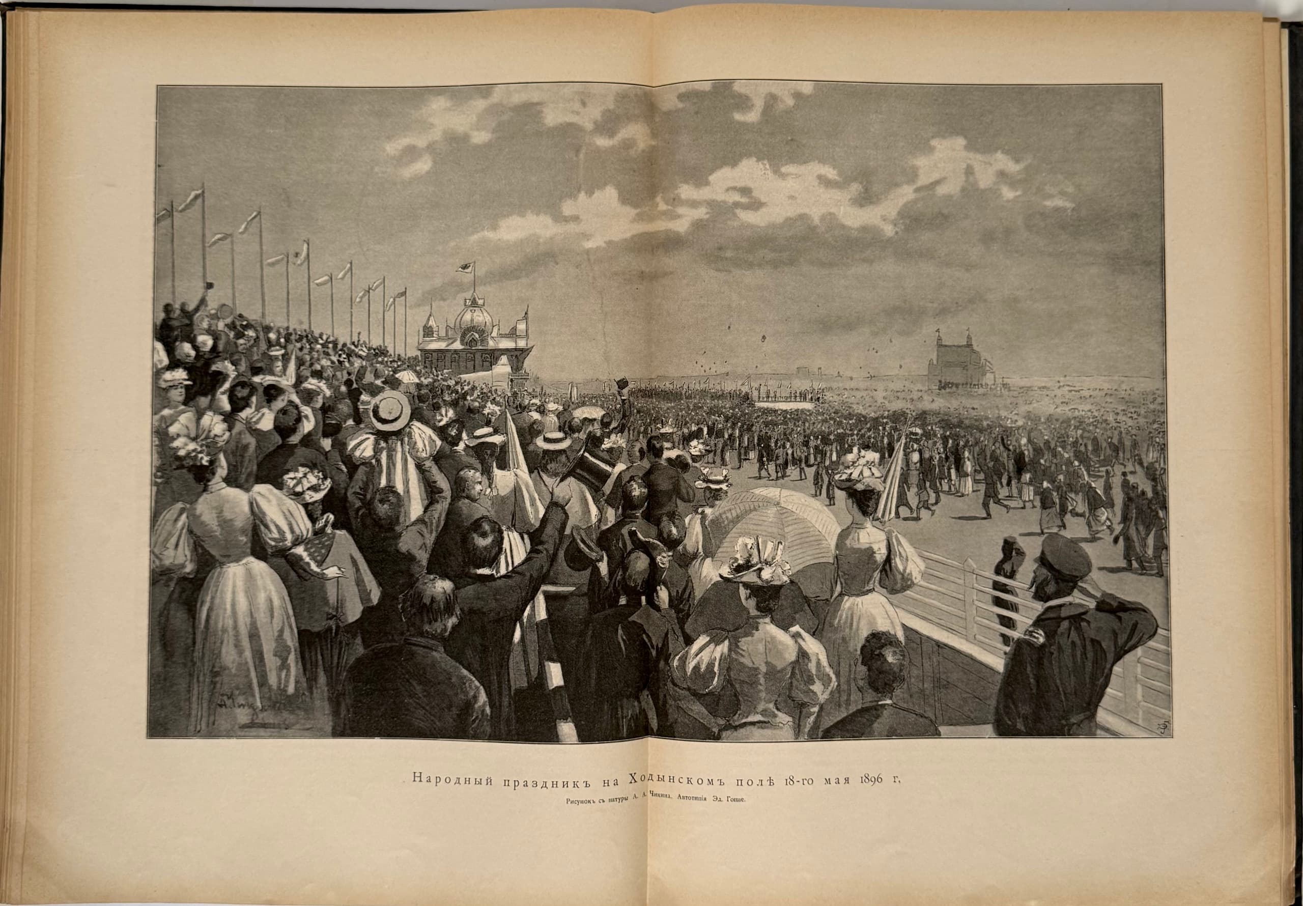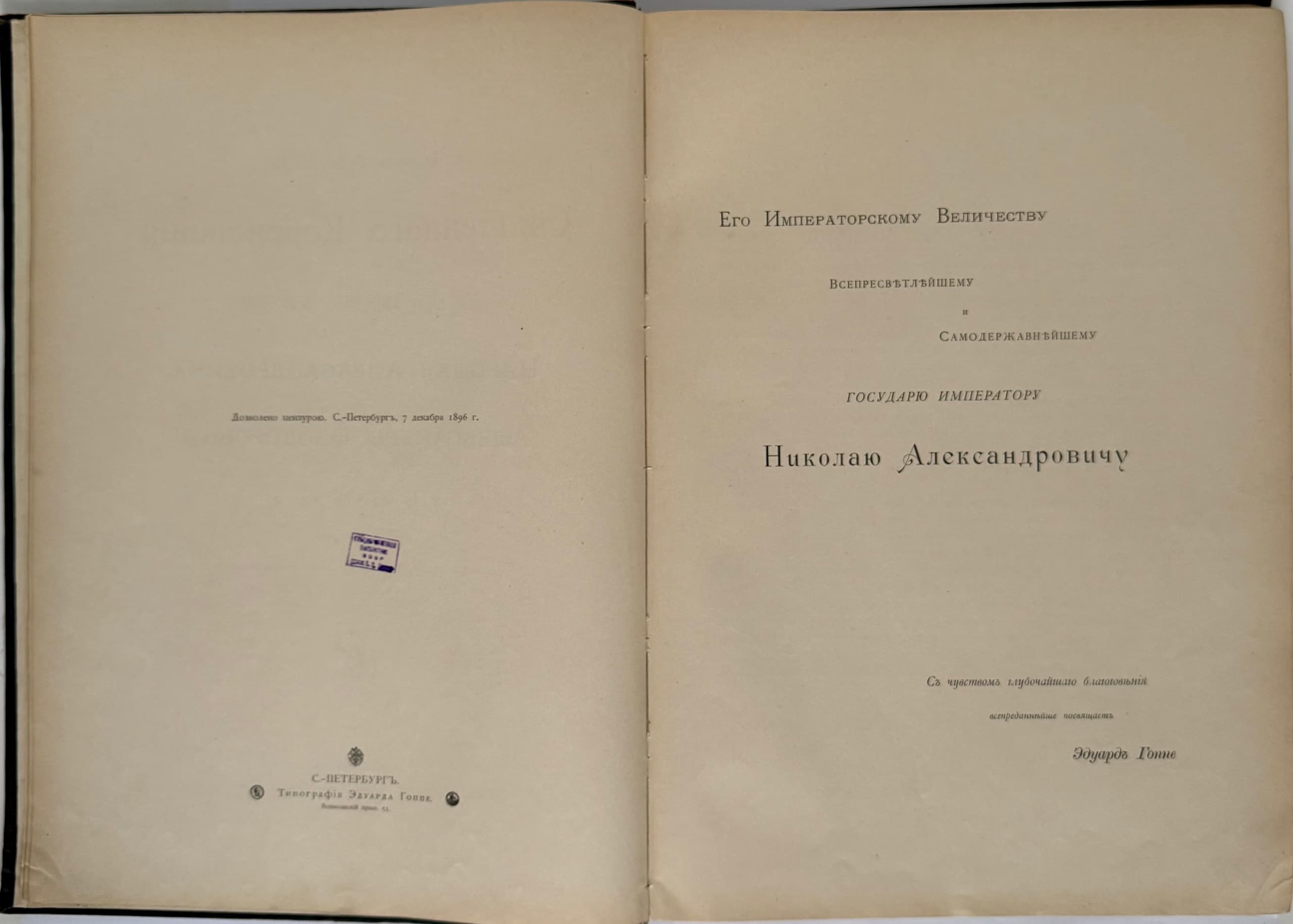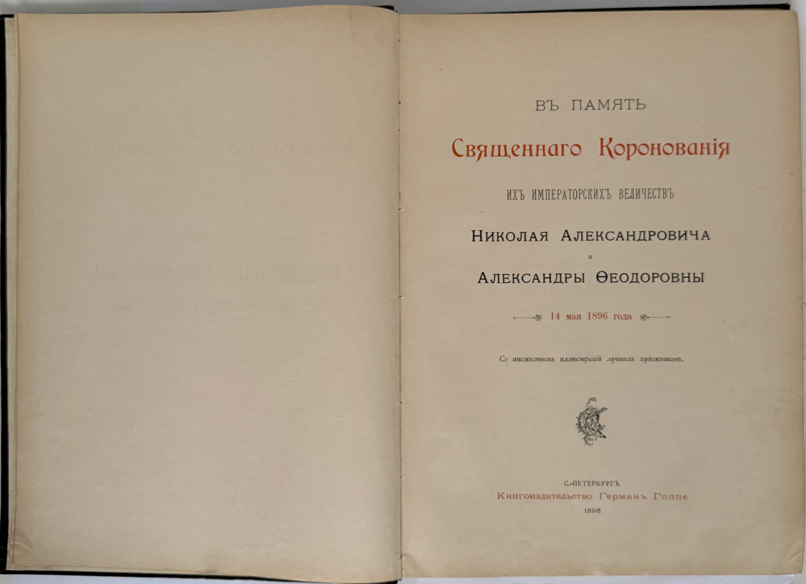 CORONATION OF NICHOLAS II V pamiat’ sviashchennogo koronovaniia ikh imperatorskikh velichestv Nikolaia Aleksandrovicha i Aleksandry Fedorovny 14 maia 1896 goda. [In memory of the sacred coronation of Their Imperial Majesties Nicholas Alexandrovich and Alexandra Feodorovna on May 14, 1896.] St. Petersburg: Kn-vo G. Goppe, 1896.