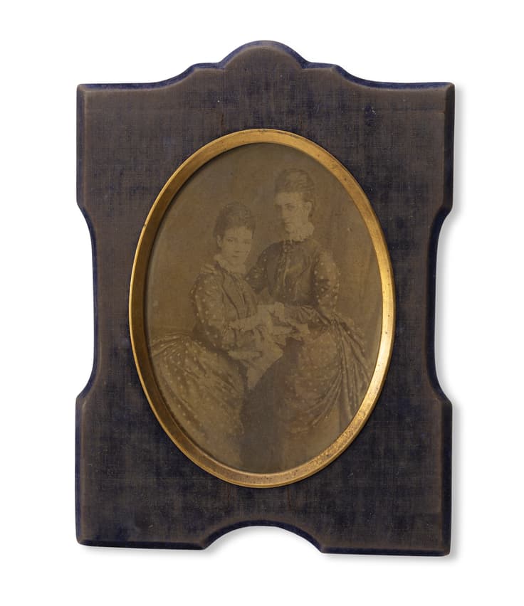 Three-quarter length, both wearing matching polka-dot dresses and embracing albumen print, the mount with printed photographer's signature, oval, 13.5 × 10 cm contemporary purple velvet frame with glazed gilt inset