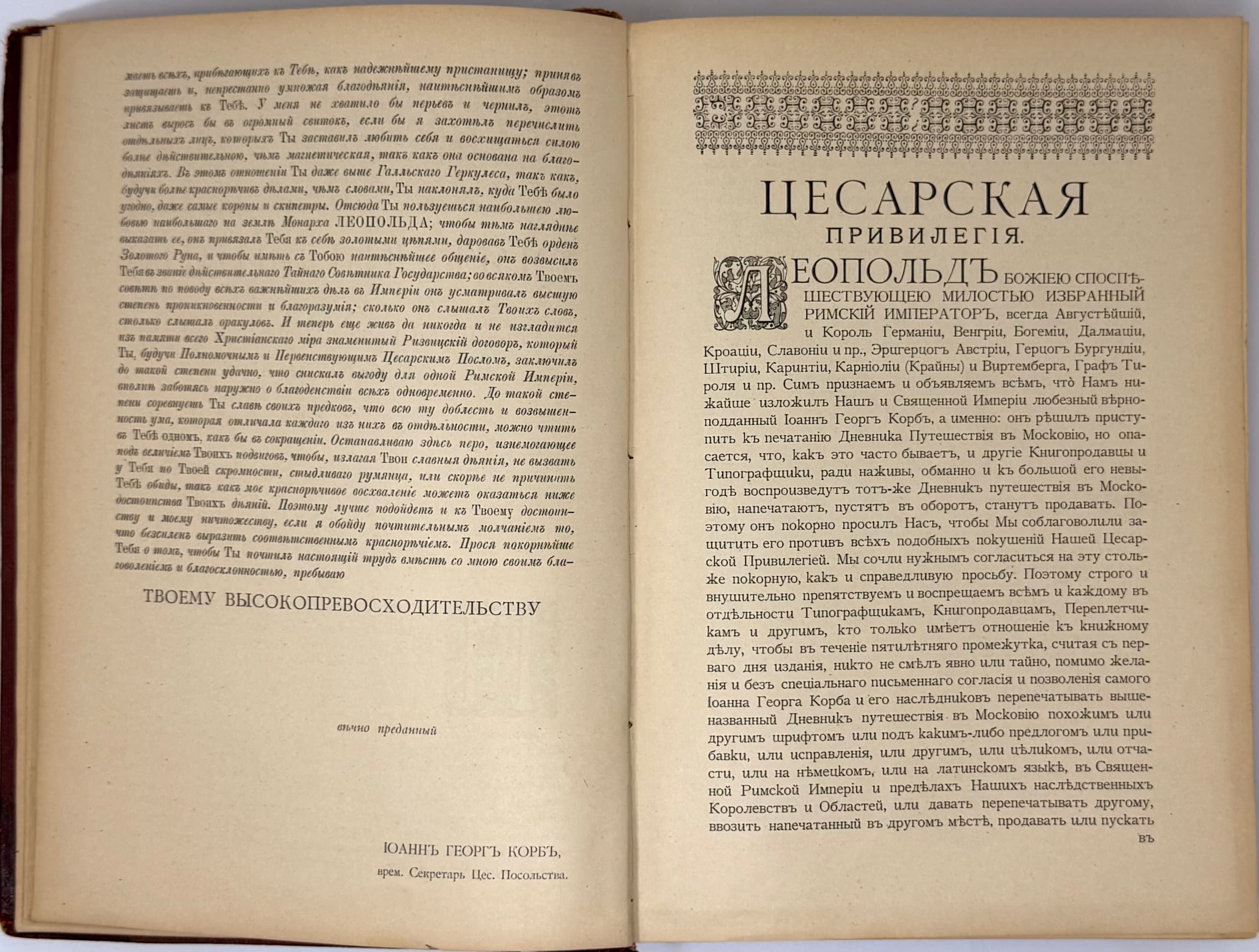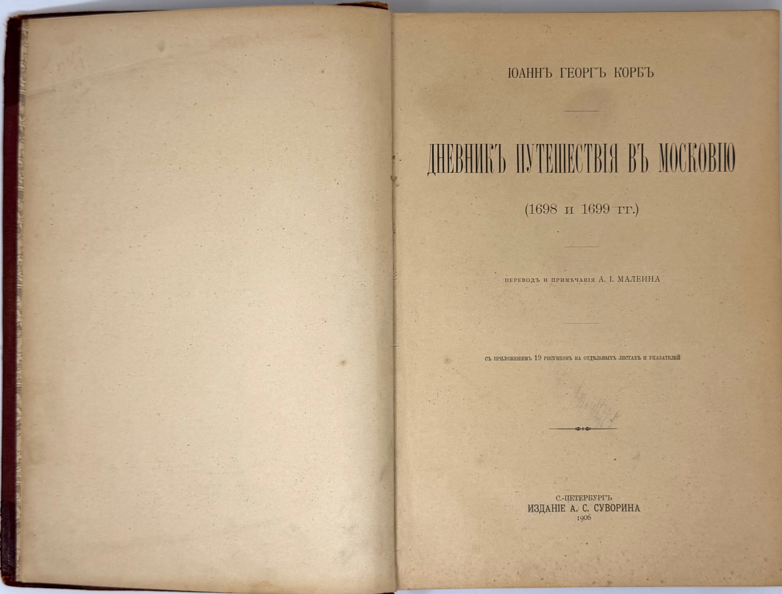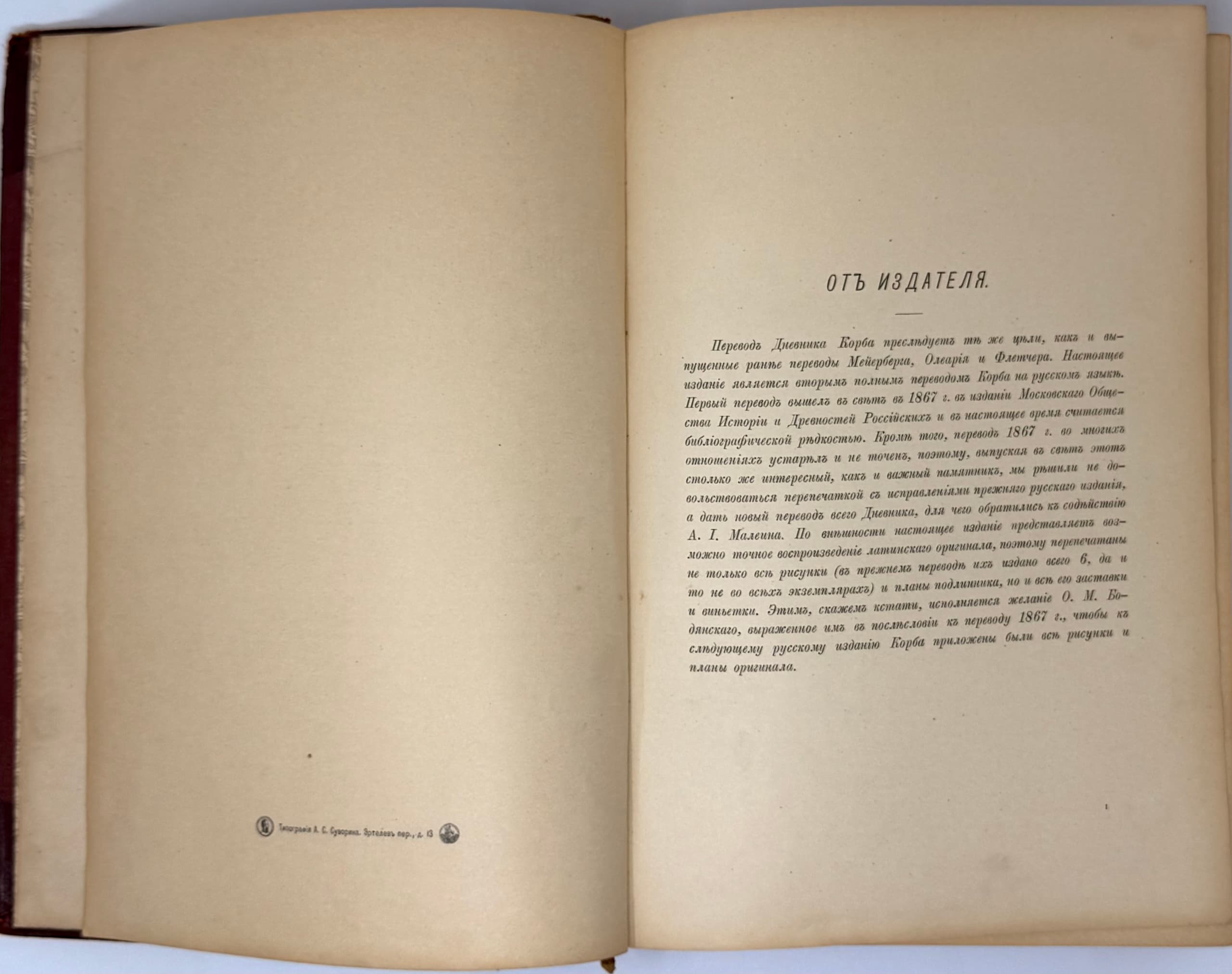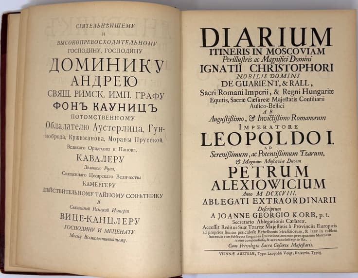 The ‘Suvorin’ edition of 1906 is the second edition of the Korb’s translation into Russian and differs by a more accurate reproduction of the Latin original. Besides, the book is distinguished by a sound printing performance: printed on thick vellum paper, perfectly reproduces all the engravings of the original edition, including ‘the Emblem of the Russian Tsardom and its regions’ and the rarest picture of ‘Execution of the Streltsy in 1698.’