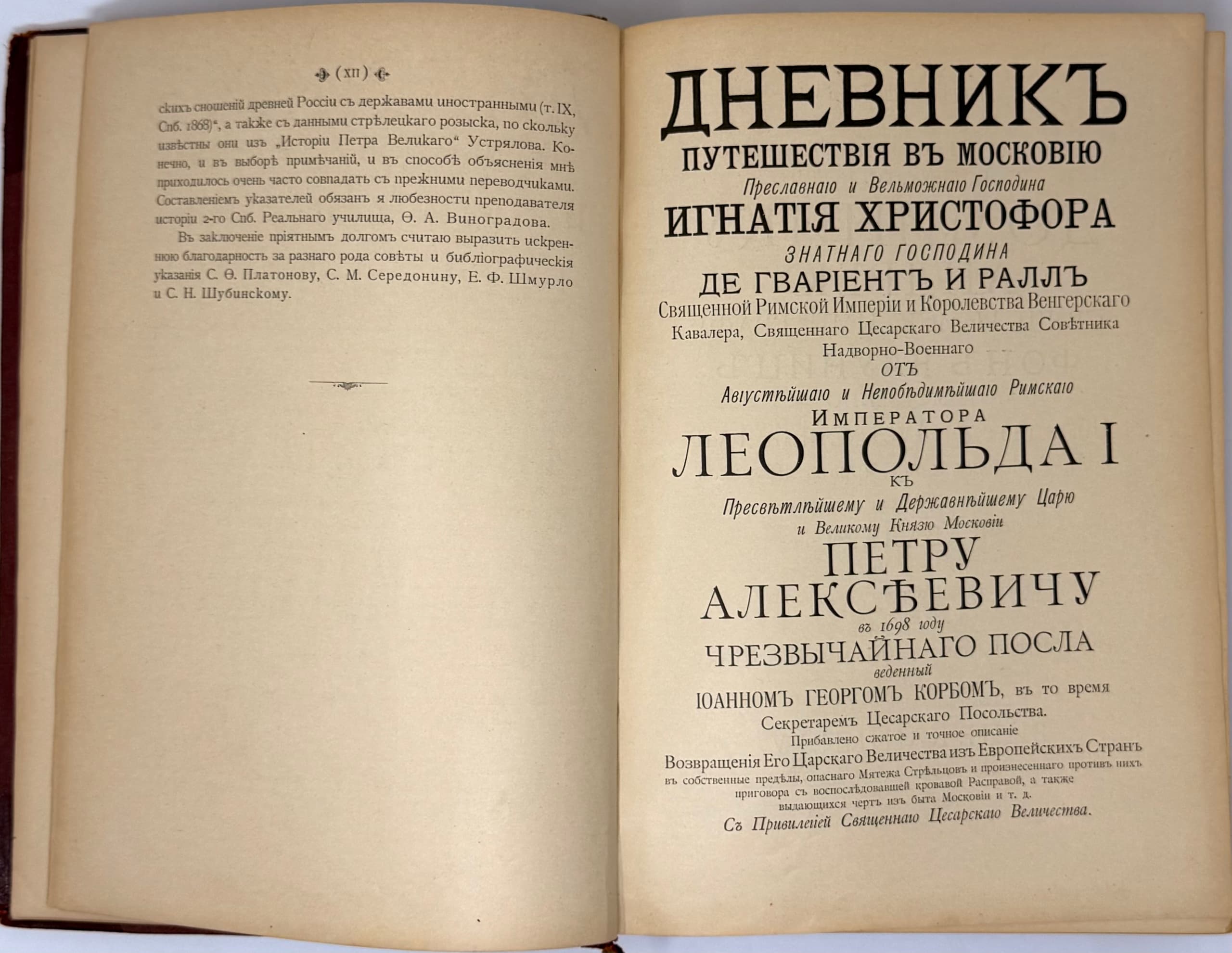 KORB JOHANN GEORG (1670-1741) Diary of a journey to Muscovy (1698 and 1699 years); trans. and notes. of A. I. Malein. SPb.: ed. A. S. Suvorin, 1906.