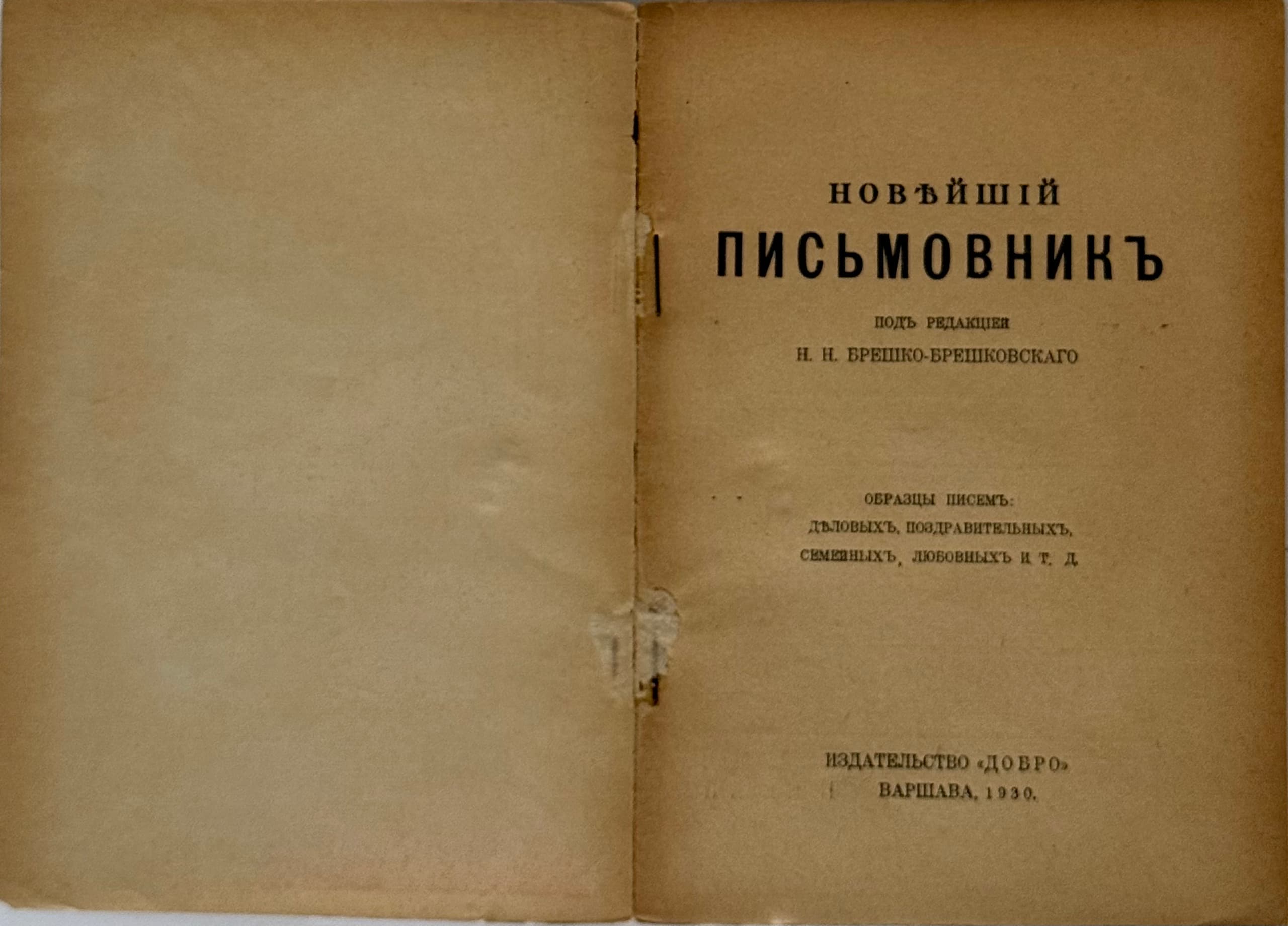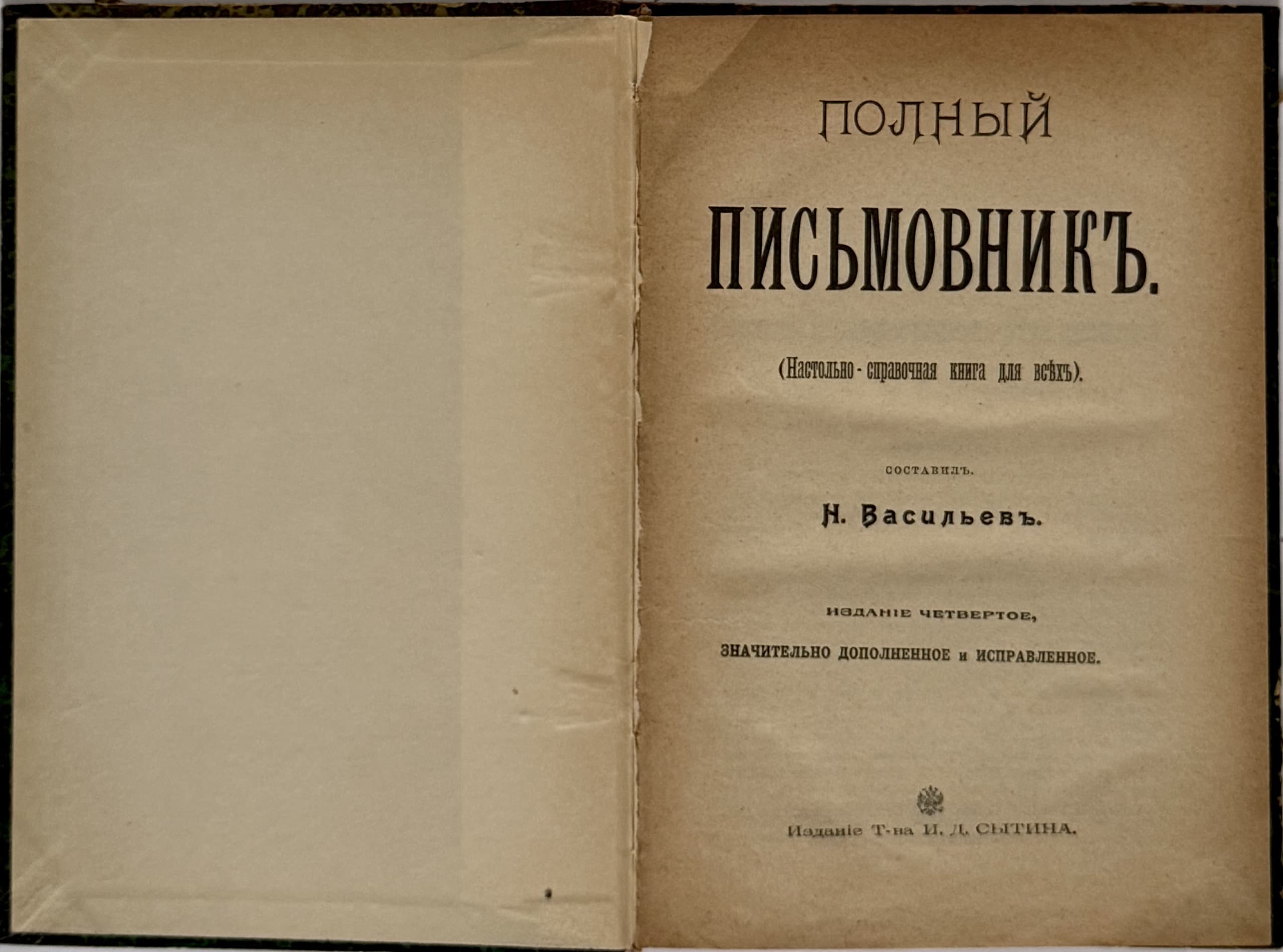 Polnyi pis’movnik: (Nastol’no-spravochnaia kniga dlia vsekh) [Complete Correspondence: (A Reference Book for Everyone] – 4th ed., significantly expanded and revised. Moscow: -vo I.D. Sytina [1907]. – 248, VIII pp.; 23x18 cm.