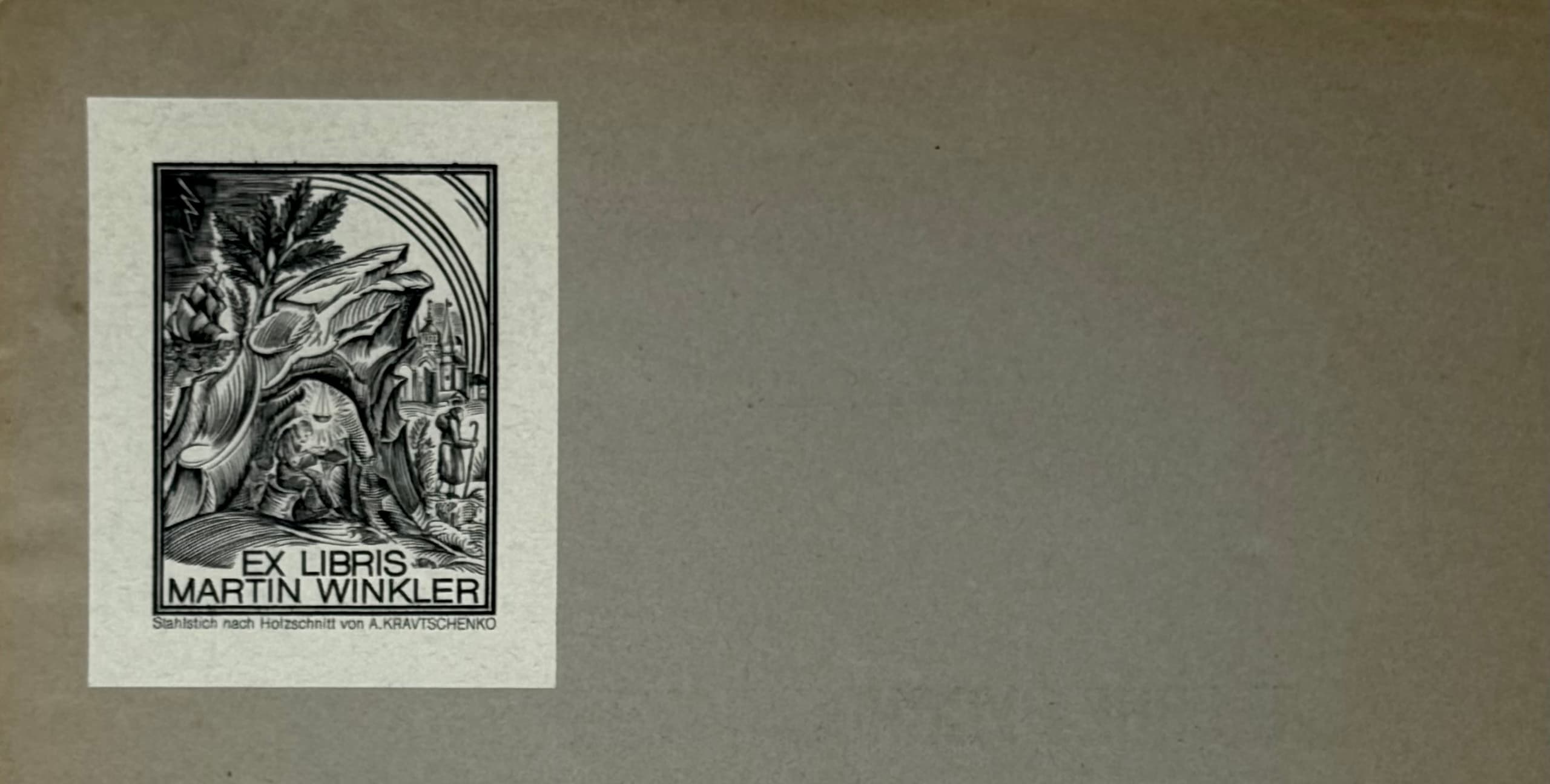 In a publisher’s paper cover. Good condition. Fold mark, tears on the spine, discoloration of the paper at the edges of the cover. Engraved bookplate by Martin Winkler, designed by A. Kravchenko, on the inside front cover.