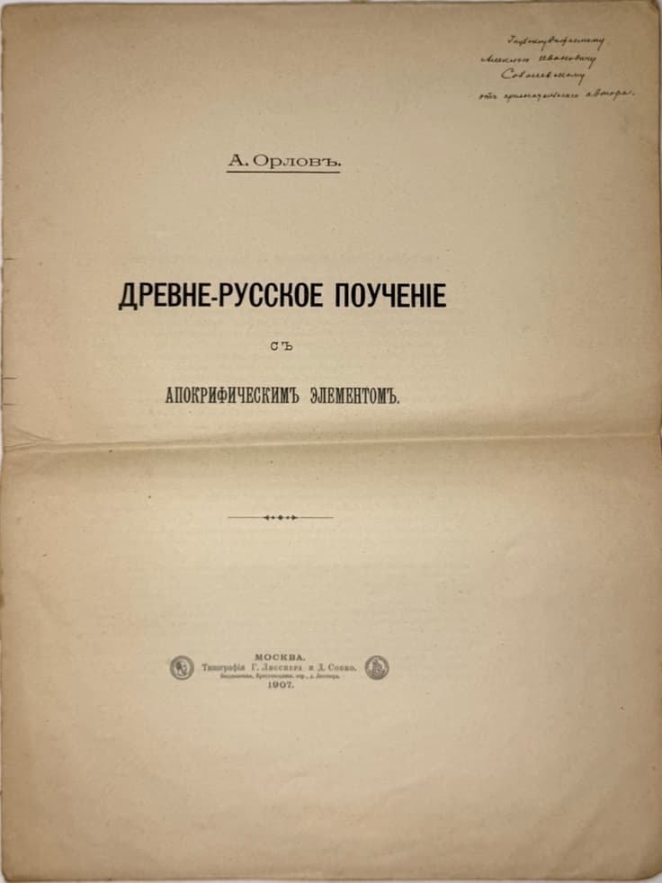ORLOV, A.S. (1871-1947), AUTOGRAPH Drevne-russkoe pouchenie s apokrificheskim elementom. [Ancient Russian teaching with apocryphal elements.] Moscow: tip. G. Lissnera i D. Sobko, 1907. – [1], 18 p.; 36x27 cm.