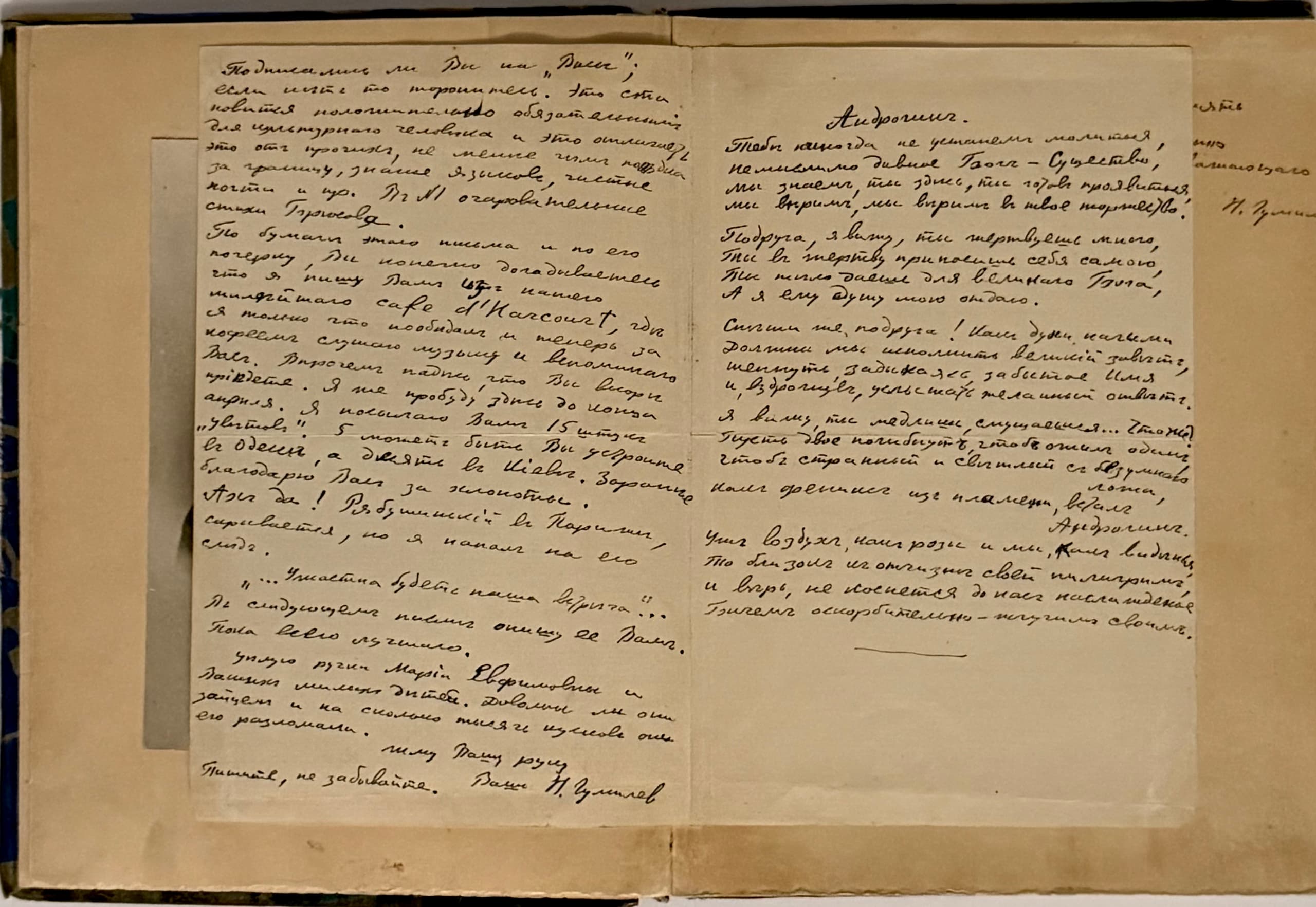 A double sheet with the poet’s handwritten autograph is pasted in front of the frontispiece on [4] p.: a letter addressed to M.V. Farmakovsky, followed by two poems, “Androgynous” and “Possessed.” Undated, presumably written from Paris in March 1908.