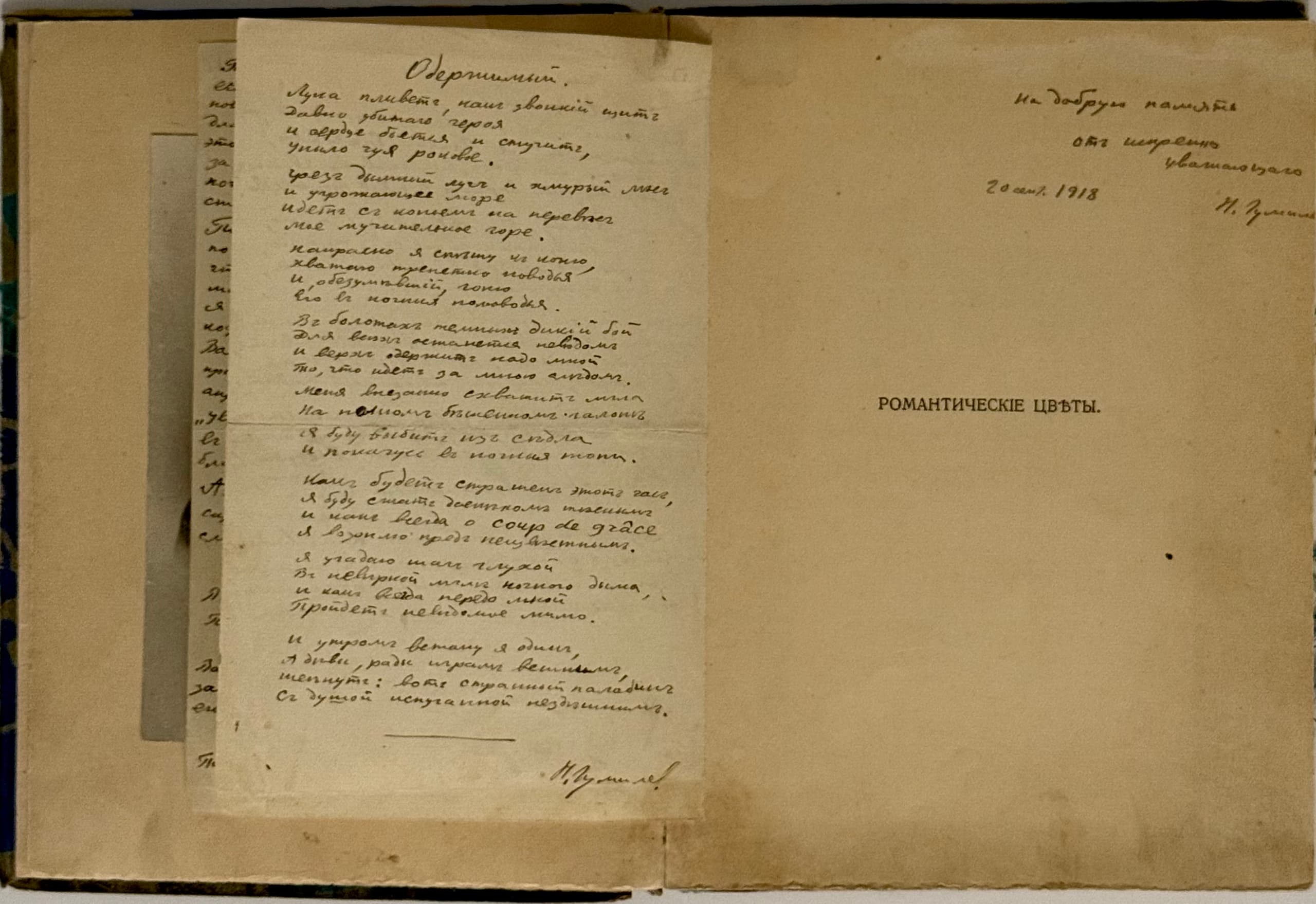 GUMILEV NIKOLAI (1886-1921), UNIQUE AUTOGRAPH Letter to M.V. Farmakovsky, two poems, dedication inscription. [Paris, 1908. St. Petersburg, 1918]. Romanticheskie tsvety: Stikhi. [Romantic Flowers: Poems.] 1903-1907. 3rd ed. St. Petersburg: Kn-vo “Prometei” N.N. Mikhailova, 1918.