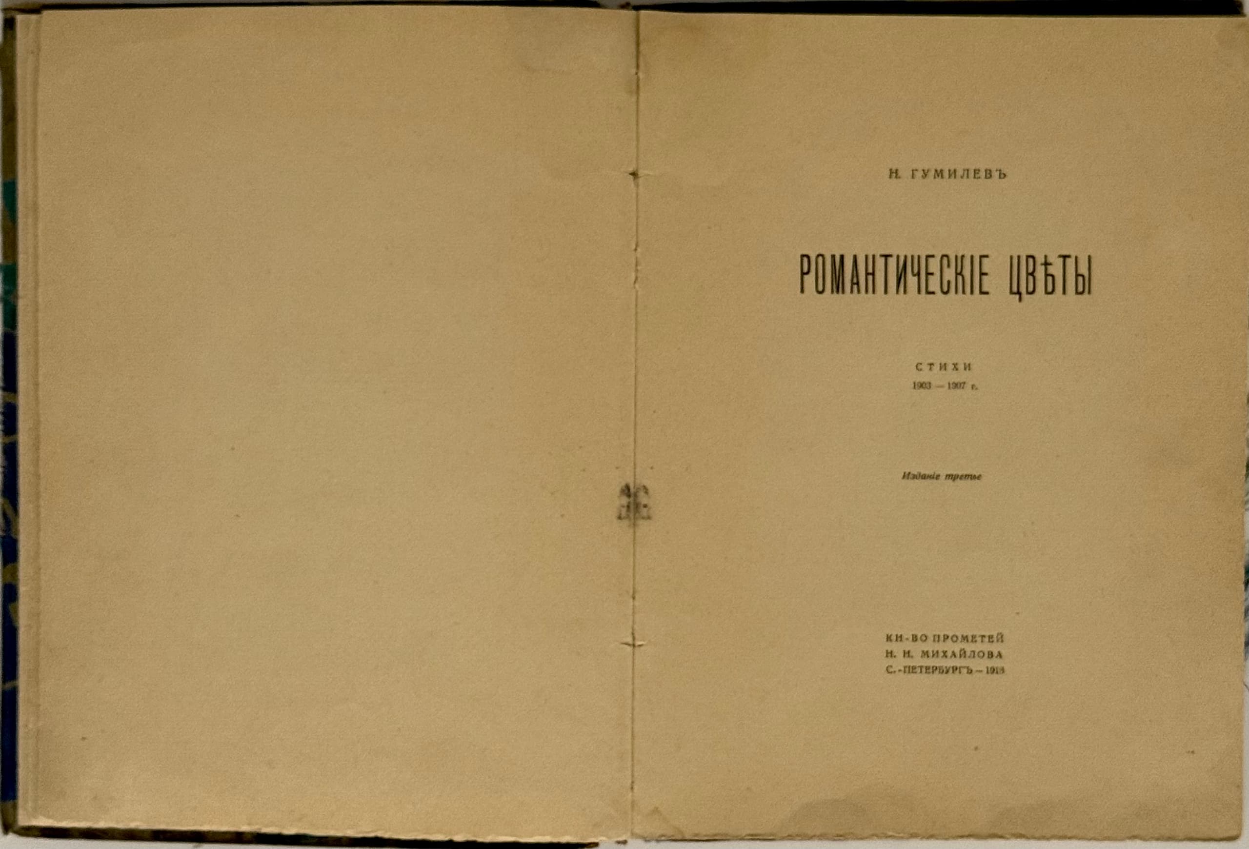 The poet’s dedication on the flyleaf, the name of the addressee has been erased: ‘na dobruiu pamiat’ ot iskrenno uvazhaiushchego N. Gumileva / 20 sent. 1918’ [“In fond memory from your sincerely respectful N. Gumilev / Sept. 20, 1918.”]
