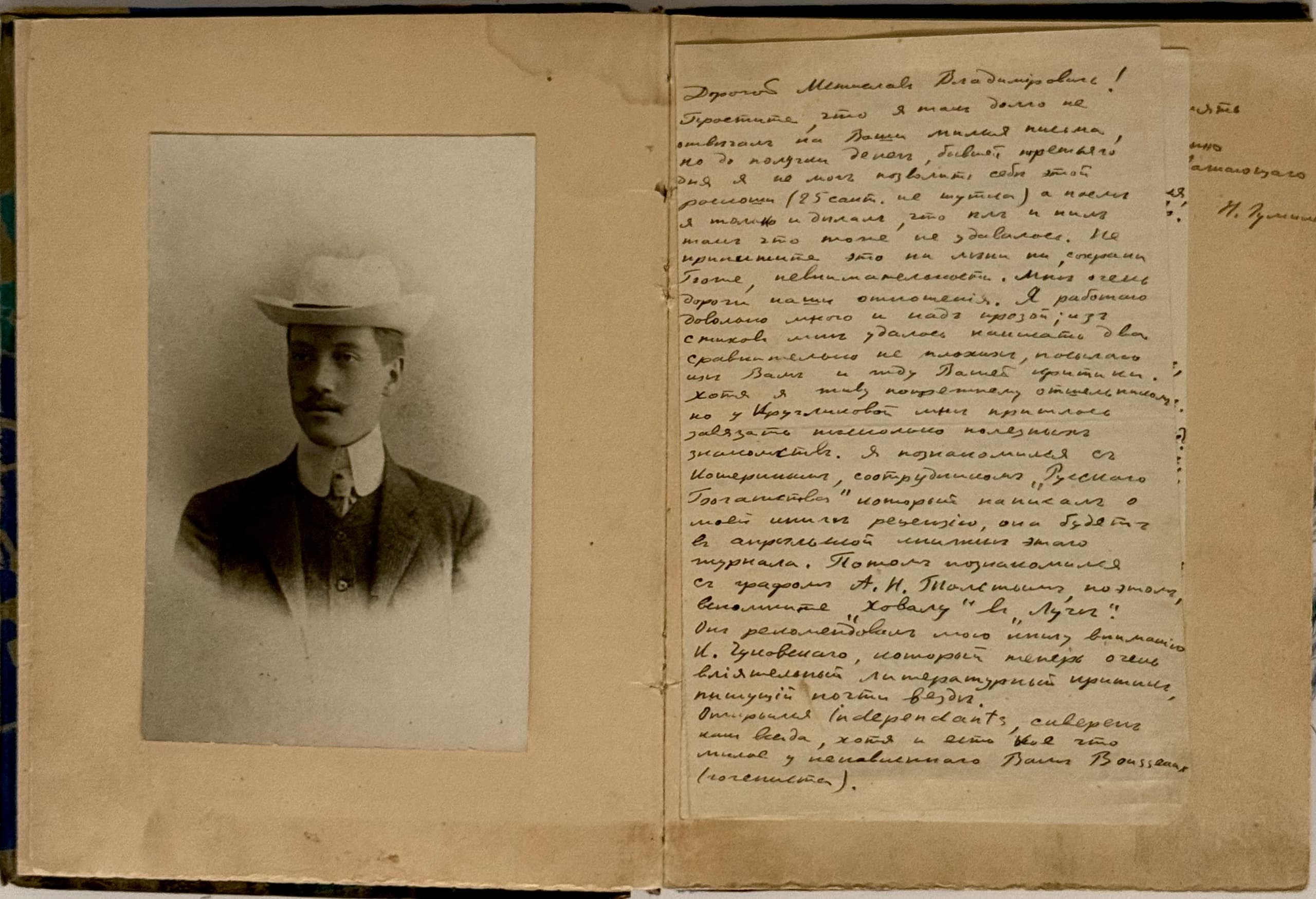 ‘Dorogoi Mstislav Vladimirovich! Prostite, chto ya tak dolgo ne otvechal na Vashi milye pis’ma, no do poluchki deneg byvshei tret’ego dnya ya ne mog pozvolit’ sebe etoi roskoshi (25 sant. ne shutka), a posle ya tol’ko i delal, chto el i pil, tak chto tozhe ne udavalos’...