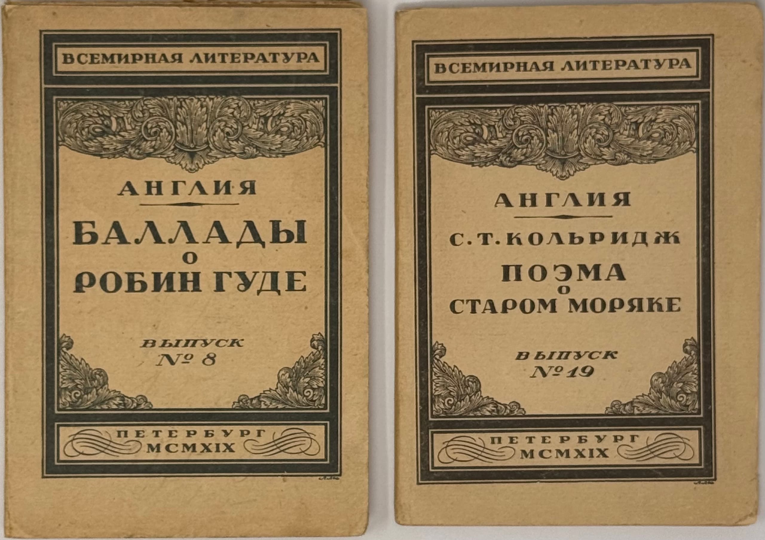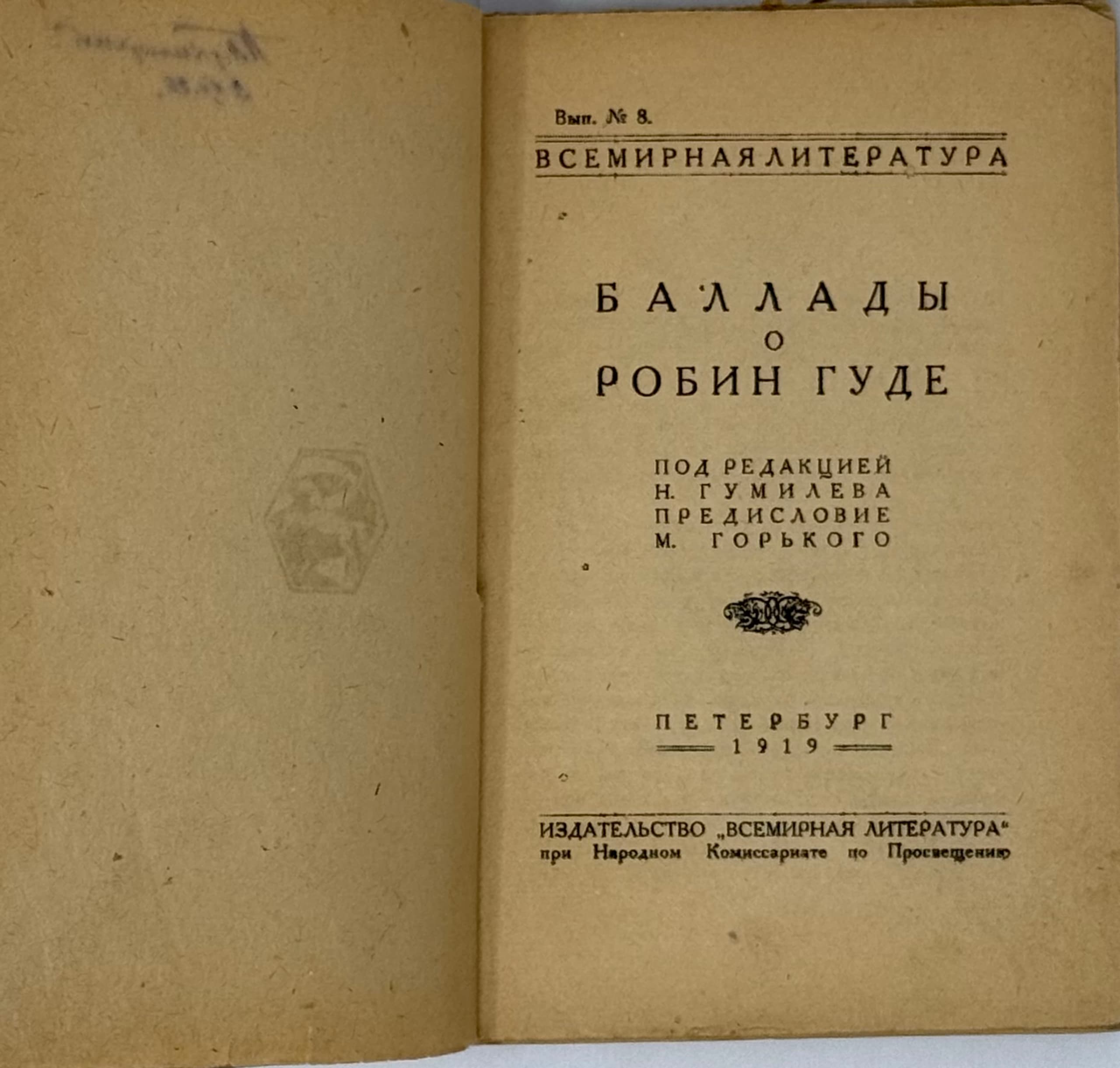 Ballady o Robin Gude [Ballads of Robin Hood]; edited by N. Gumilev, preface by M. Gorky. St. Petersburg, 1919.