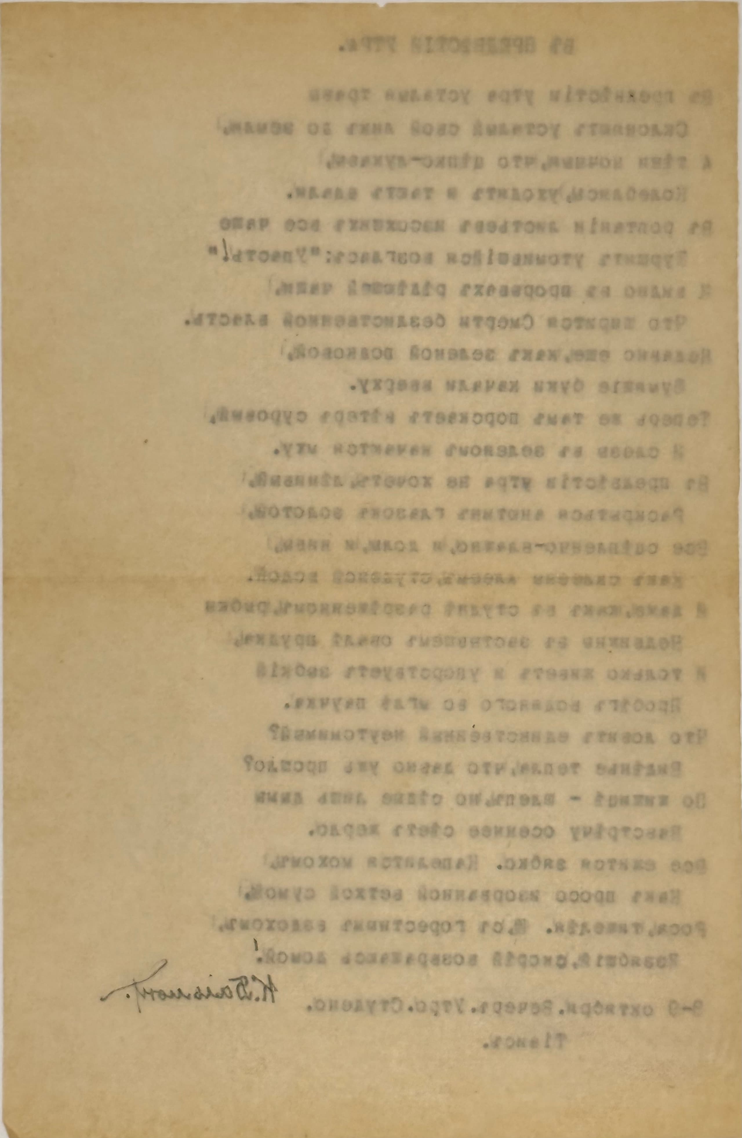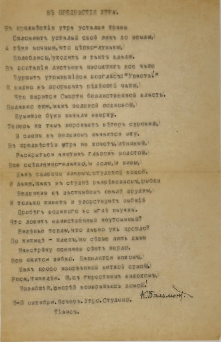 Typescript, 1 p. 21x14 cm. Dated at the end of the text: “October 8-9. Evening. Morning. Glacial. / Tiais,” as well as K. Balmont’s autograph signature. Author’s corrections in several places in the text.