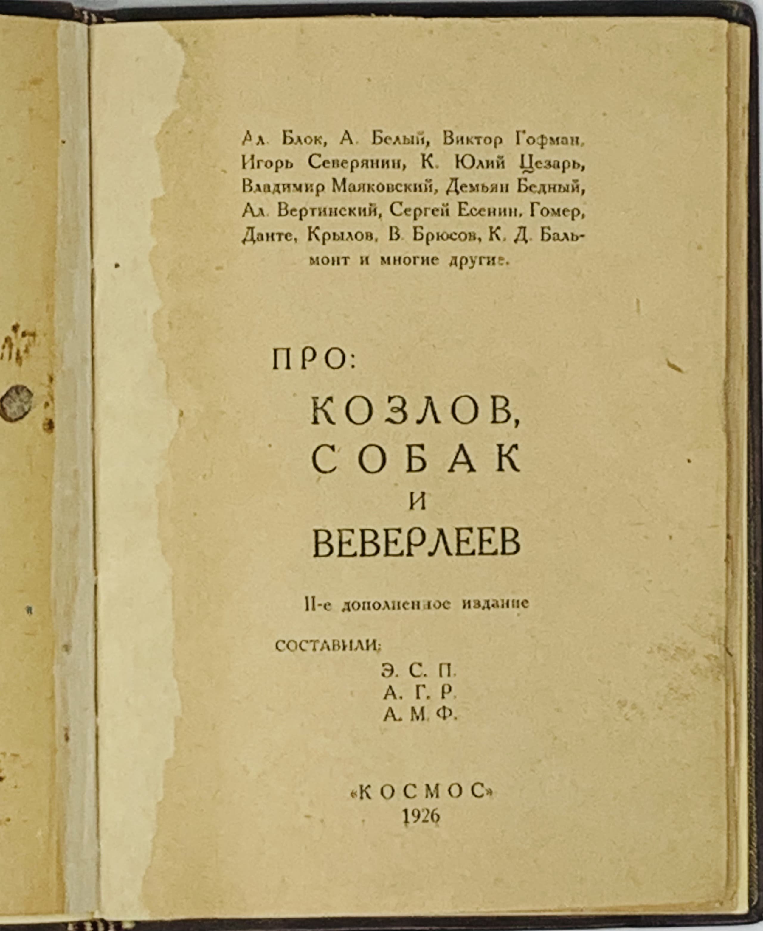 PARNAS DYBOM: Pro kozlov, sobak i Veverleev [Parnassus Upside Down: About Goats, Dogs, and Weverleys] (Literary Parodies); Compiled by E.S.P[apernaya], A.G.R[ozenberg], and A.M.F[inkel]. – 2nd expanded edition. Kharkov: Kosmos, 1926.