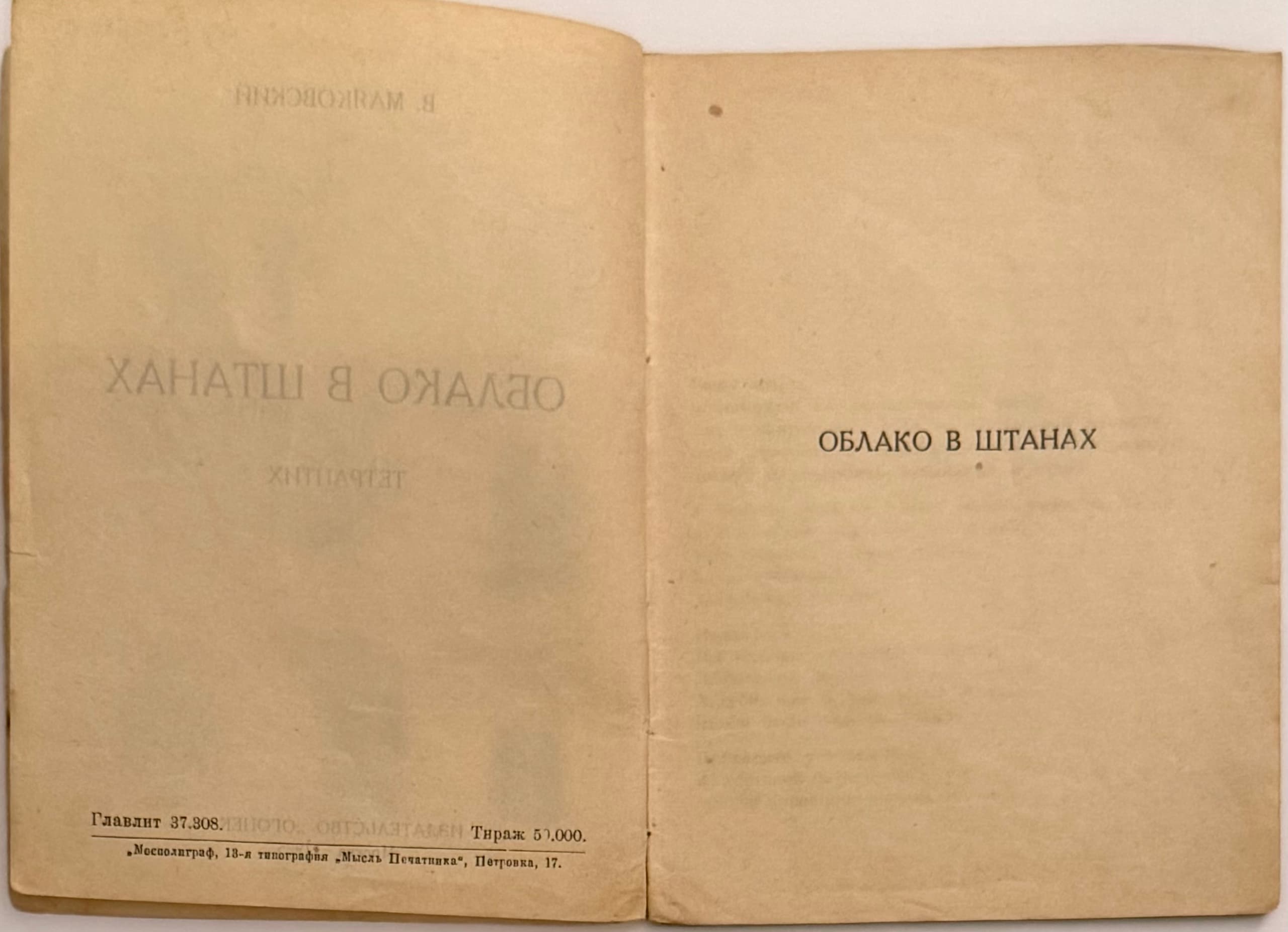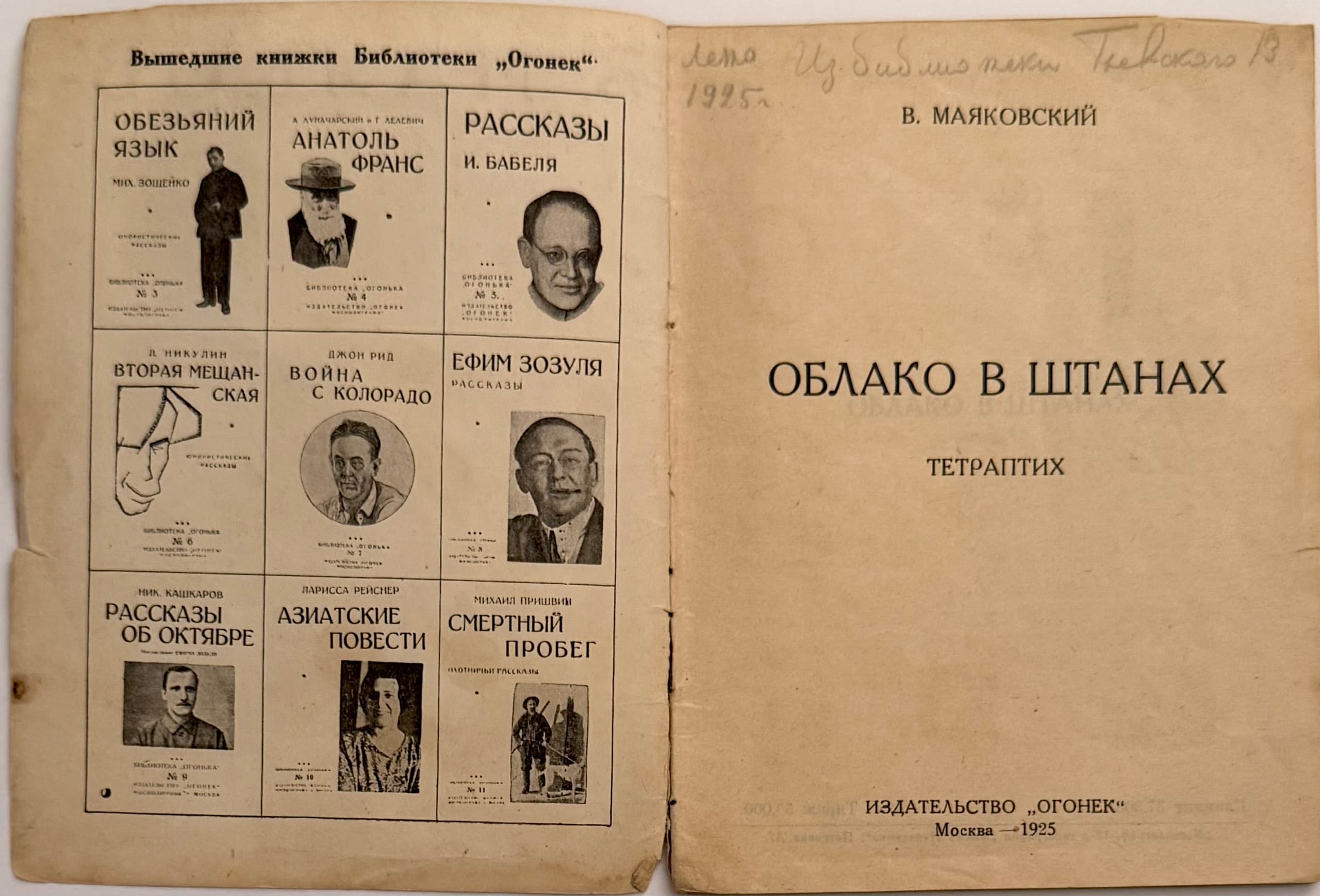 MAYAKOVSKY VLADIMIR (1893-1930) Oblako v shtanakh: Tetraptikh [A Cloud in Trousers: Tetraptych] [poem]. Moscow: Ogonyok, 1925.