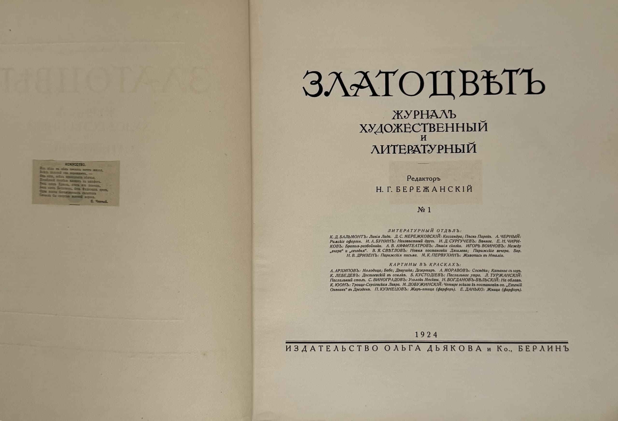 ZLATOTSVET. No. 1 [and only] Zhurnal khudozhestvennyy i literaturnyy [Art and literary magazine]; ed. N.G. Berezhansky. Berlin:Izd-vo Olʹgi Dʹyakovoy, 1924.