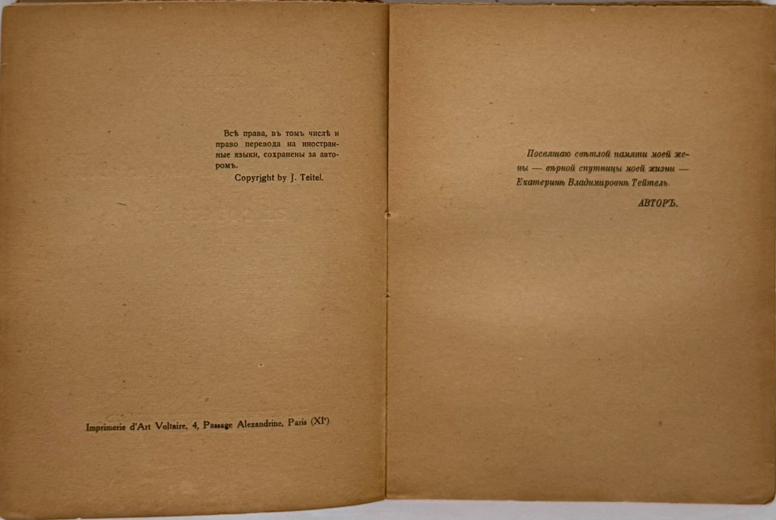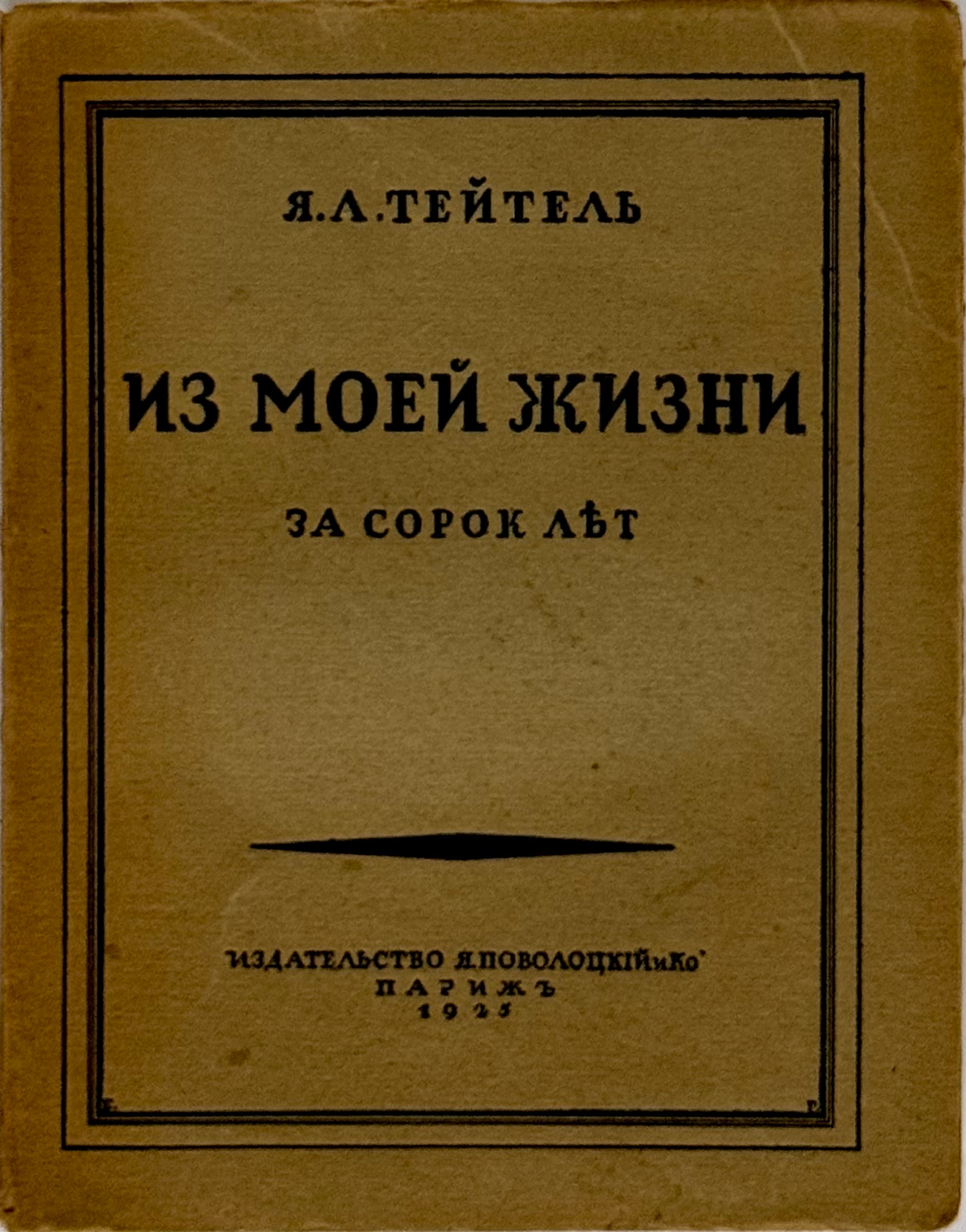 TEITEL JAKOV (1850-1939) Iz moey zhizni za sorok let. [From My Life Over Forty Years.] Paris: Published by Y. Povolotsky and Co., 1925.