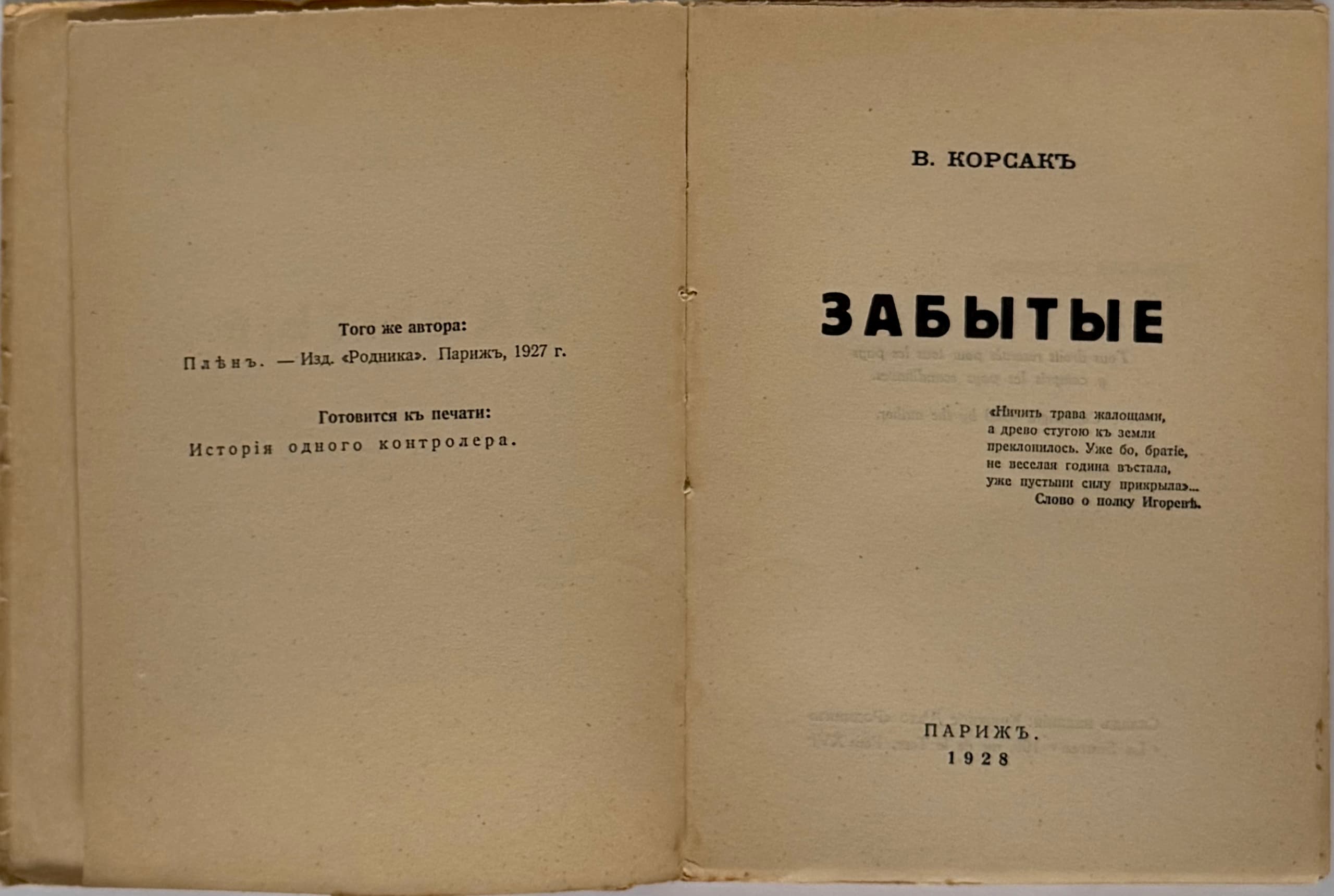 KORSAK VENIAMIN (1884–1944) Zabytye. [The Forgotten]. Paris: [Rodnik], 1928.