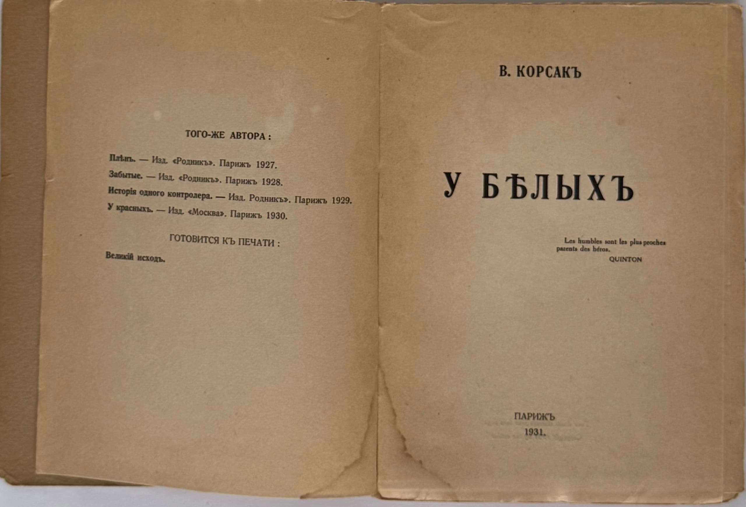 KORSAC VENIAMIN (1884-1944) U belykh. Paris: [Author’s edition], Imp. “Pascal,” 1931.