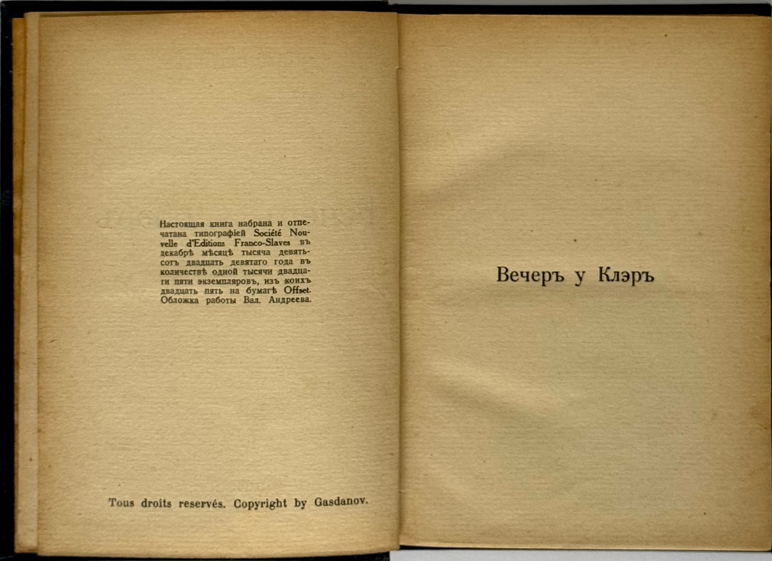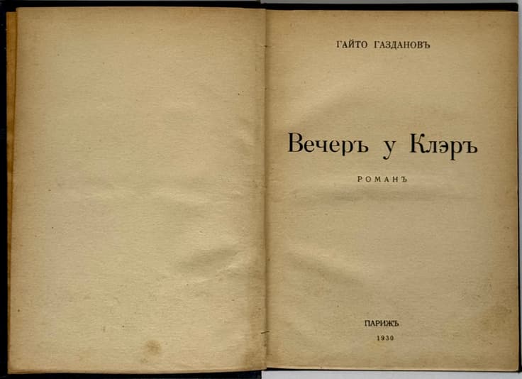 GAZDANOV GAITO (1902-1971) Vecher u Kler: roman [An Evening at Claire’s: a novel.] Paris: Biblioteka “Sovremennye pisateli”), 1930.