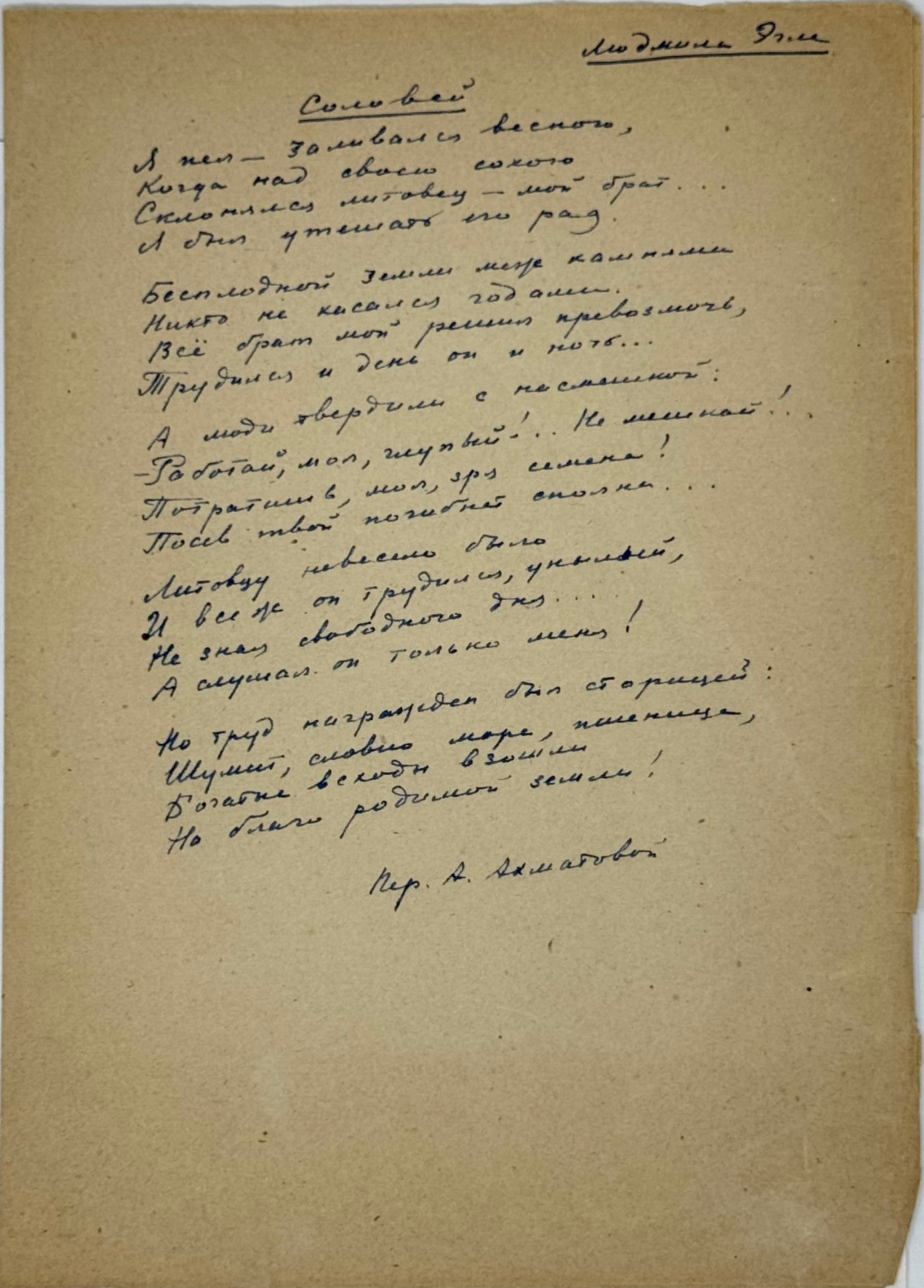 AKHMATOVA ANNA ANDREYEVNA (1889–1966), AUTOGRAPH The manuscript of the translation of the poem 'Solovey' [The Nightingale] by Lyudmila Egle. 1960. At the end of the text in Cyrillic: 'Per. A. Akhmatova.'