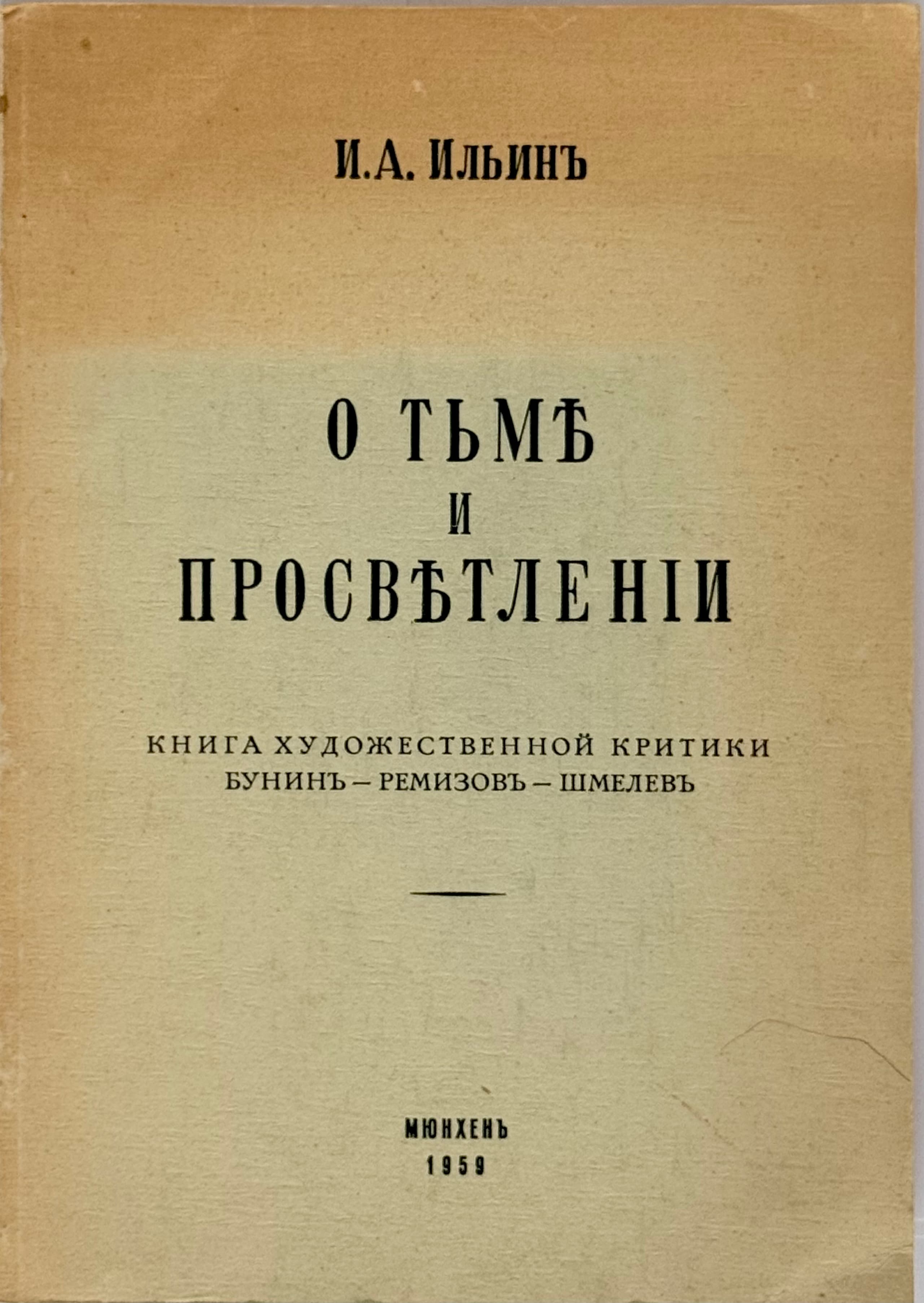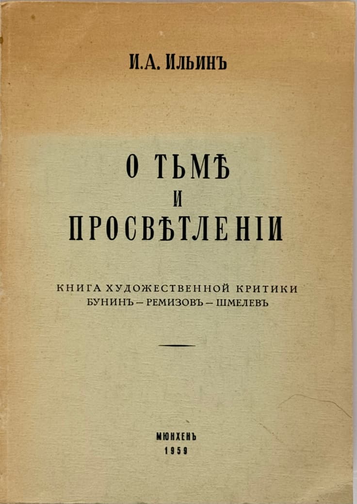 ILYIN IVAN (1883-1954) O t’me i prosvetlenii: Kniga khudozhestvennoi kritiki. Bunin – Remizov – Shmelev. [On Darkness and Enlightenment: A Book of Art Criticism.] Munich: [Printed by the Monastery of St. Job of Pochaev], 1959. First edition.